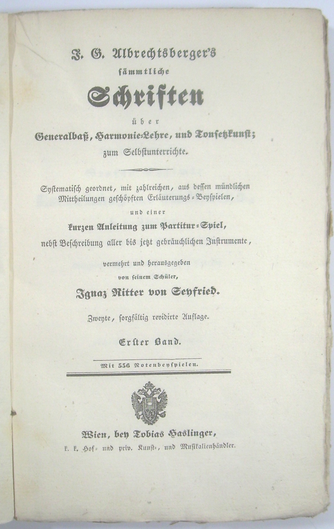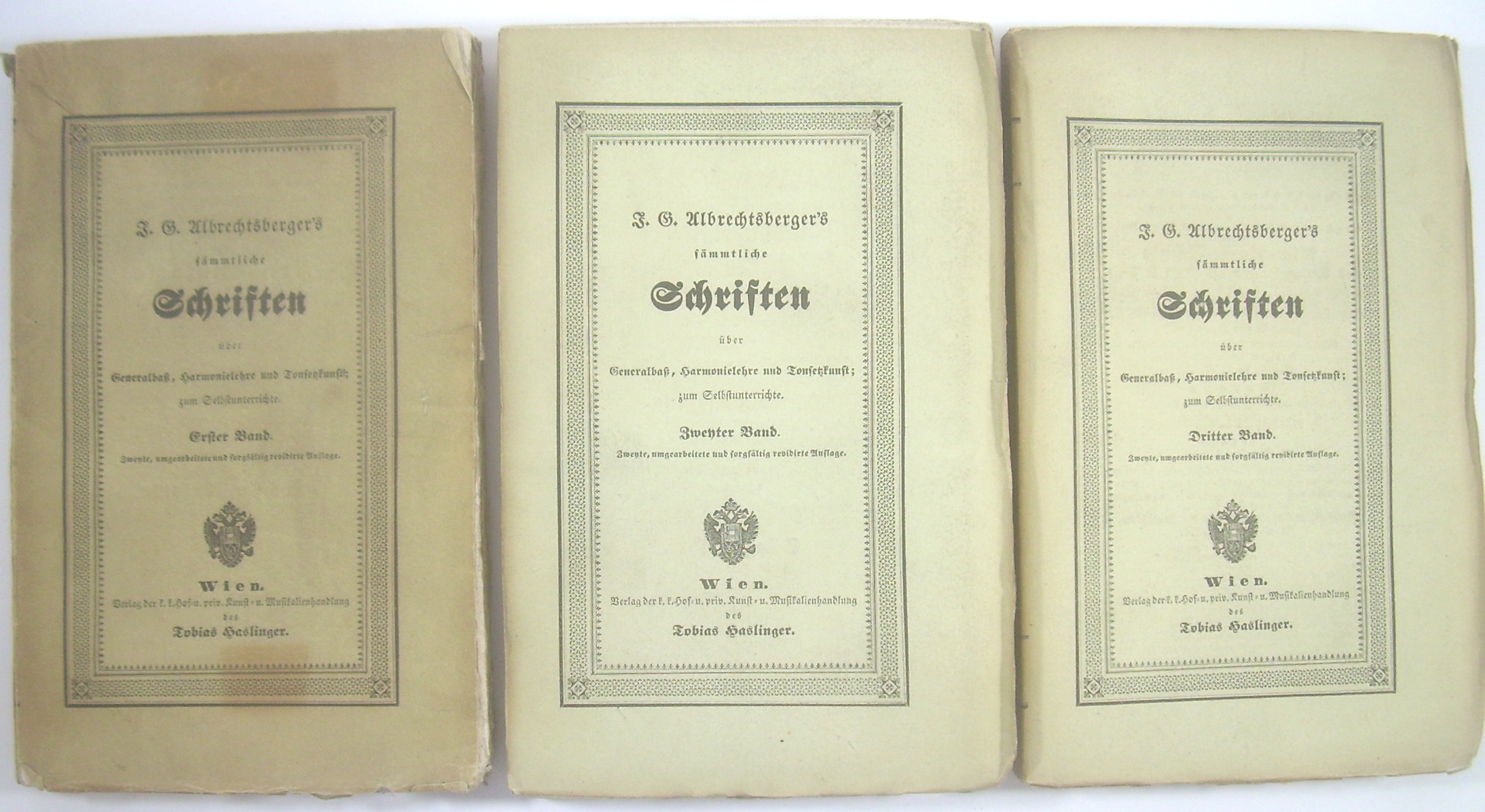"J. G. Albrechtsberger's sämmtliche Schriften über Generalbaß, Harmonie-Lehre, und Tonsetzkunst; zum Selbstunterrichte. Systematisch geordnet, mit zahlreichen, aus dessen mündlichen Mittheilungen geschöpften Erläuterungs-Beyspielen, und einer kurzen Anleitung zum Partitur-Spiel nebst Beschreibung aller bis jetzt gebräuchlichen Instrumente, vermehrt und herausgegeben von seinem Schüler, Ignaz Ritter von Seyfried. Zweyte, sorgfältig revidirte Auflage. - 3 Bände, nicht aufgeschnitten (!)"