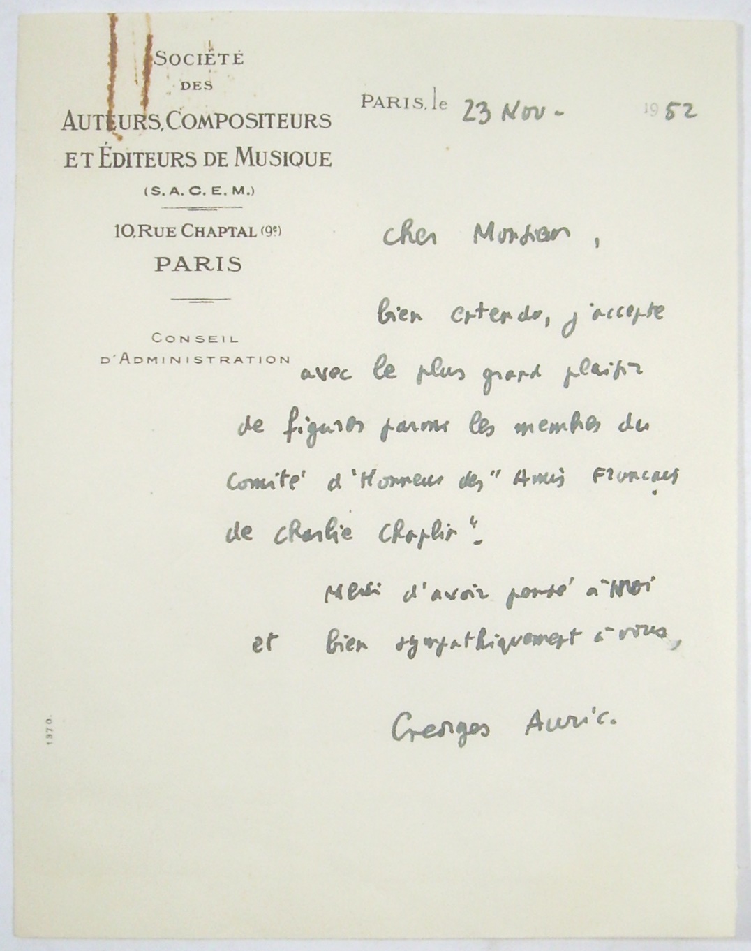 "Paris, le 23. Nov. 1952: ""Bien entendu, j'accepte avec le plus grand plaisir de figurer parmi les membres du comité d'honneur des 'Amis français de Charlie Chaplin'. Merci d'avoir pensé à moi et bien sympathiquement à vous. Georges Auric."" - Charlie Chaplin (1889-1977), erster Weltstar des Kinos, britischer Staatsbürger. Während der McCarthy-Ära wurde ihm im September 1952 nach einem Auslandsaufenthalt wegen Verdachts kommunistischer Sympathien die Rückkehr in die USA verweigert. Erst 1972 reiste Chaplin wieder in die USA, um einen Ehrenoscar für sein Lebenswerk entgegenzunehmen. - Kurz nach dem Verbot der Wiedereinreise in die USA gründete der französische Dramatiker und Kritiker Claude Roger-Marx (1888-1977) zur Unterstützung von Chaplin die ""Amis Français de Charlie Chaplin"". - Georges Auric (1899-1983), französischer Komponist (Groupe des Six), arbeitete als Filmmusikkomponist oft mit Jean Cocteau zusammen, 1954-1978 Präsident der französischen Musikverwertungsgesellschaft SACEM. Auric bestätigt, daß er ""mit großer Freude"" Mitglied des Ehrenkomitees der ""Amis français de Charlie Chaplin"" wird."