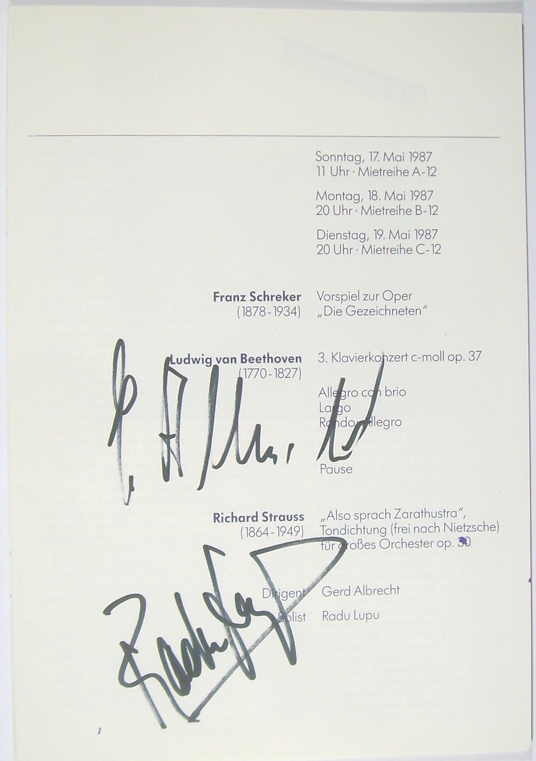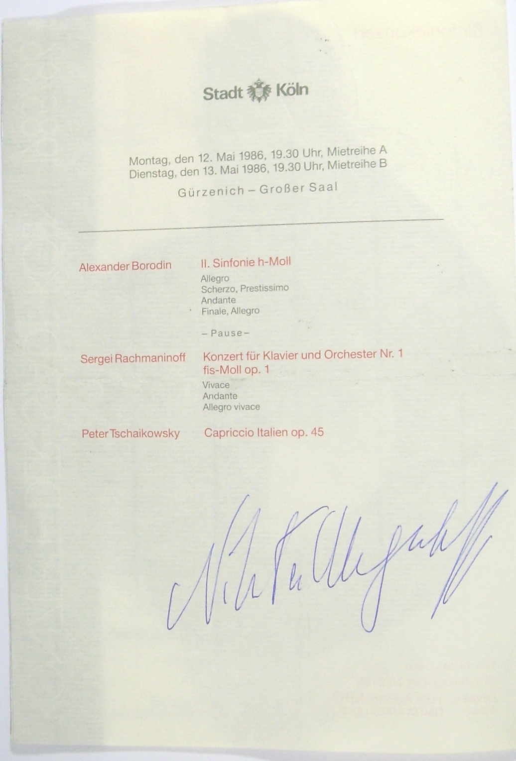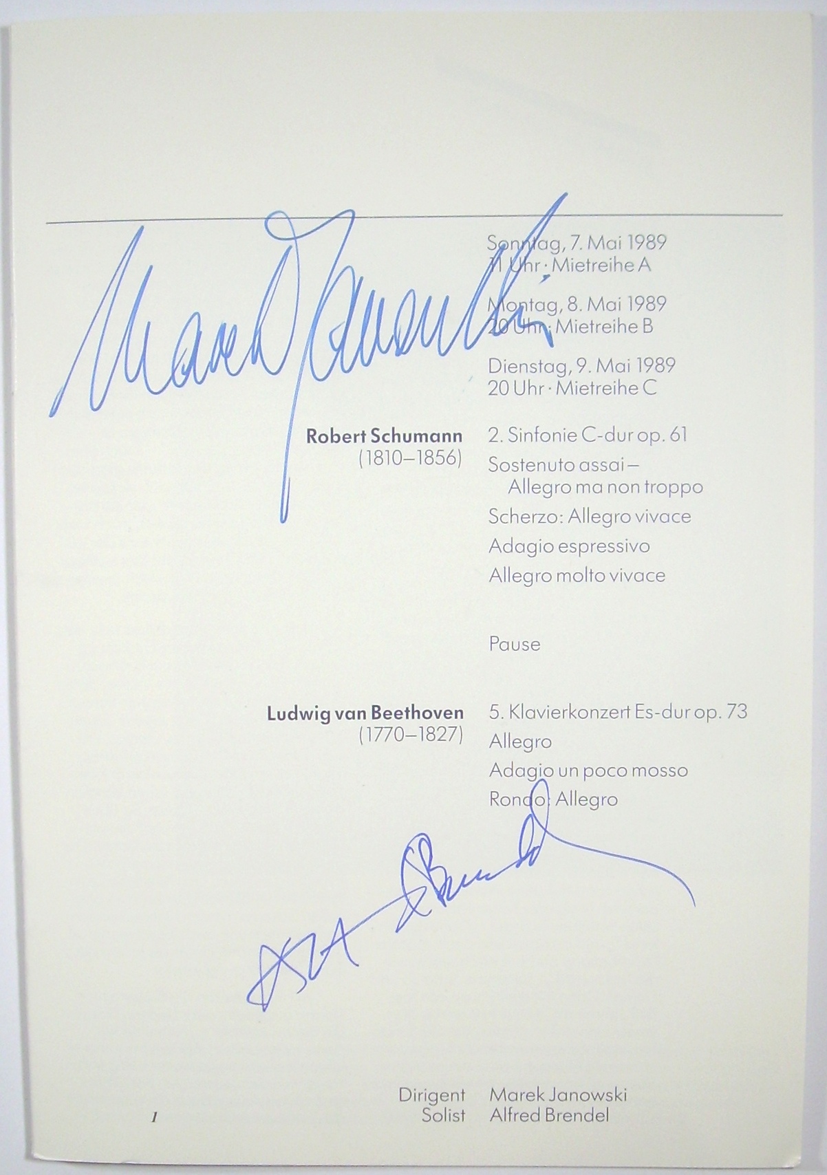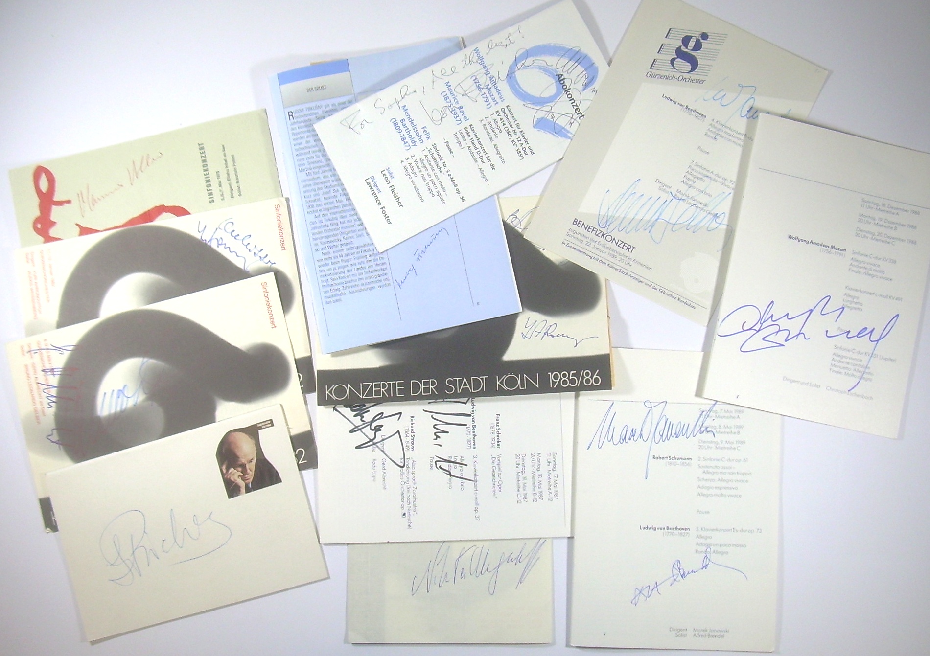 11 Pianisten - Autogramme auf Programmheften und Programmzetteln: Vladimir Ahkenazy, Alfred Brendel, Christoph Eschenbach, Rudolf Firkusny, Leon Fleisher, Bruno Leonardo Gelber, Radu Lupu, Nikita Magaloff, Maurizio Pollini, Swjatoslaw Richter, Alexis Weissenberg - Köln 1975-1997 und Salzburg 1972 (teilweise auch mit den Autogrammen Dirigenten der Konzerte).