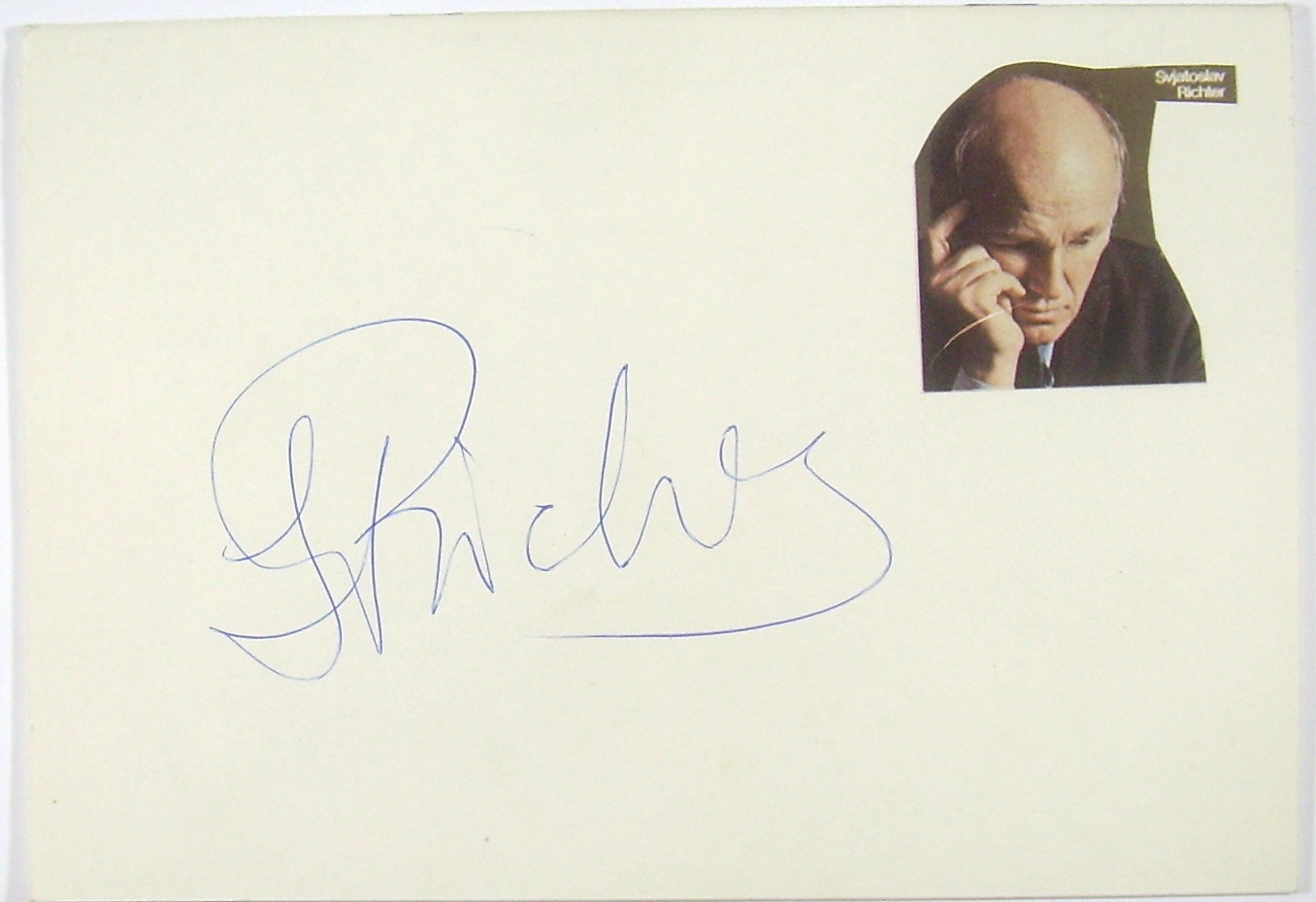 11 Programmhefte und -zettel mit zusammen 20 Signaturen, die Unterschriften im Programmheft oder auf dem Umschlag, die Signatur von Swjatoslaw Richter auf der Rückseite eines Programmheftes von den Salzburger Festspielen 1972 mit montiertem Porträt.