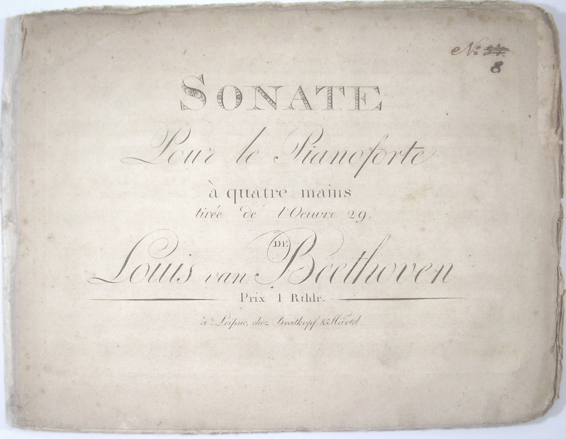 * Werkverzeichnis 2014 S. 175, nicht in RISM. - Seltene, fast zeitgleich mit der Originalausgabe erschienene Bearbeitung. KVK nur mit 3 Exemplaren (alle in D, kein Exemplar in Ö). - Die Originalausgabe des Streichquintetts op. 29 war im Dezember 1802 bei Breitkopf und Härtel erschienen (PN 94). Eine Woche danach annoncierte B&H bereits die vierhändige Bearbeitung der ersten 3 Sätze. Nach dem Druckbuch des Verlages ist der auf dem Titel nicht genannte Bearbeiter August Eberhard Müller (1767-1817), der spätere Thomaskantor und großherzogliche Kapellmeister in Weimar, der sich als Arrangeur und auch als Dirigent große Verdienste um die Pflege der Wiener Klassik erwarb (u.a. 1801 mit der ersten Aufführung von Haydns "Die Jahreszeiten" außerhalb von Wien).