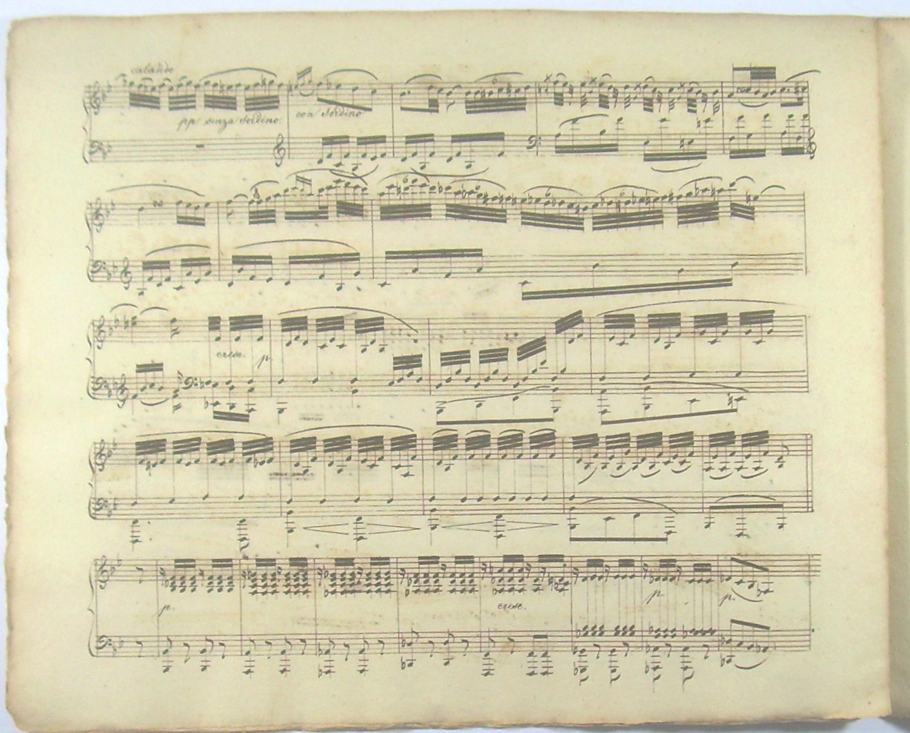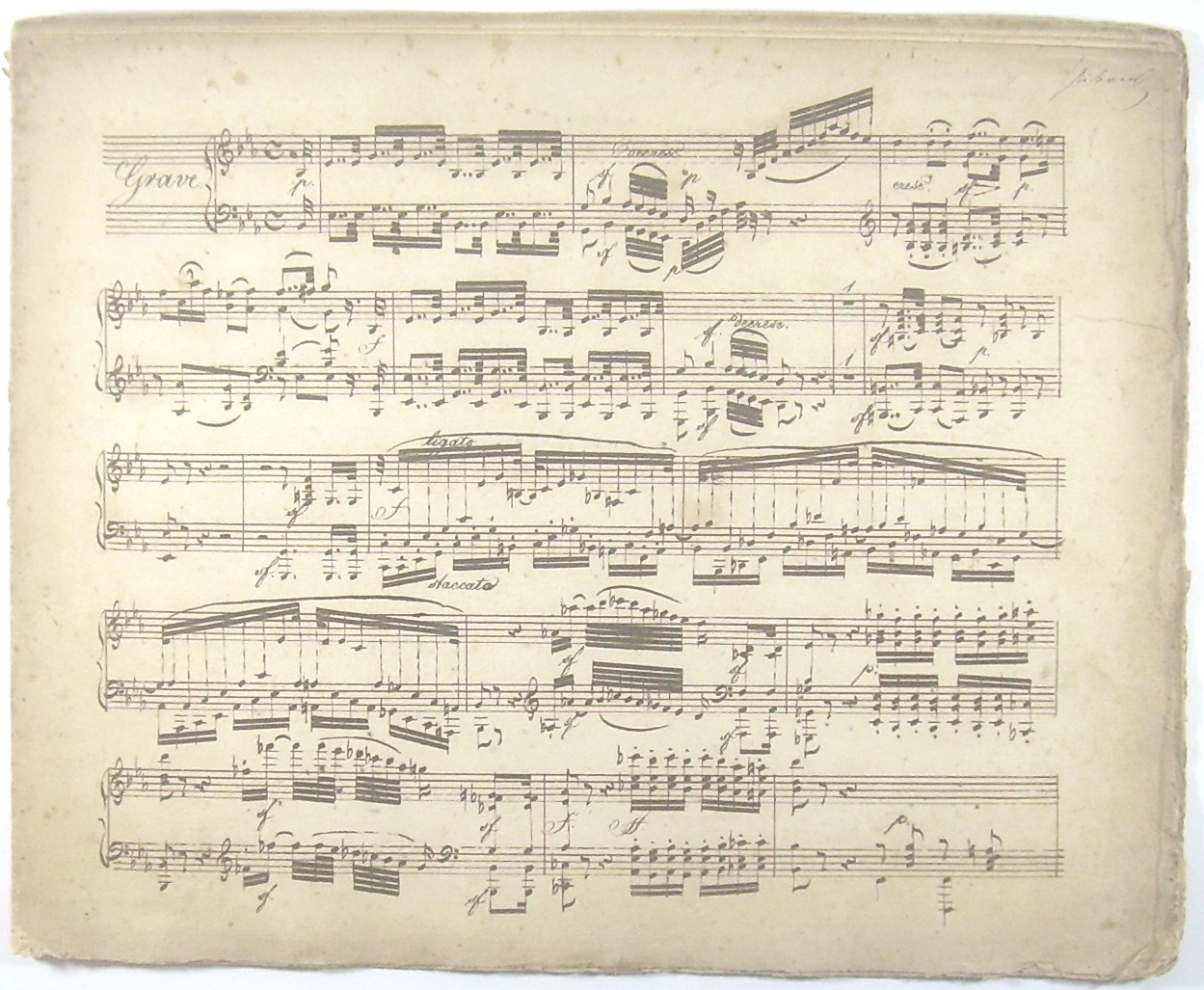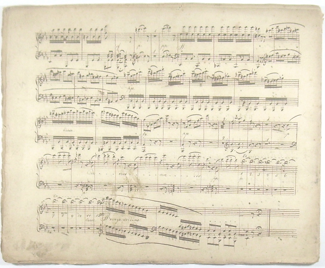 Querformat 28x35 cm, 20 Seiten auf 10 Doppelblättern, professionelle Handschrift auf 10-zeiligem Notenpapier (Bütte, ohne Wasserzeichen), unbeschnitten, ungebunden, Originalzustand, leicht fleckig und lichtrandig.