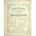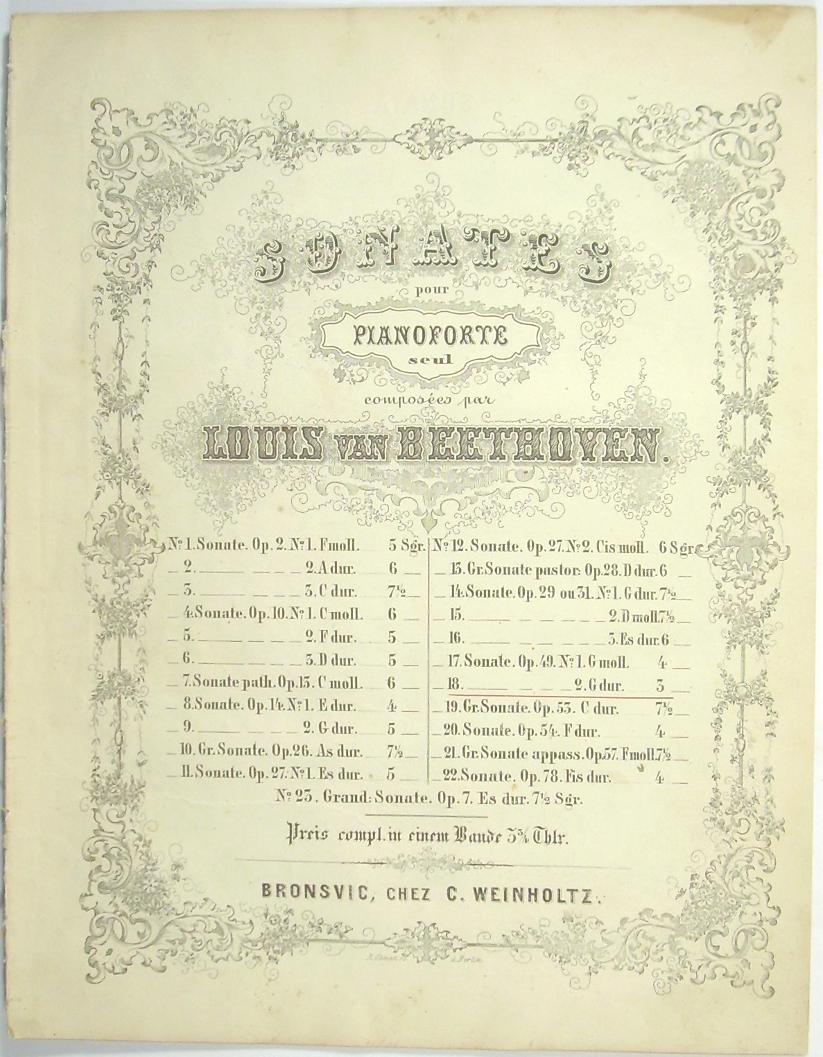 Datierung Weinholtz-Verlagsanzeige von 1854. Aus der Sonatenausgabe in 1 Band (23 Sonaten) von 1854. Die Sonaten wurden auch einzeln verkauft, der Reihentitel mit Auflistung und Preisangaben.