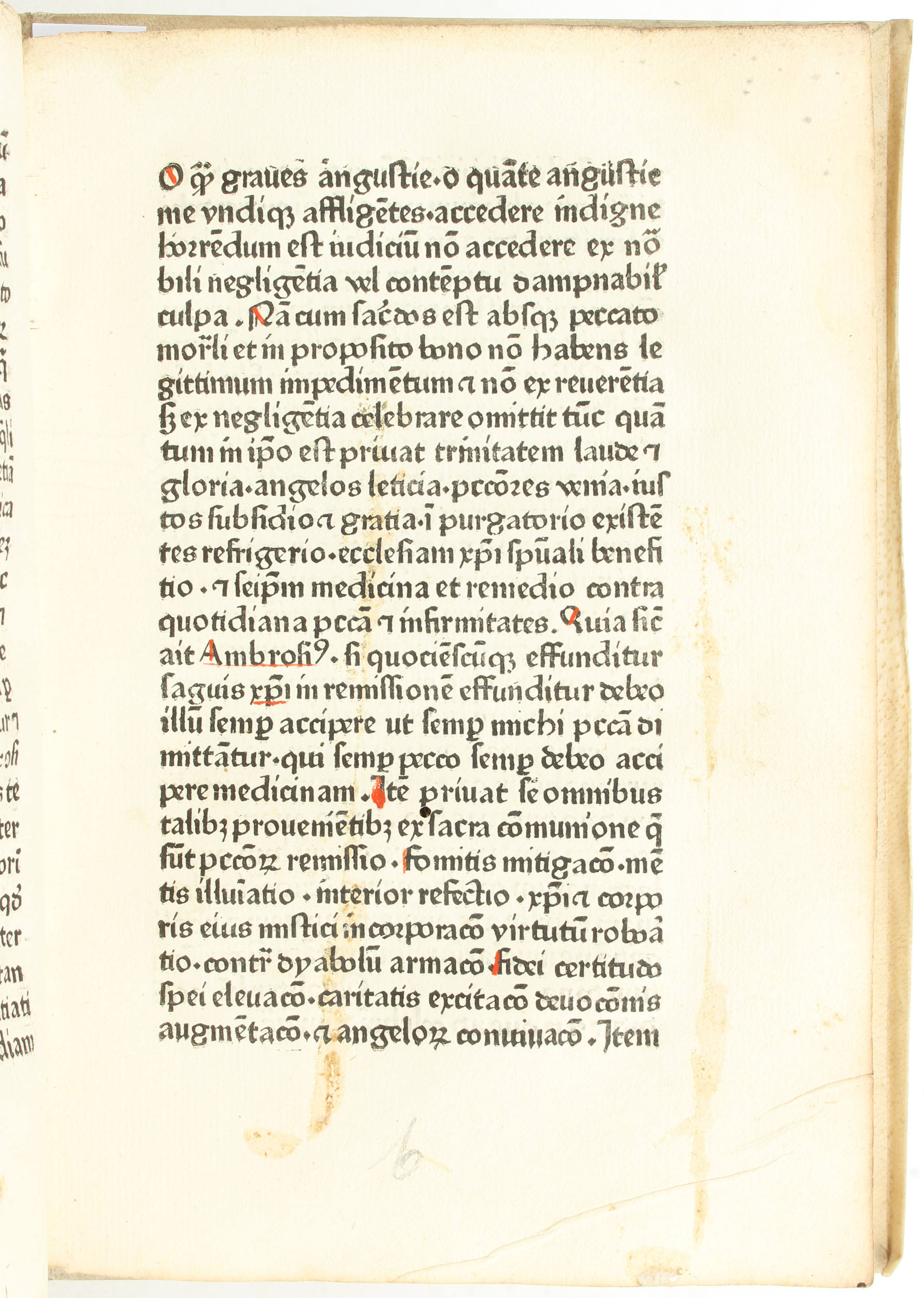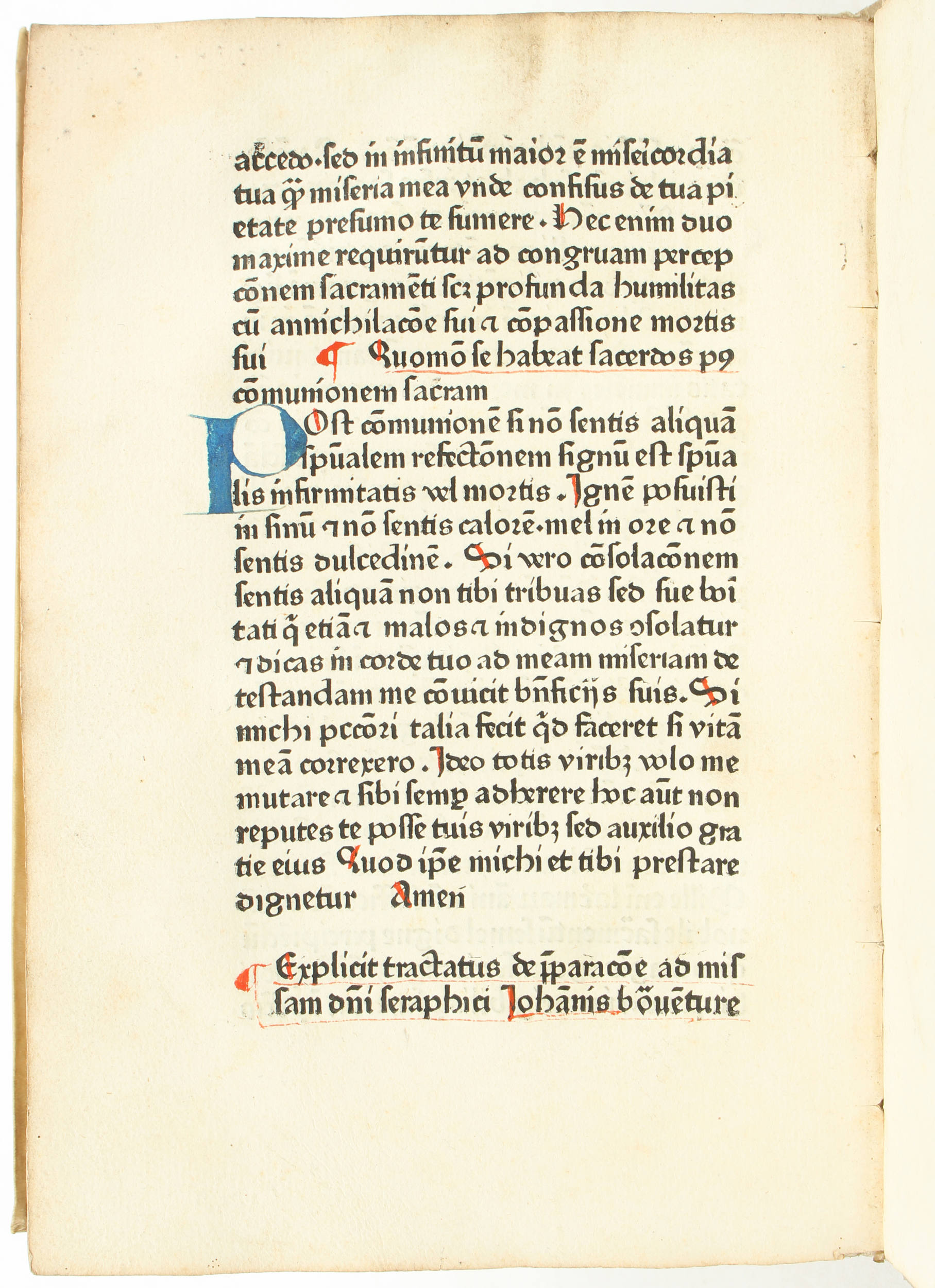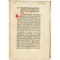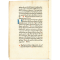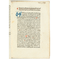 "4to (21,5x15 cm). 48 nn. Bll. (Lagenzählung a - f8), d. l. w. Got. Typ. 26 Zeilen. Rubriziert, mit Lombarden in Rot und Blau. Neuerer Pergamenteinband, Buchblock angebrochen. Vereinzelt fleckig, teilweise mit kleinem Wasserfleck im äußersten Fußsteg; durchgehend mit 1-2 Wurmstichen im Satzspiegel, stellenweise mit feinen Wurmspuren im Bundsteg; alte Lagenbezeichnung in Tinte, meist abgeschnitten, 2 kleine Einträge in Tinte . - Bookplate J. R. Ritman (""Philosophia hermetica"")."