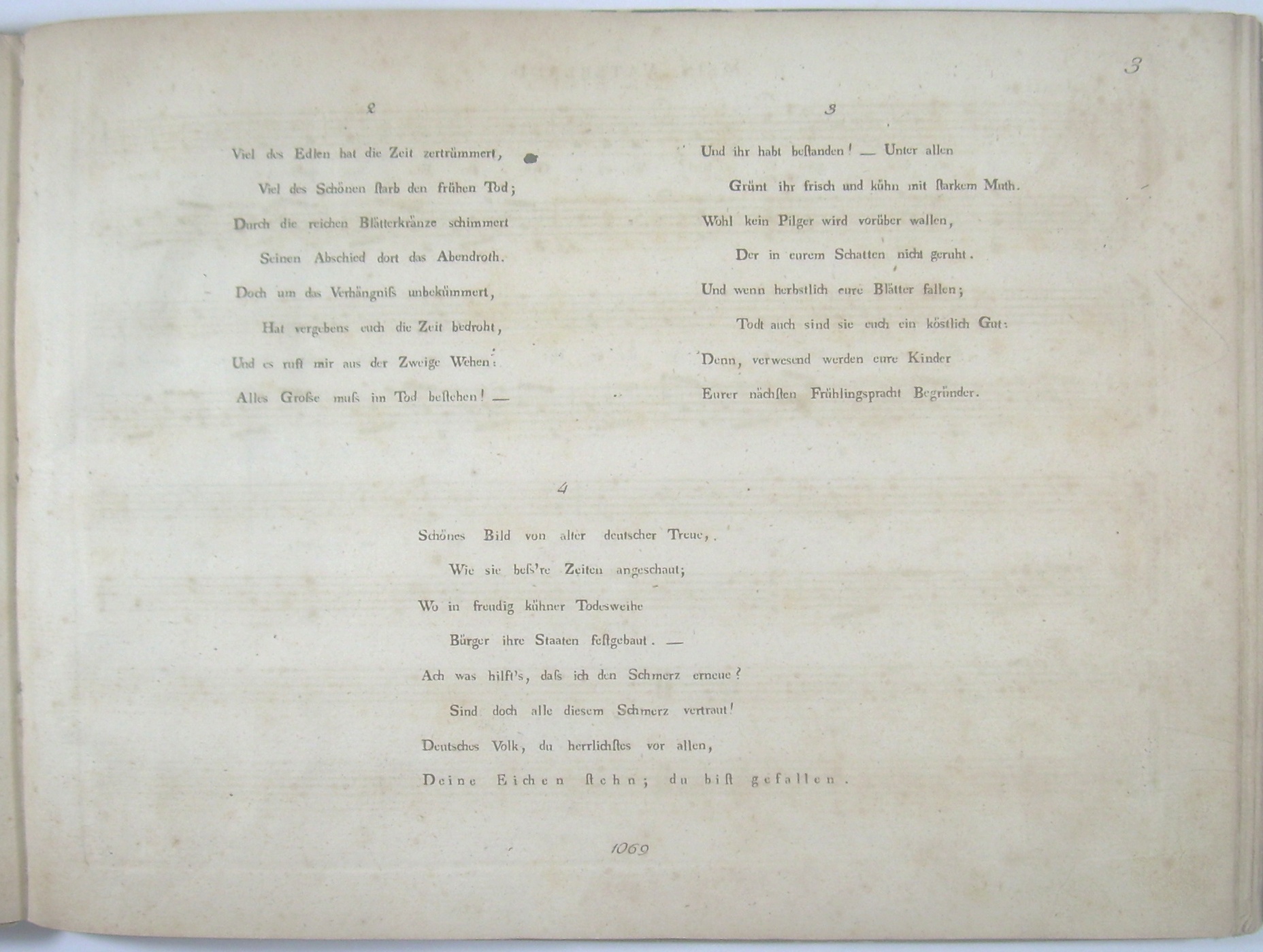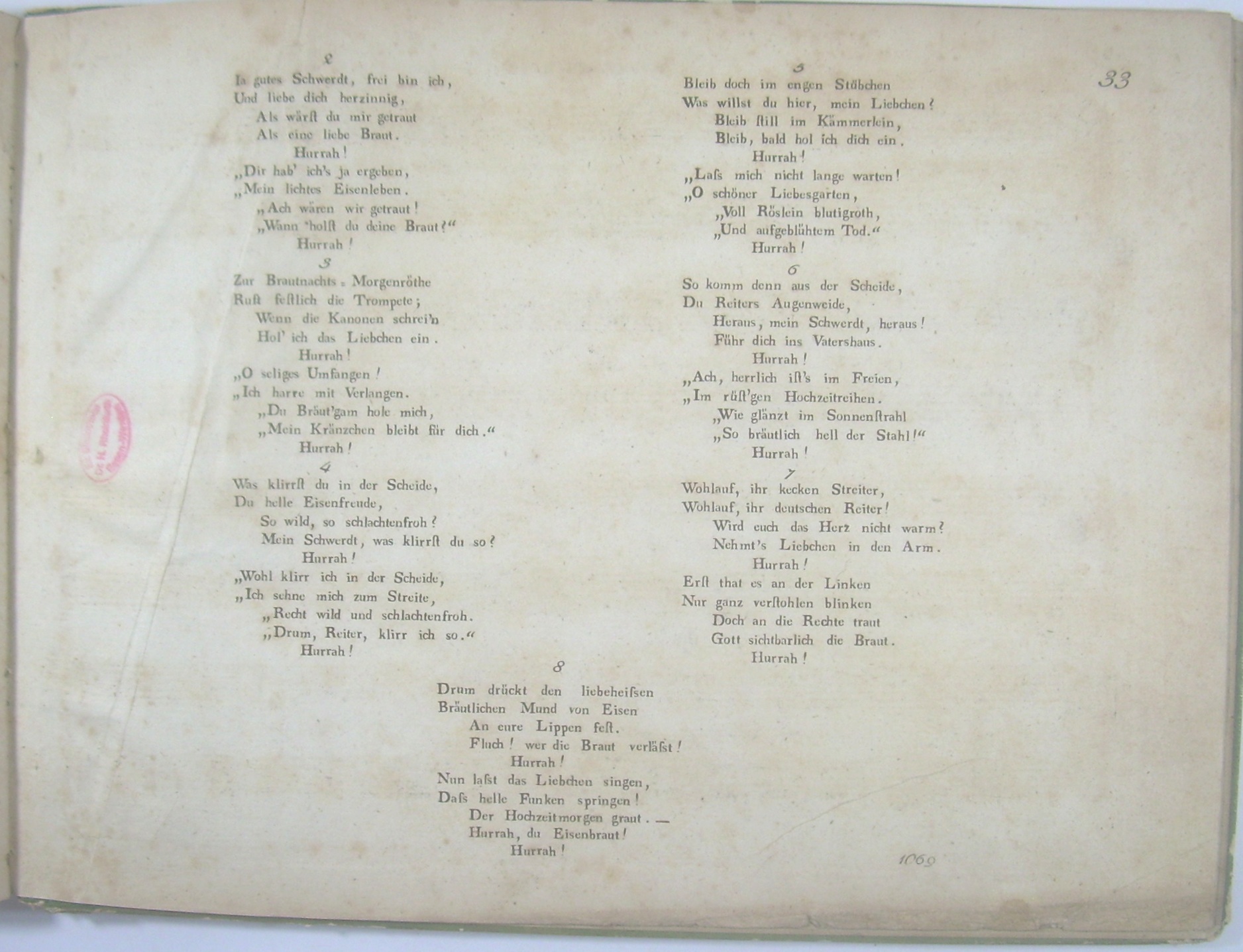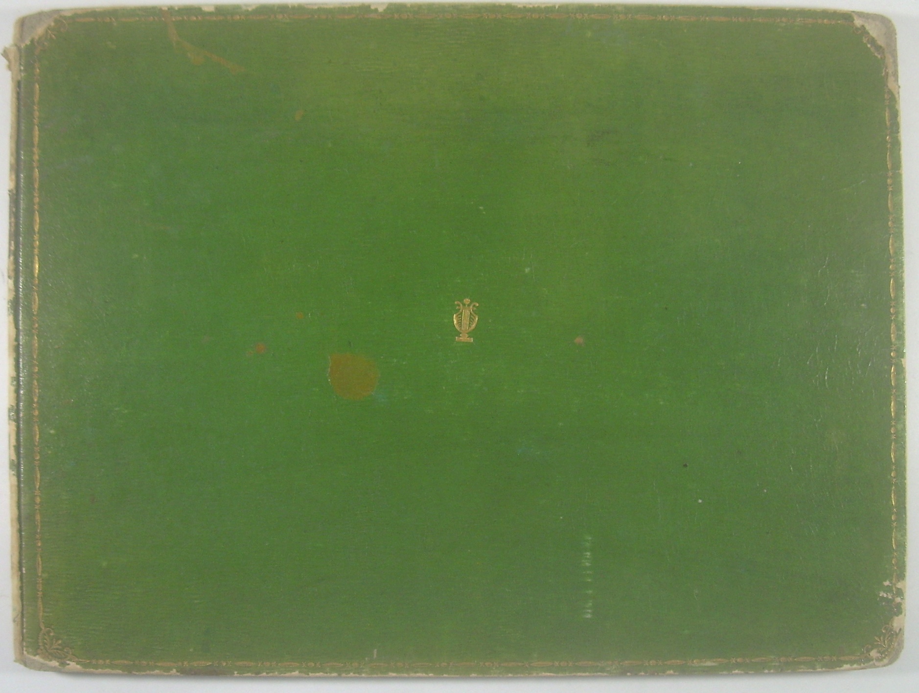 Querformat 24x32 cm, 33 Seiten, gestochen, Titelkupfer: Lyra mit Schwert in Scheide und Kranz, darunter "Das uns, berauscht, die Leyer vorgesungen Hat nun des Schwertes freie That errungen." Grüner Pappband der Zeit mit Goldbordüre und geprägter goldener Leier, Einband berieben und bestoßen, Rücken mit Verlust des Überzugspapiers. Innendeckel mit Namenszug "Lutteroth". Letzte Seite mit Sammlerstempel "Rheinfurth".