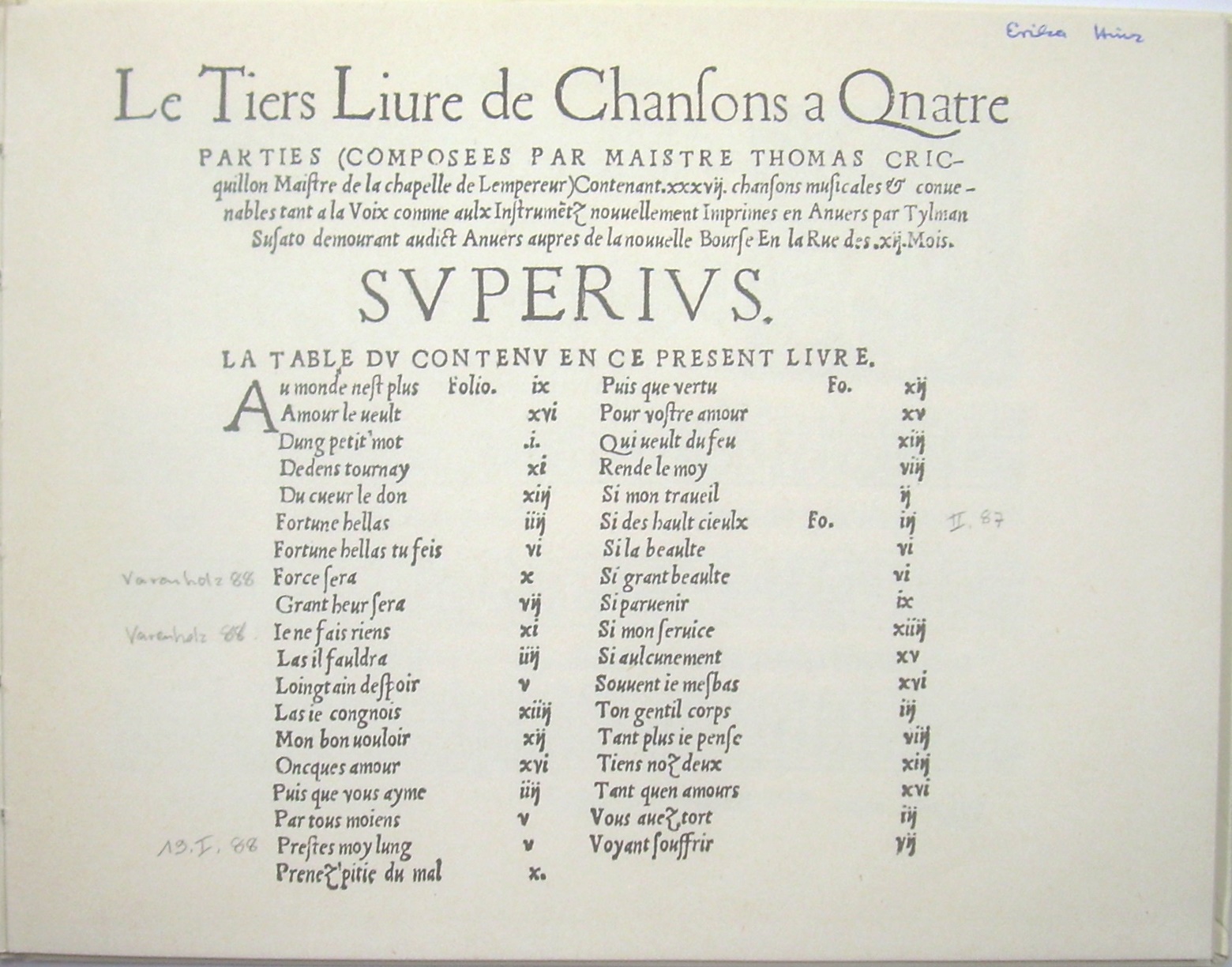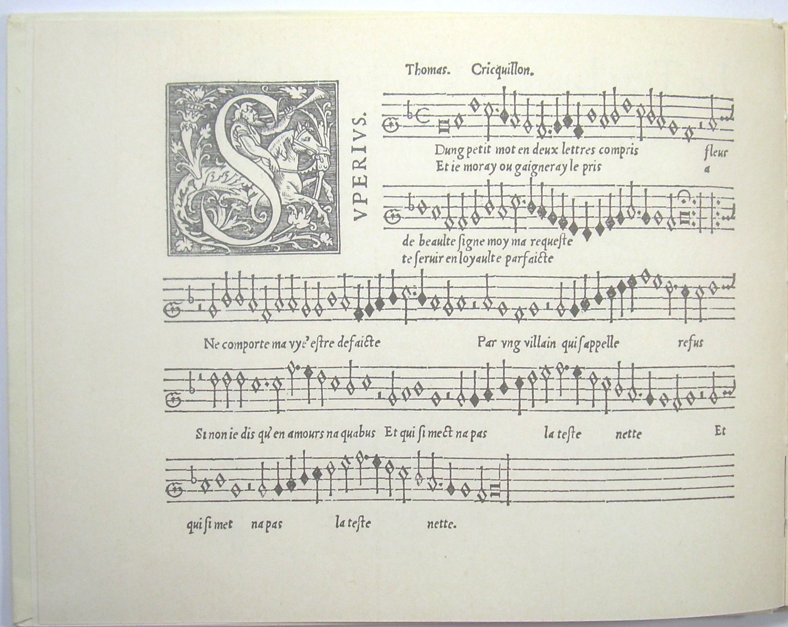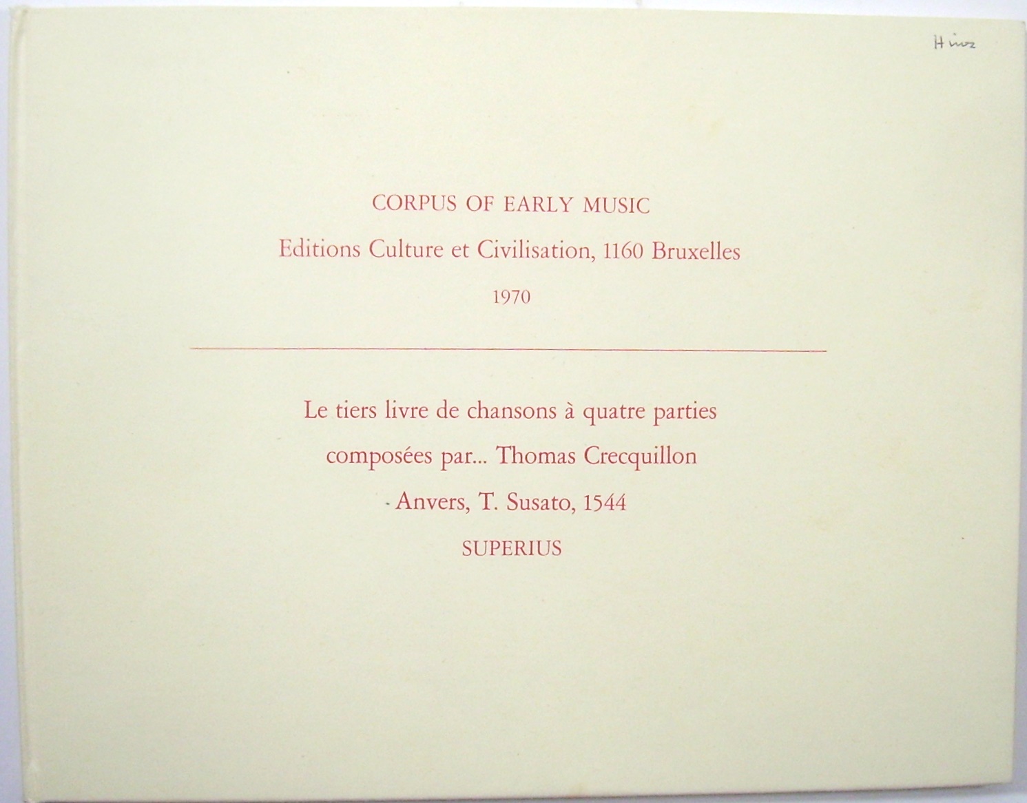Le tiers livre de chansons à quatre parties composées par ... Thomas Crecquillon. Anvers, T. Susato, 1544 Reprint