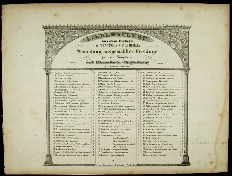 Titelblatt mit tabellarischer Aufzählung der Reihe "Liederspende..." Nr. 1 - 90. Als letzter Eintrag Curschmann/Nachtlied (op. 23/4) von 1840.