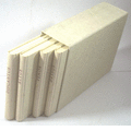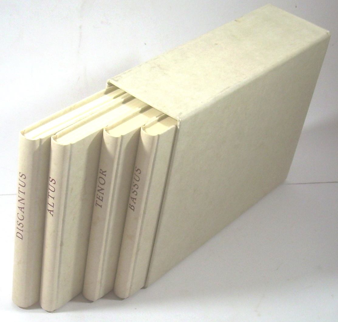 Querformat 15x21 cm, 4 Stimmbücher in Schuber mit rot geprägten Rückentiteln.