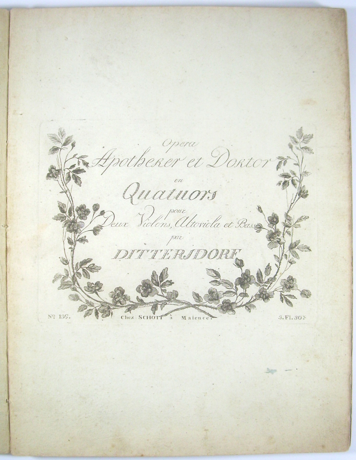"* Erstausgabe. - Das Singspiel ""Doktor und Apotheker"" war der größte Erfolg von Carl Ditters von Dittersdorf. Das Libretto stammt von Johann Gottlieb Stephanie d. J., der auch für Mozart die Texte zu ""Die Entführung aus dem Serail"" und ""Der Schauspieldirektor"" schrieb. - 1784 besuchte Dittersdorf, der damals in Böhmen lebte, Wien und spielte mit Mozart, Haydn und Vanhal Quartett, er selbst 2. Violine, Haydn 1. Violine, Mozart Bratsche und Vanhal Cello. Die Schilderung dieses Abends durch den irischen Sänger Michael Kelly, 1786 der erste Don Basilio und Don Curzio in Mozarts ""Die Hochzeit des Figaro"" ist bemerkenswert : ""Die Musiker waren passabel; keiner von ihnen war ein herausragender Virtuose auf seinem Instrument, aber sie verfügten über ein gewisses Maß an Verständnis, was wohl anerkannt werden dürfte, wenn ich ihre Namen nenne [Haydn, Dittersdorf, Vanhal, Mozart]."""