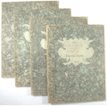 "4 Stimmhefte 31x23 cm, 20, 19, 15, 15 Seiten, gestochen, 4 (wiederholte) gestochene Zier-Titel in Rankenwerk, Violine 1 mit 2 Leerseiten. Violine 2 mit 1 Leerseite nach dem Titel. jeweils in Kartonumschlag (Marmorpapierbezug, mit handgeschriebenem Titeletikett ) geheftet. Die Umschläge leicht angeschmutzt und berieben. Namenszug jeweils auf der ersten Notenseite. Saubere Abzüge ohne Eintragungen."
