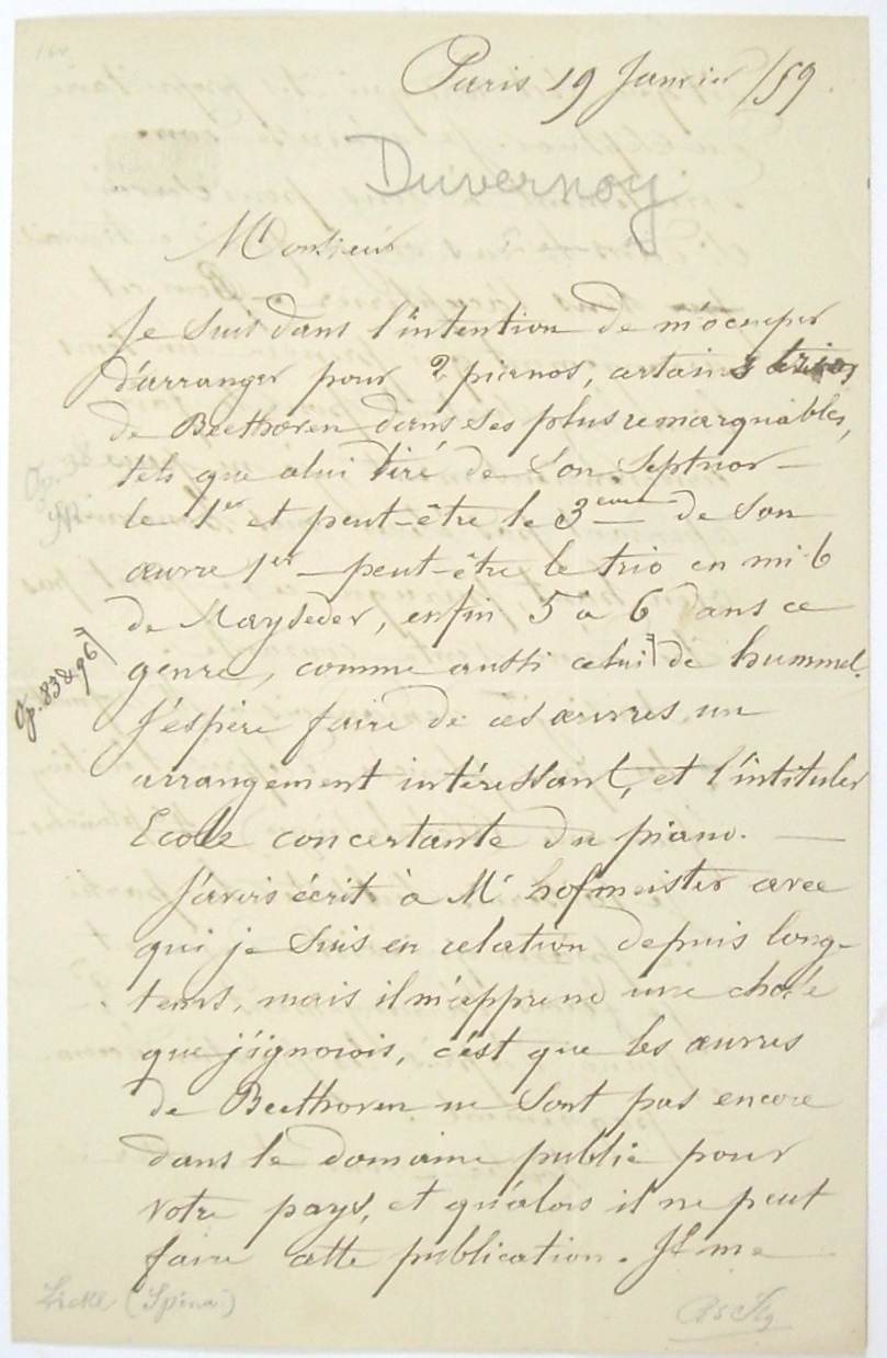"Je suis dans l’intention de m’occuper d’arranger pour 2 pianos certains trios de Beethoven dans ses plus remarquables, tells que celui tire de son Septuor - le 1er et le 3eme de son oeuvre 1er - peut-être le trio en mi b de Mayseder, enfin 5 à 6 dans ce genre, comme aussi de Hummel. ... J’avois écrit à M. Hofmeister ... il me dit que c’est vous qui êtes propriétaire du Septuor ..." - Aufschlussreiches umfangreiches Schreiben zum Verlagswesen für klassische Musik in Deutschland und Frankreich 1859: Duvernoy schreibt [an Peters, den Rechteinhaber von Beethovens op. 20] und bittet nach entsprechendem Hinweis seines deutschen Verlegers Hofmeister um die Einwilligung des Rechteinhabers für ein geplantes Arrangement von op. 20 für 2 Klaviere. Er erklärt dazu auch seine Kalkulation mit Hofmeister in Deutschland und Maurice Schlesinger in Paris. - Komplette Transkription liegt bei.