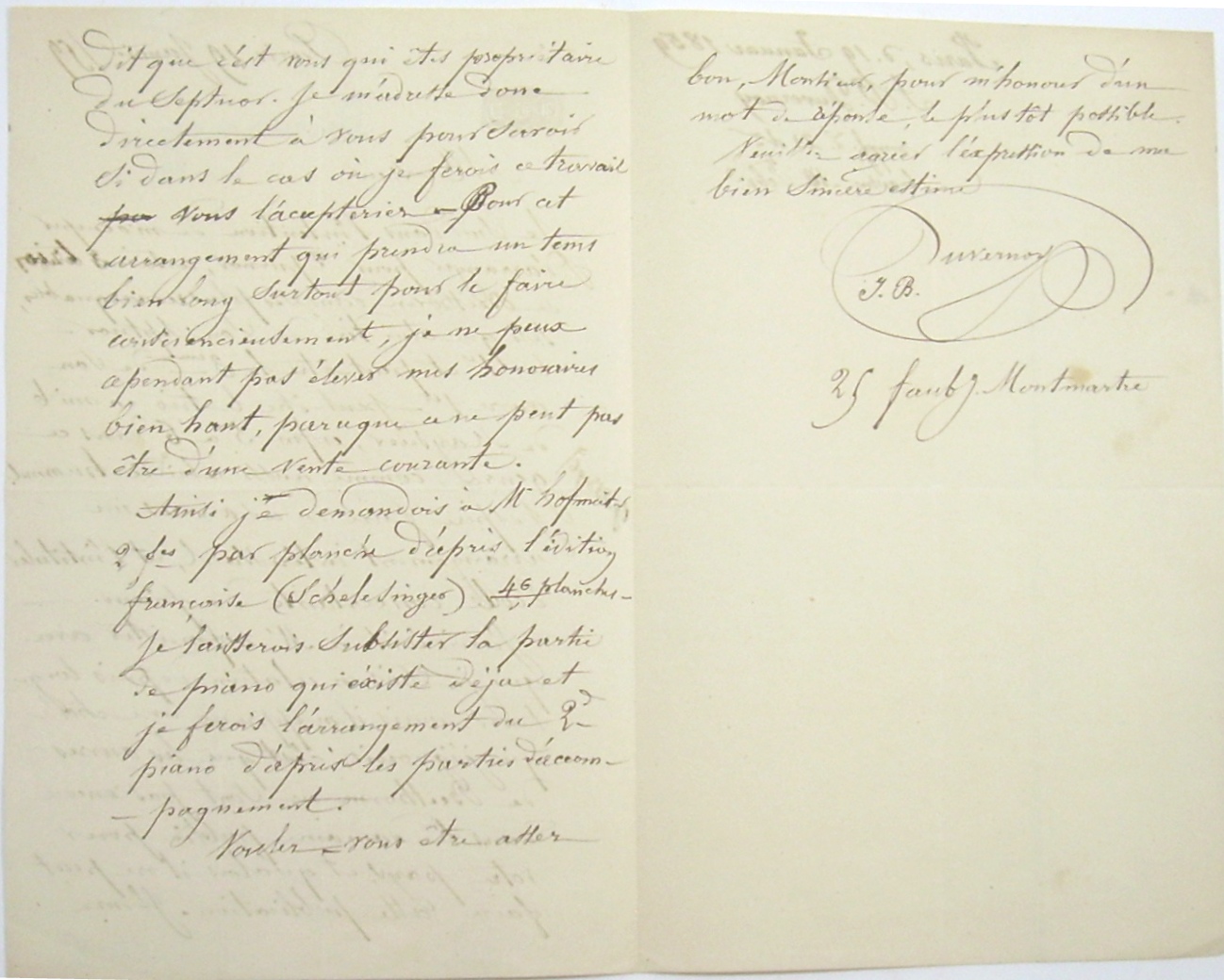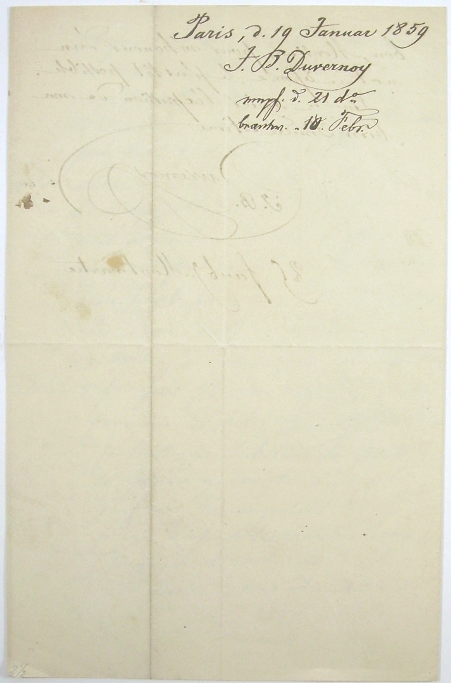 Eigenhändiger Brief französisch signiert mit Ort und Datum "Paris, 19.1.1859" an den Verlag Peters als Rechteinhaber wegen geplanter Arrangements von Beethoven, Hummel, Mayseder.