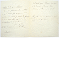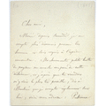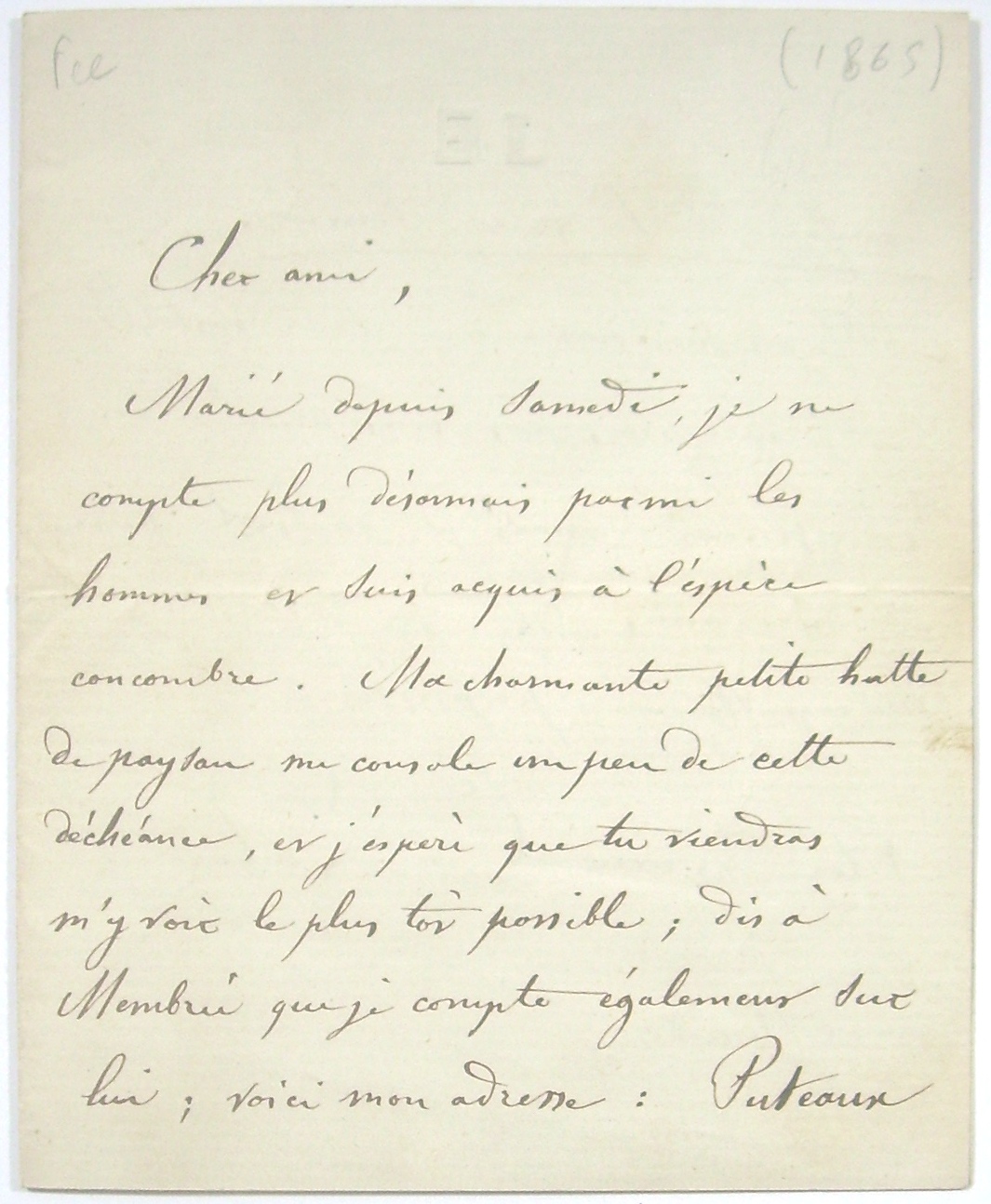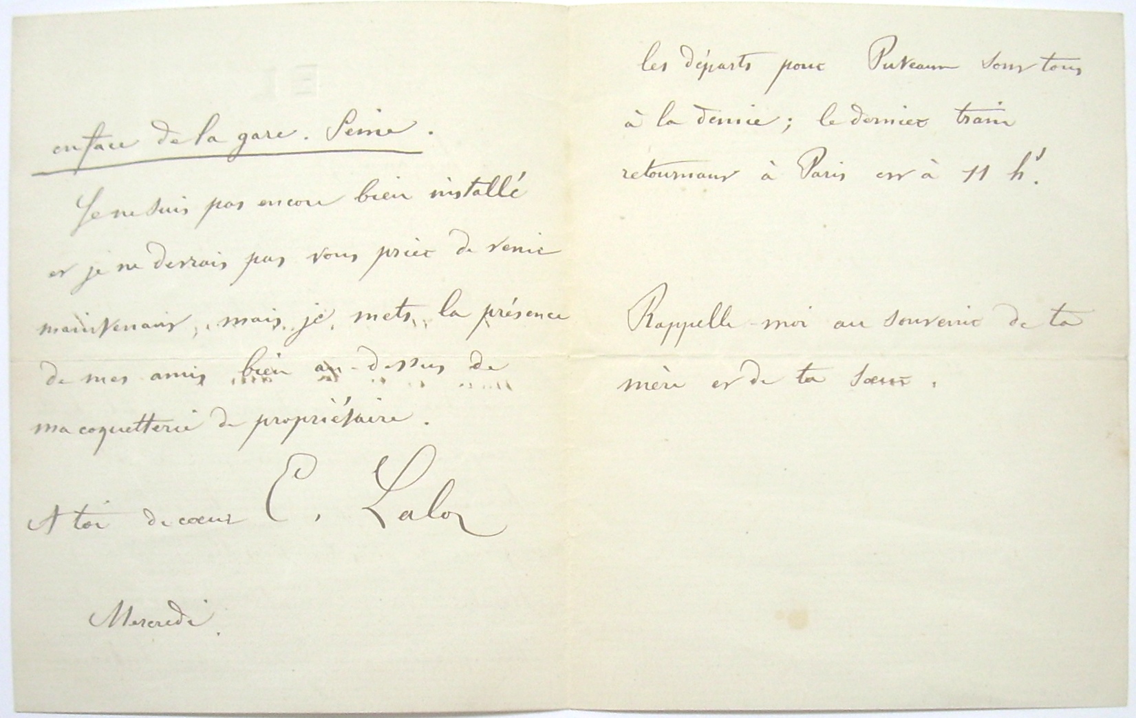 Charmantes Schreiben des Frischverheirateten an einen Freund: "Marié depuis samedi, je ne compte plus désormais parmi les hommes et suis acquis à l'espèce concombre ..." - "Lieber Freund, seit gestern verheiratet zähle ich mich in Zukunft nicht mehr zu den Menschen und habe mich der Gattung der Gurken angeschlossen. Meine charmante kleine Bauernpritsche tröstet mich ein wenig über diesen Verfall, und ich hoffe, dass du mich so bald wie möglich besuchen kommst; sag Membru (?), daß ich auf ihn gleichermaßen zähle; hier ist meine Adresse: Puteaux, enface de la gare. Seine. Ich bin noch nicht richtig eingerichtet, und ich dürfte dich nicht bitten, jetzt schon zu kommen, aber ich setze die Gegenwart meiner Freunde wohl über meine Eitelkeit als Grundbesitzer. Von Herzen dein E. Lalo, Mittwoch. Die Abfahrten nach Puteaux sind alle halben Stunden; der letzte Zug nach Paris geht um 11:00. Grüsse deine Mutter und deine Schwester von mir." - Édourd Lalo (1823-1892), französischer Komponist und Violinist, bekannt für sein 2. Violinkonzert "Symphonie espagnole", heiratete 1865 in zweiter Ehe die Altistin Julie Bernier de Maligny.