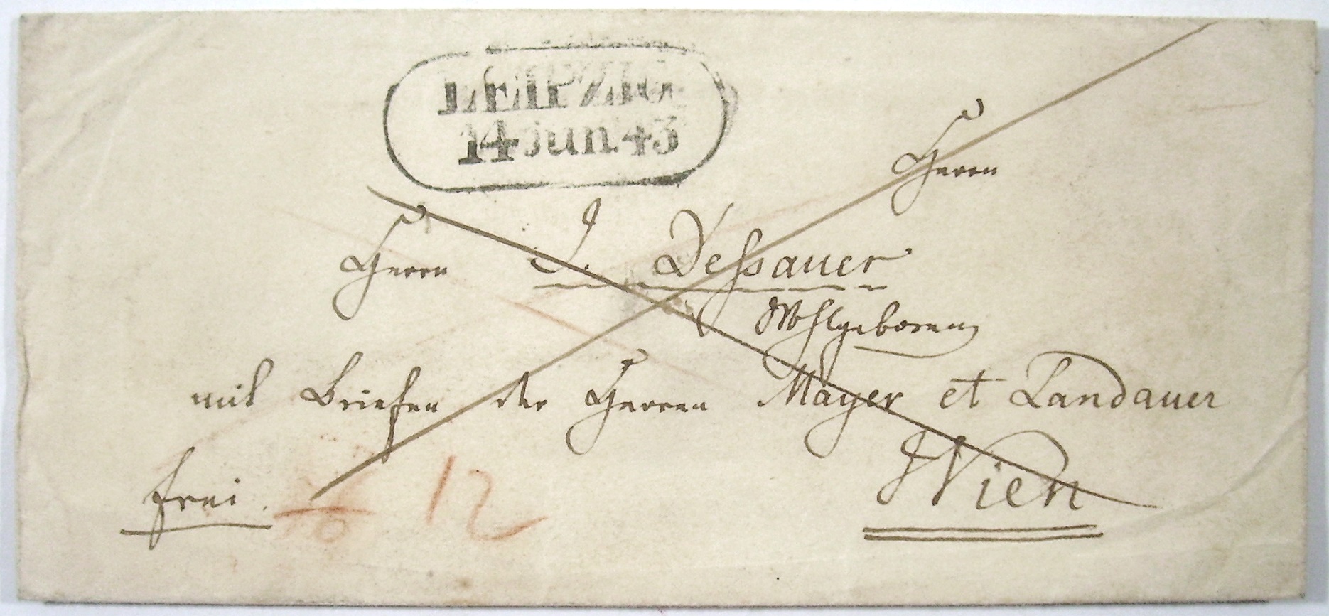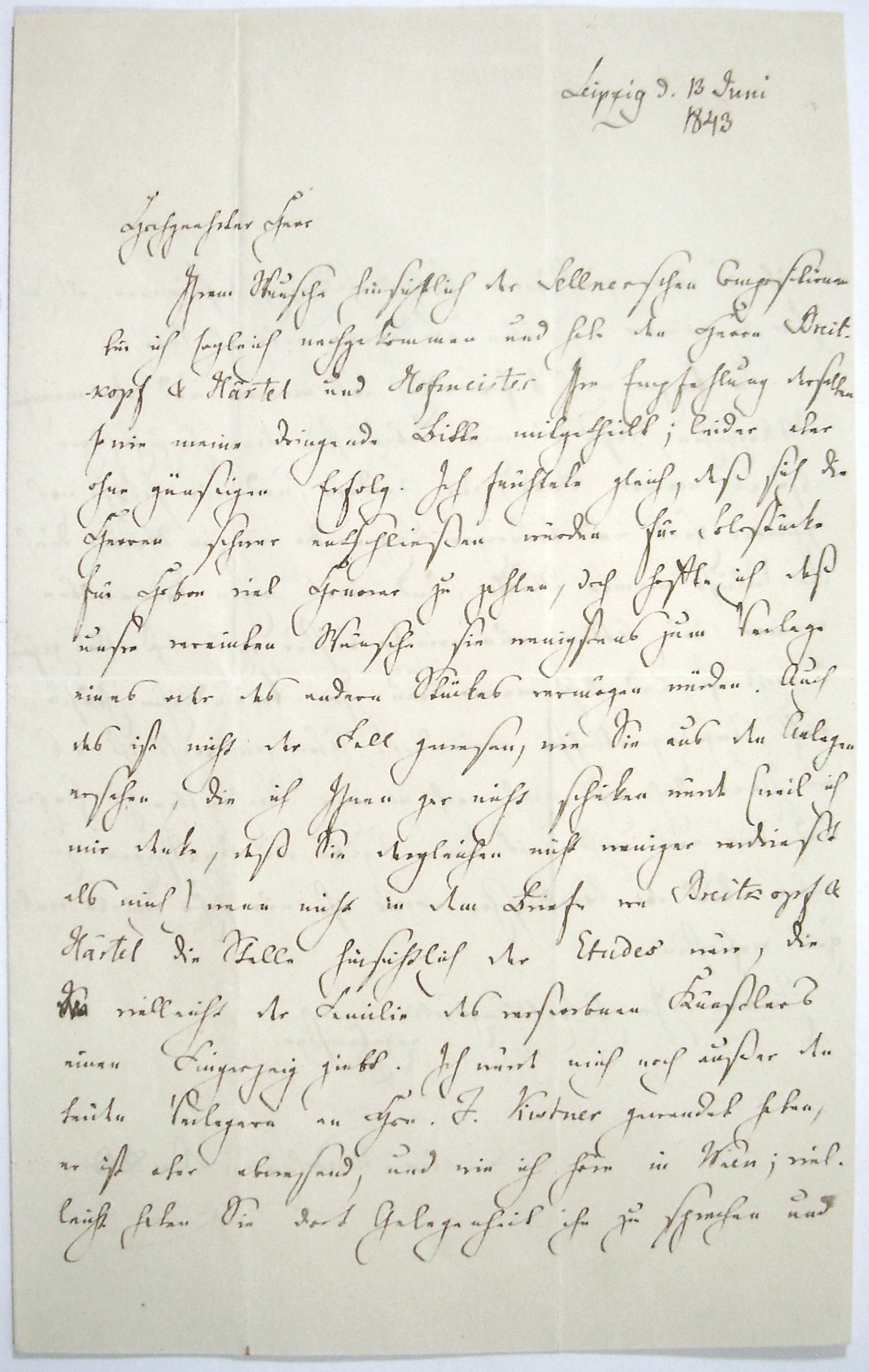 Eigenhändiger Brief signiert, Leipzig 13.06.1843, an den Komponisten Joseph Dessauer in Wien, über den Versuch, Kompositionen des verstorbenen Joseph Sellner in Leipzig zu veröffentlichen.