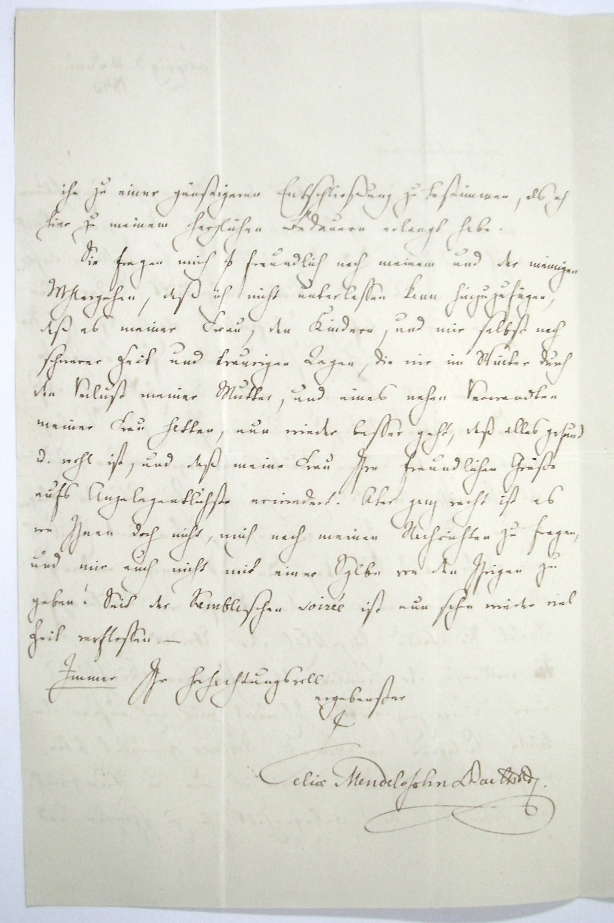 * Aus der Autographensammlung Joseph Dessauer, versteigert 1933 in der Schweiz (Auktionskatalog Dessauer Autographen 1933, No. 248; FMB Sämtliche Briefe 4000. - Ausführliche Antwort an den Wiener Komponisten Joseph Dessauer, der sich an Felix Mendelssohn Bartholdy gewandt hatte, um der Witwe des kurz zuvor verstorbenen Komponisten und Oboisten Joseph Sellner (1787-1843) durch den Verkauf von Manuskripten ihres Mannes zu helfen. Mendelssohn, der sich, allerdings ohne Erfolg, persönlich bei Leipziger Verlagen dafür eingesetzt hatte, rät, statt der Solostücke für Oboe vielleicht Etüden für das Instrument anzubieten: "Ihrem Wunsche hinsichtlich der Sellnerschen Compositionen bin ich sogleich nachgekommen und habe den Herrn Breitkopf & Härtel und Hofmeister Ihre freundliche Empfehlung derselben so wie meine dringende Bitte mitgetheilt; leider aber ohne günstigen Erfolg. Ich fürchtete gleich, daß sich die Herrn schwer entschließen würden für Solostücke für Hoboe viel Honorar zu zahlen, doch hoffte ich daß unsre vereinten Wünsche sie wenigstens zum Verlage eines oder des andern Stückes vermögen würden. Auch das ist nicht der Fall gewesen, wie Sie aus den Anlagen ersehen, die ich Ihnen gar nicht schicken würde (weil ich mir denke, daß Sie dergleichen nicht weniger verdrießt als mich) wenn nicht in den Briefen von Breitkopf & Härtel die Stelle hinsichtlich der Etudes wäre, die vielleicht der Familie des verstorbenen Künstlers einen Fingerzeig giebt. Ich würde mich noch außer den beiden Verlegern an Hrn, J,. Kistner gewendet haben, er ist aber abwesend, und wie ich höre in Wien; vielleicht haben Sie dort Gelegenheit, ihn zu sprechen und ihn zu einer günstigeren Entschließung zu bestimmen, als ich hier zu meinem herzlichen Bedauern erlangt habe." Abschließend einige persönliche Bemerkungen zum Tod seiner Mutter, der Mendelssohn tief getroffen hatte. - Schönes langes Autograph über die kollegiale Hilfsbereitschaft des vielbeschäftigten Mendelssohn kurz nach der Gründung des Leipziger Konservatoriums, bisher nur bruchstückhaft durch den Auktionskatalog von 1933 bekannt.