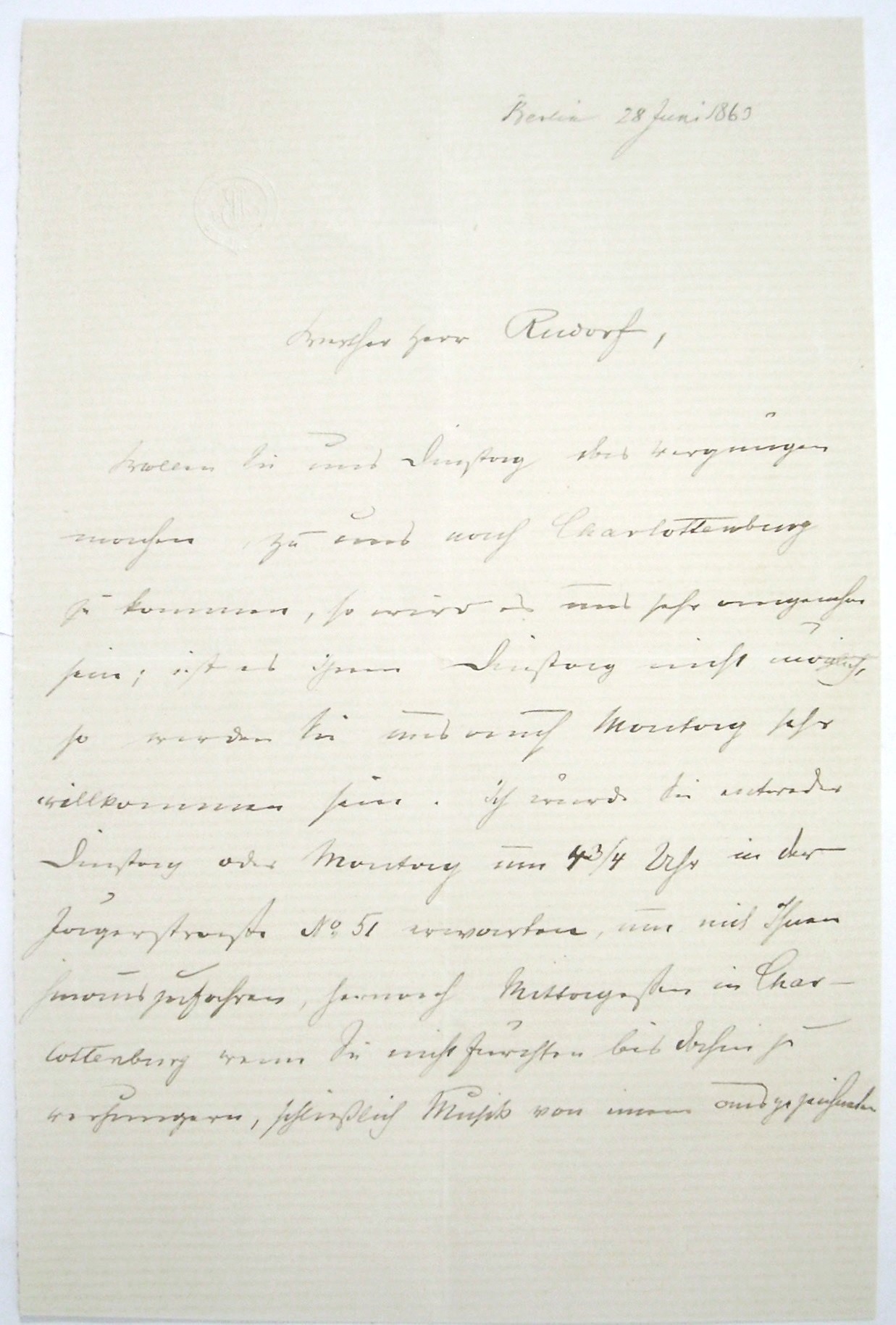 Eigenhändiger Brief an Ernst Rudorff, Berlin, 28.06.1863 Einladung zu privatem Musizieren.