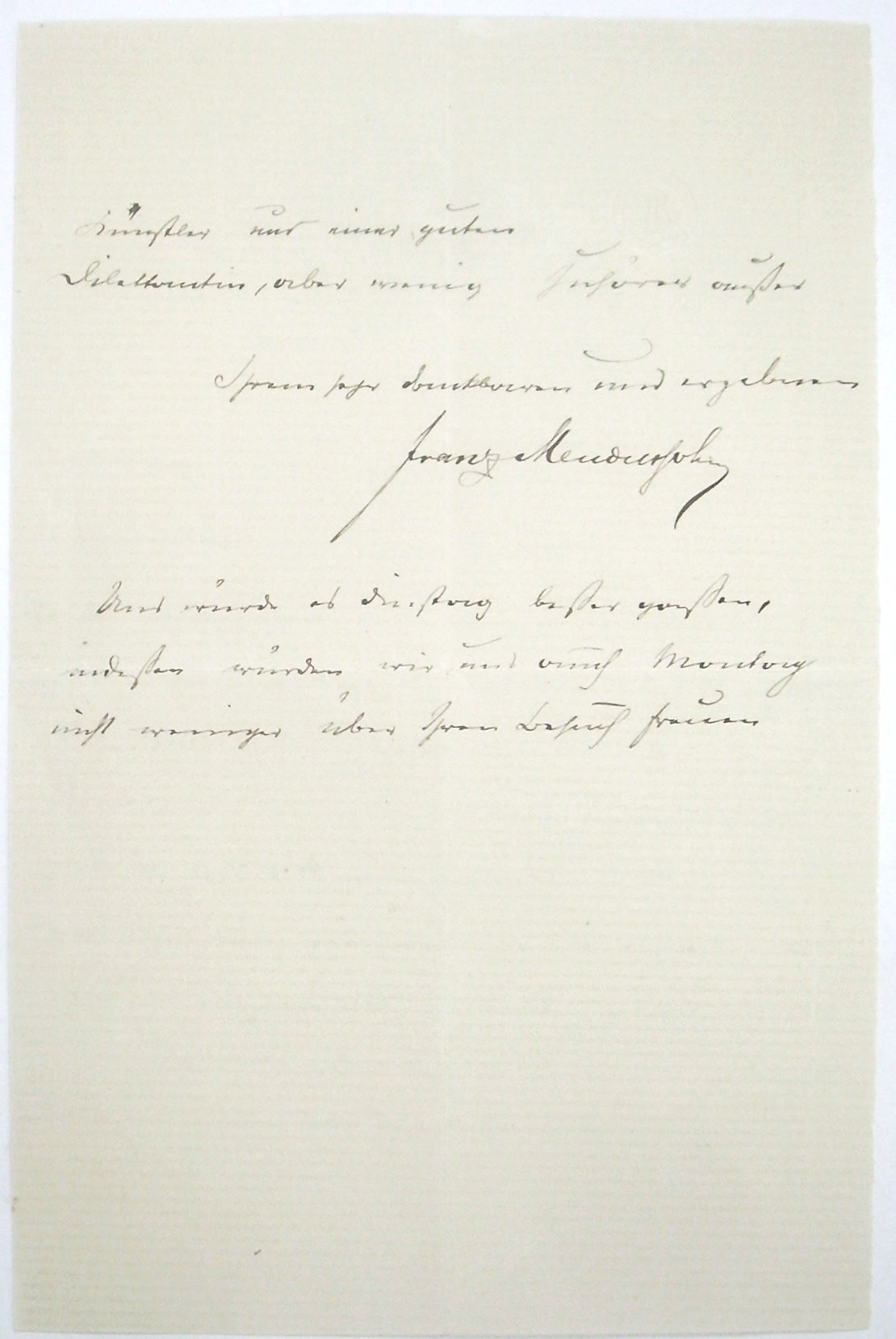 "Werther Herr Rudorf, wollen Sie uns Dienstag das Vergnügen machen, zu uns nach Charlottenburg zu kommen, so wird es uns sehr angenehm sein; ist es Ihnen Dienstag nicht möglich, so werden Sie uns auch Montag sehr willkommen sein. Ich würde Sie entweder Dienstag oder Montag um 4 ¾ Uhr in der Jägerstraße No 51erwarten, um mit Ihnen hinauszufahren, hernach Mittagessen in Charlottenburg, wenn Sie nicht fürchten, bis dahin zu verhungern, schließlich Musik von einem ausgezeichneten Künstler und einer guten Dilettantin, aber wenig Zuhörer außer Ihrem sehr dankbaren und ergebenen Franz Mendelssohn. Uns würde es Dienstag besser passen, indessen würden wir uns auch Montag nicht weniger über Ihren Besuch freuen." - Mit "ausgezeichneter Künstler" ist wohl Rudorff selbst gemeint, die "gute Dilettantin" Enole Mendelssohn geb. Biarnez (1827-1889), die Frau von Franz Mendelssohn. Sie war eine begabte Pianistin, die u.a. auch Joseph Joachim, als dessen 50. Geburtstag im Hause Mendelssohn gefeiert wurde, zur Teufelstrillersonate von Tartini begleitete. Franz von Mendelssohn sen. leitete seit den 1850er Jahren als einer der Inhaber das von seinem Großvater 1795 gegründete Privatbankhaus.Er war Sohn von Felix Mendelssohns Cousin Alexander Mendelssohn. Der Komponist Ernst Rudorff (1840-1916), ab 1869 Professor für Klavier an der neu gegründeten Hochschule für Musik in Berlin, war hier in seinen jungen Jahren häufig zu Besuch. Die freundschaftliche Bindung an das Haus Mendelssohn ging bereits auf seine Eltern zurück.