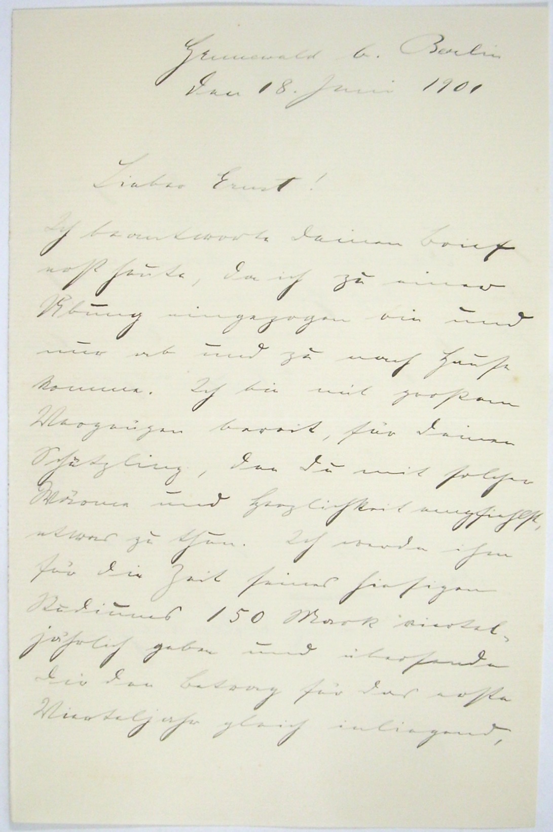 Eigenhändiger Brief an Ernst Rudorff, Grunewald b. Berlin, den 18. Juni 1901, Stipendium für Musiker