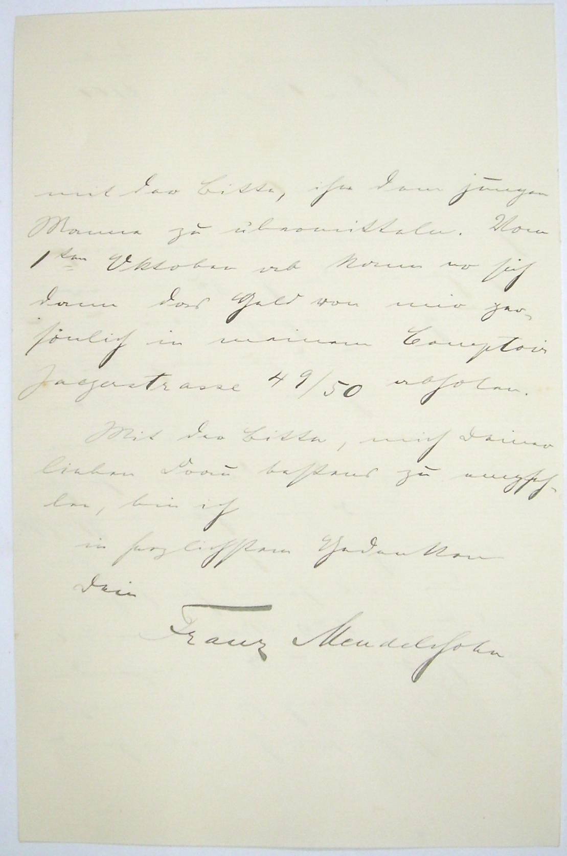 "Lieber Ernst! Ich beantworte Deinen Brief erst heute, da ich zu einer Übung eingezogen bin, und nur ab und zu nach Hause komme. Ich bin mit großem Vergnügen bereit, für Deinen Schützling, den Du mit solcher Wärme und Herzlichkeit empfiehlst, etwas zu thun. Ich werde ihm für die Zeit seines hiesigen Studiums 150 Mark vierteljährlich geben und übersende Dir den Betrag für das erste Vierteljahr gleich inliegend mit der Bitte, ihn dem jungen Mann zu übermitteln. Vom 1ten Oktober ab kann er sich dann das Geld von mir persönlich in meinem Comptoir Jägerstrasse 49/50 abholen. Mit der Bitte, mich Deiner lieben Frau bestens zu empfehlen, bin ich In herzlichstem Gedenken Dein Franz Mendelssohn." - Franz Mendelssohn jun., jüngerer Bruder von Robert Mendelssohn, Großneffe von Felix Mendelssohn Bartholdy und in 4. Generation im Bankhaus Mendelssohn und Co. tätig (1892 Mitinhaber, nach dem Tod seines Bruders Robert 1917 Seniorchef). - Der Berliner Komponist und Klavierprofessor Ernst Rudorff (1840-1916) verkehrte in seinen jungen Jahren im Elternhaus von Franz Mendelssohn und war mit seinem Bruder Robert auch durch dessen privates musikalisches Engagement zeitlebens verbunden.