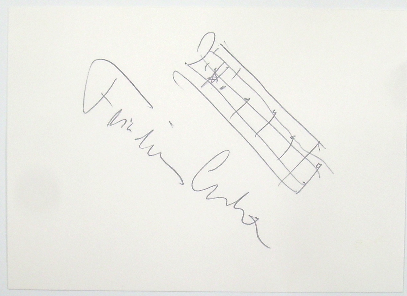 Friedrich Cerha gehört zu den bedeutendsten österreichischen Komponisten der musikalischen Moderne (Enkelgeneration der 2. Wiener Schule). Gründete (mit Kurt Schwertsik) 1958 das Ensemble "die reihe" zur Schaffung eines permanenten Forums für neue Musik in Wien; Pionierarbeit bei der Präsentation neuer Werke, aber auch der Musik der Klassischen Moderne, vor allem der 2. Wiener Schule. 1979 Fertigstellung von Alban Bergs Oper Lulu, für die Cerha die Instrumentation des 3. Akts vollendete und die Lücken ergänzte (Uraufführung unter Pierre Boulez, Paris 1979). Zahlreiche Auszeichnungen, darunter der Große Österreichische Staatspreis für Musik, Ernst von Siemens Musikpreis (auch als "Nobelpreis der Musik bezeichnet), Verleihung des 'Goldenen Löwen / Leone d'Oro' (Venedig 2006). - Das Notenzitat (nach Sammlerangabe) aus dem "Requiem der Versöhnung", einem Gemeinschaftswerk namhafter Komponisten der im Zweiten Weltkrieg verfeindeten Nationen (u.a. Luciano Berio, Arne Nordheim, Judith Weir, Alfred Schnittke, György Kurtág, Krzysztof Penderecki und John Harbison), für das Cerha das "Kyrie" und "Libera me" komponierte.