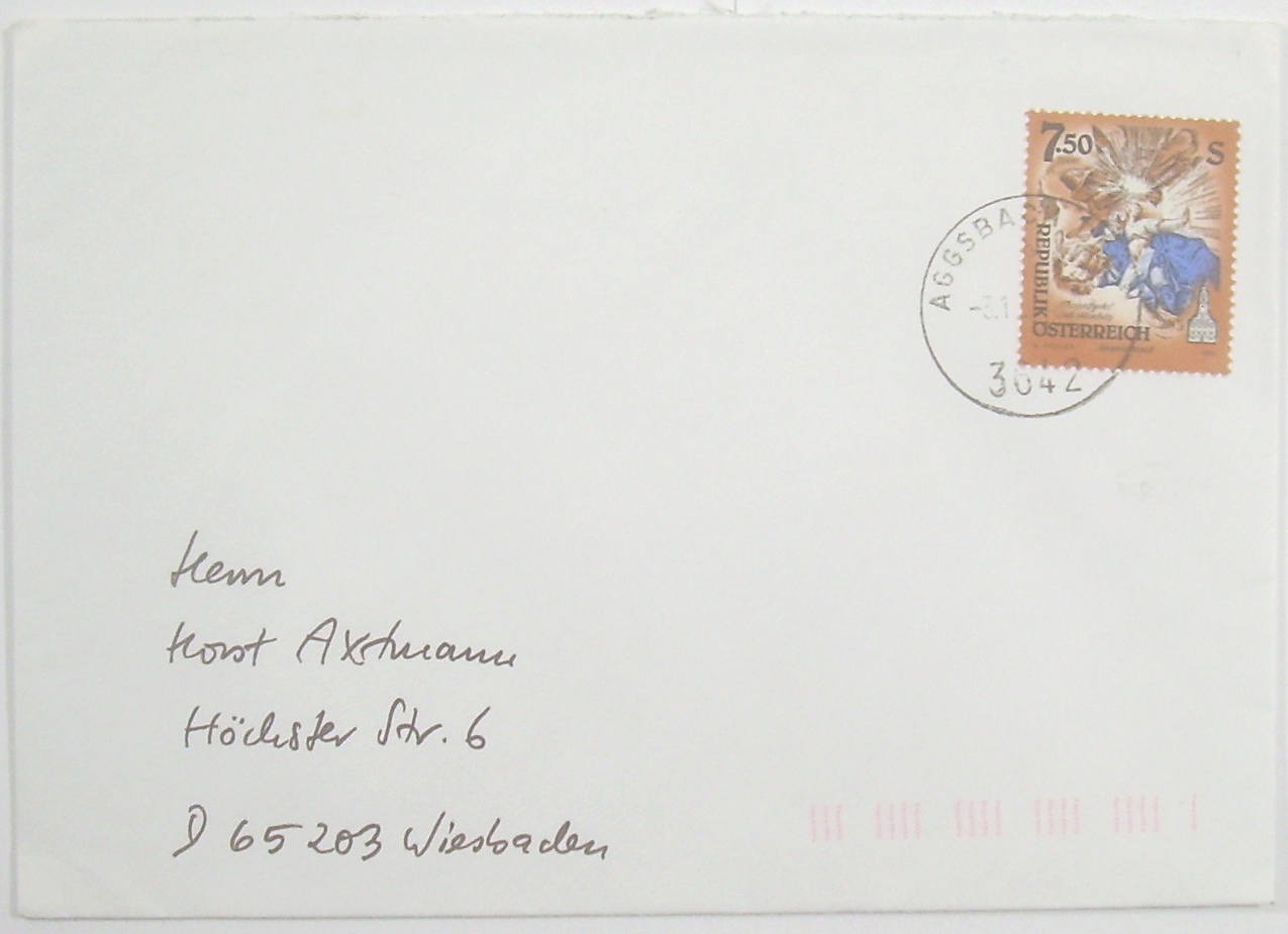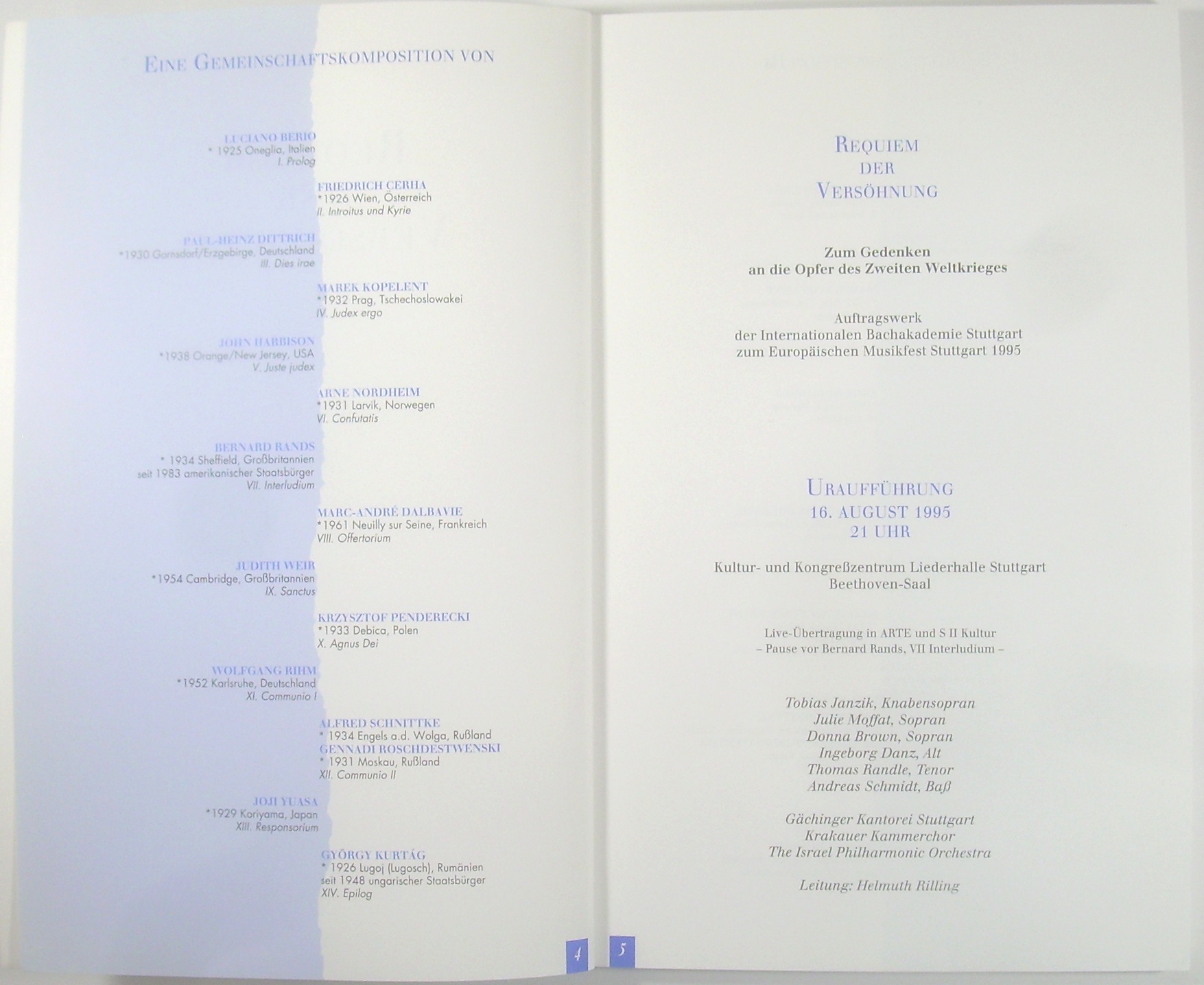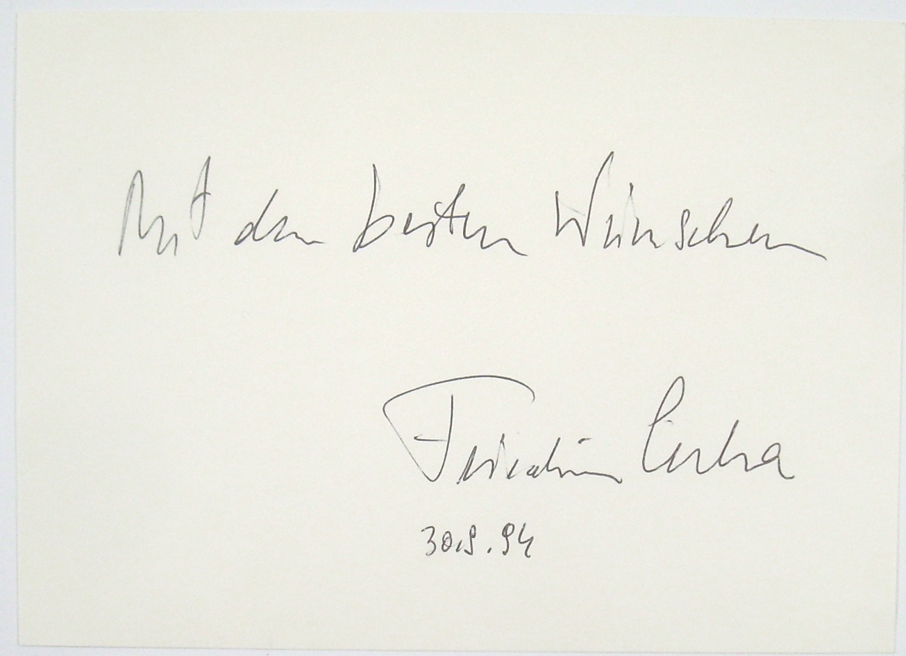 1. Eigenhändiges musikalisches Albumblatt (14,5x10,5 cm) mit Notenzitat (1 Takt aus "Requiem der Versöhnung") und Unterschrift auf Karteikarte. - 2. Eigenhändiges Albumblatt (14,5x10,5 cm) mit Widmung, Unterschrift und Datum "Mit den besten Wünschen Friedrich Cerha 30.9.94" auf Karteikarte. - Dazu Rückkuvert an den Sammler Horst Axtmann (Poststempel "Aggsbach, 3.1."). - BEILIEGT: Requiem der Versöhnung. Zum Gedenken an die Opfer des Zweiten Weltkriegs. Auftragswerk der Internationalen Bachakademie Stuttgart. Uraufführung 16. August 1995. Mit Beilage: Helmuth Rilling: Einführung in das Requiem der Versöhnung.
