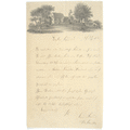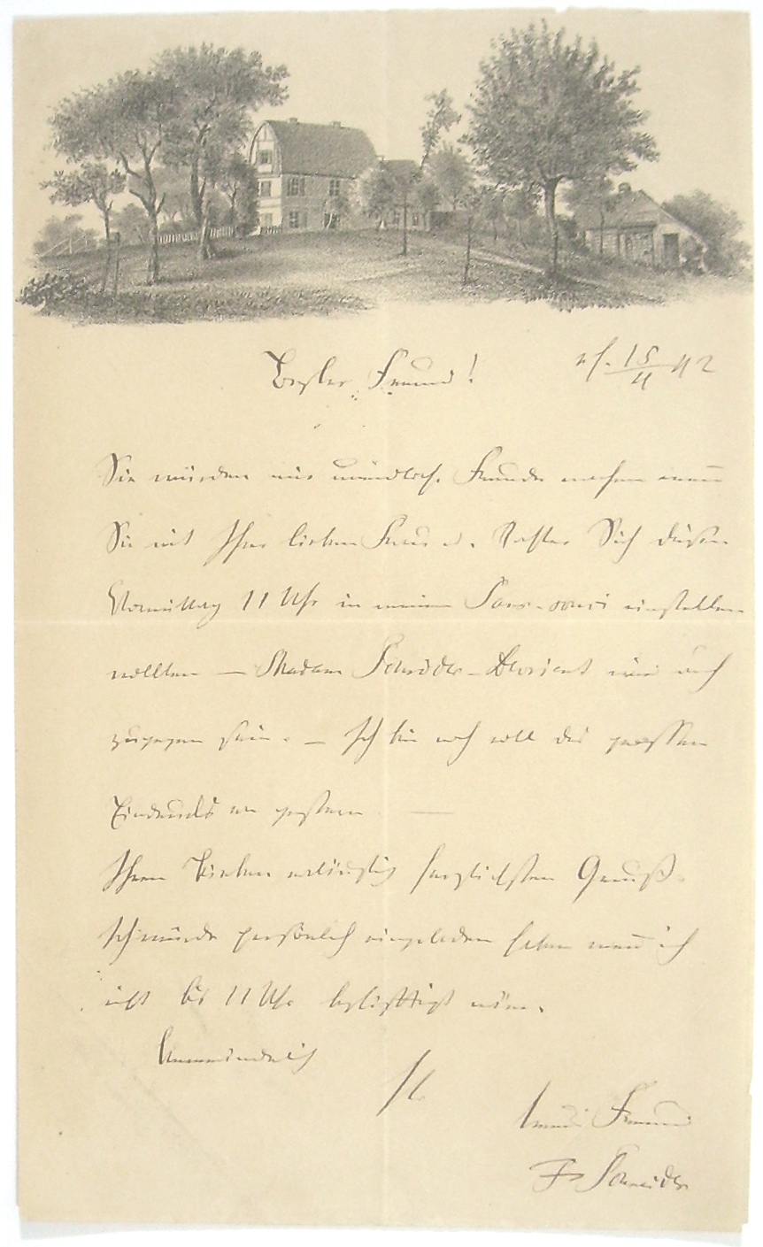 22x13 cm, mit lithographisch illustriertem Briefkopf. 1 Seite, Doppelblatt mit Adresse und Siegelrest. - Der stimmungsvolle Briefkopf zeigt ein Landhaus mit Nebengebäude in einem Obstgarten - offenbar Schneiders "Sans-souci".