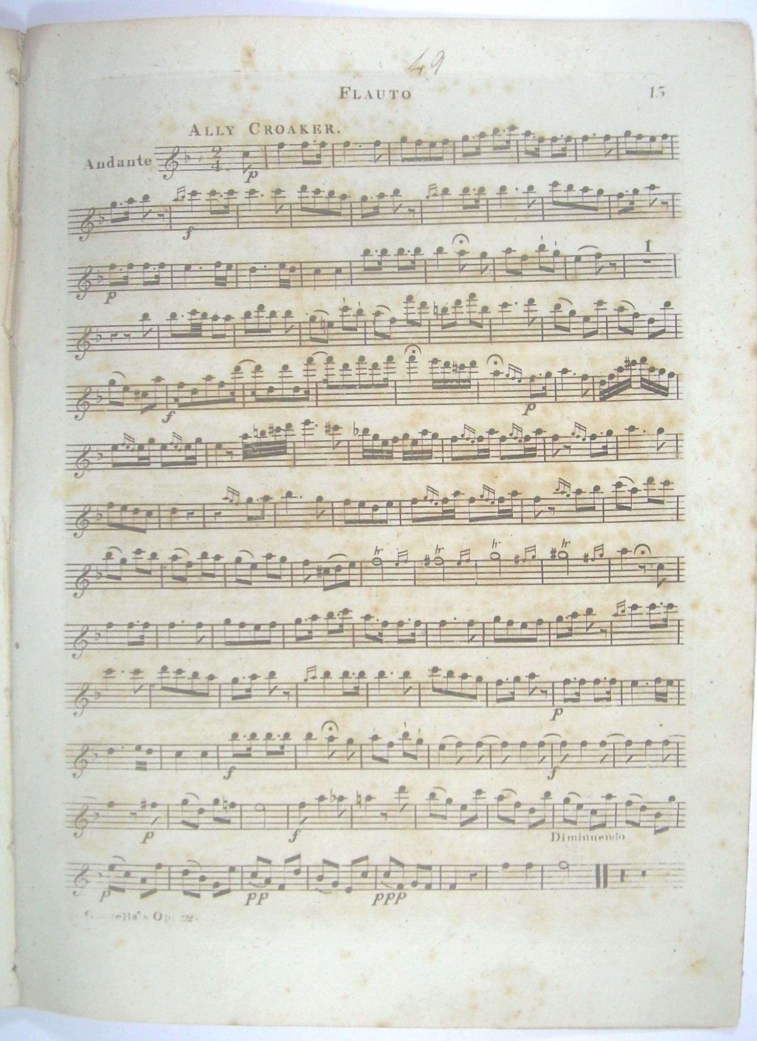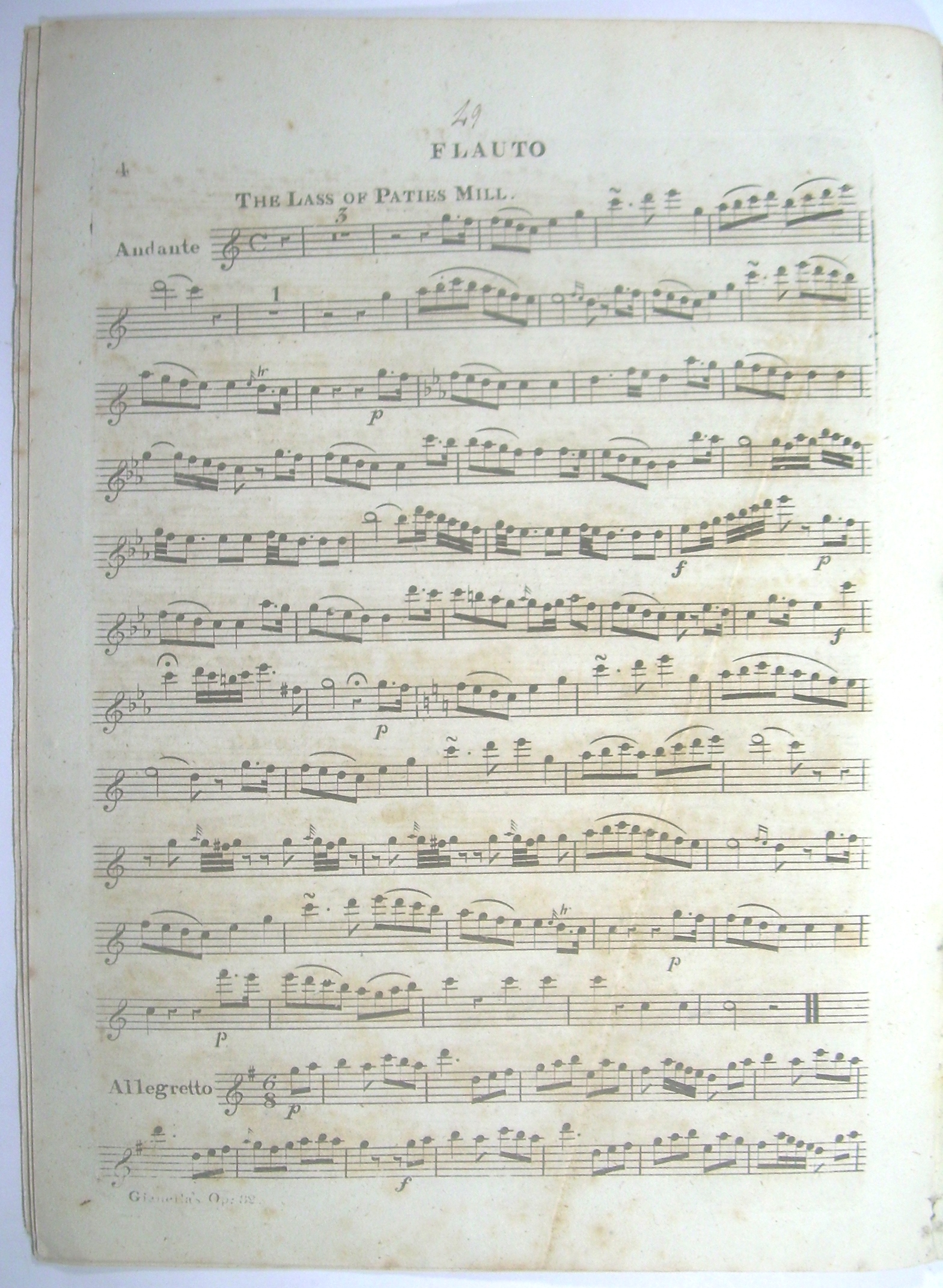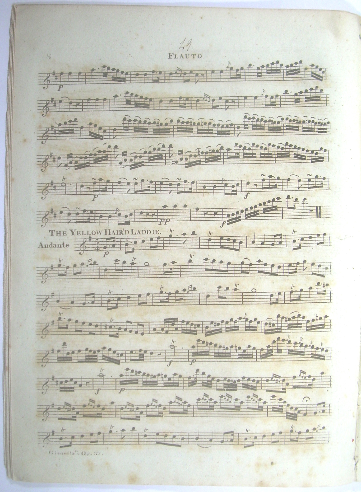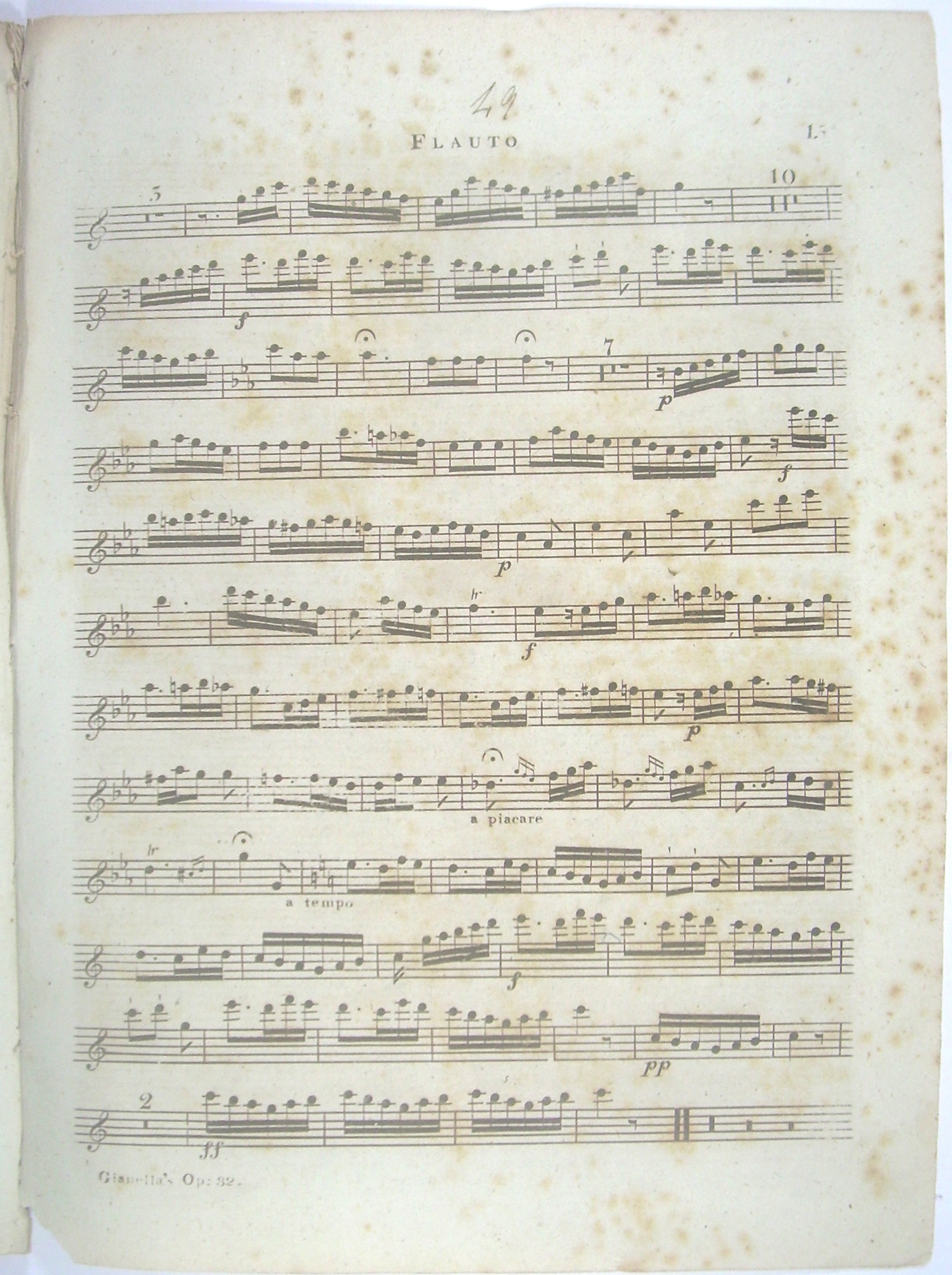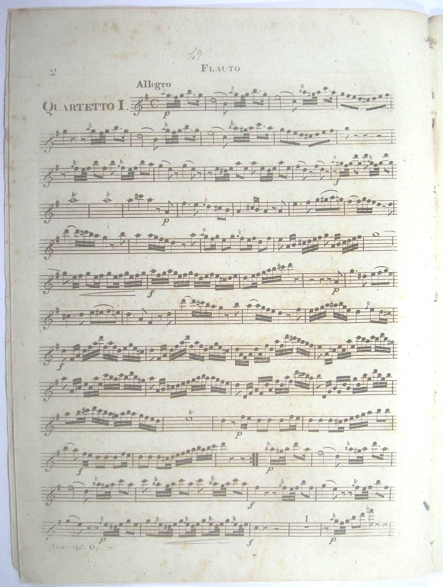 4 Stimmhefte 34x25 cm, 15, 13, 13, 13 Seiten gestochen, ausgebunden, Druck auf bläulichem Papier, stockfleckig. Die Flötenstimme etwas kleiner beschnitten und stockfleckig, auf dem Titel mit den handschriftlichen Initialen des Komponisten "L.G.", Rücken unauffällig verstärkt, vor dem Notentext 1 Seite "Catalogue of Flut Music" von Monzani & Hill.