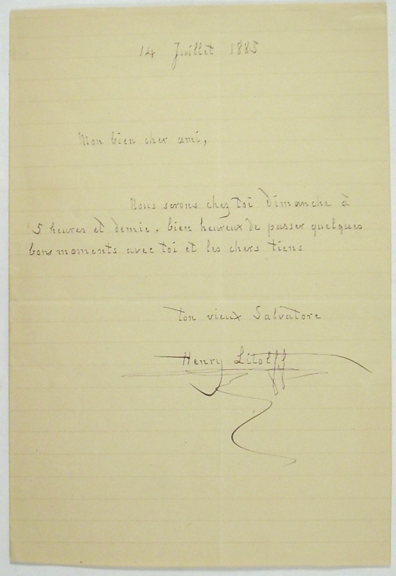 Verabredung zu privatem Besuch: "Mon bien cher ami, Nous serons chez toi dimanche à 5 heures et demie, bien heureux de passer quelques bons moments avec toi et les chers tiens. Tons vieux Salvatore, Henry Litolff."
