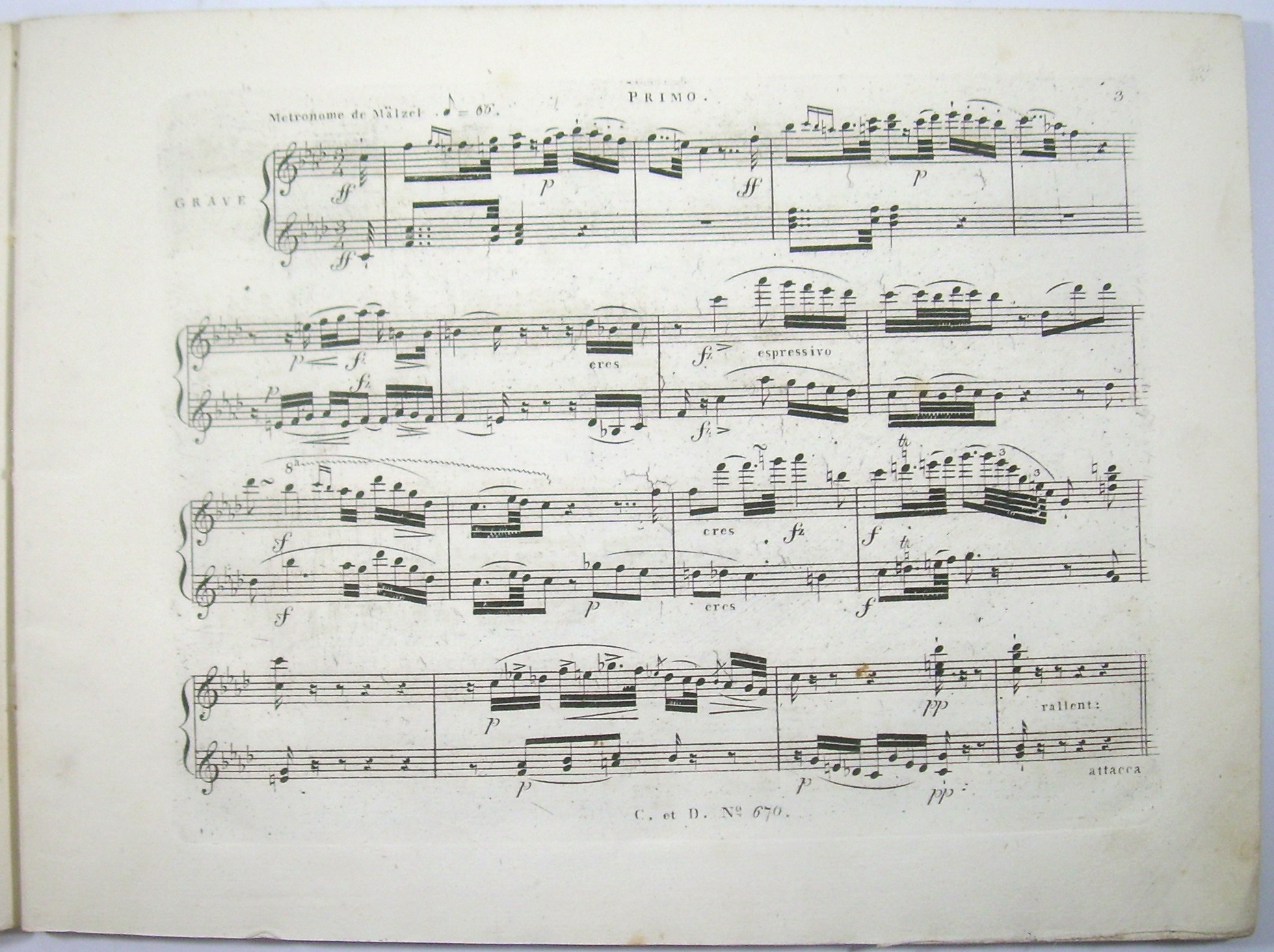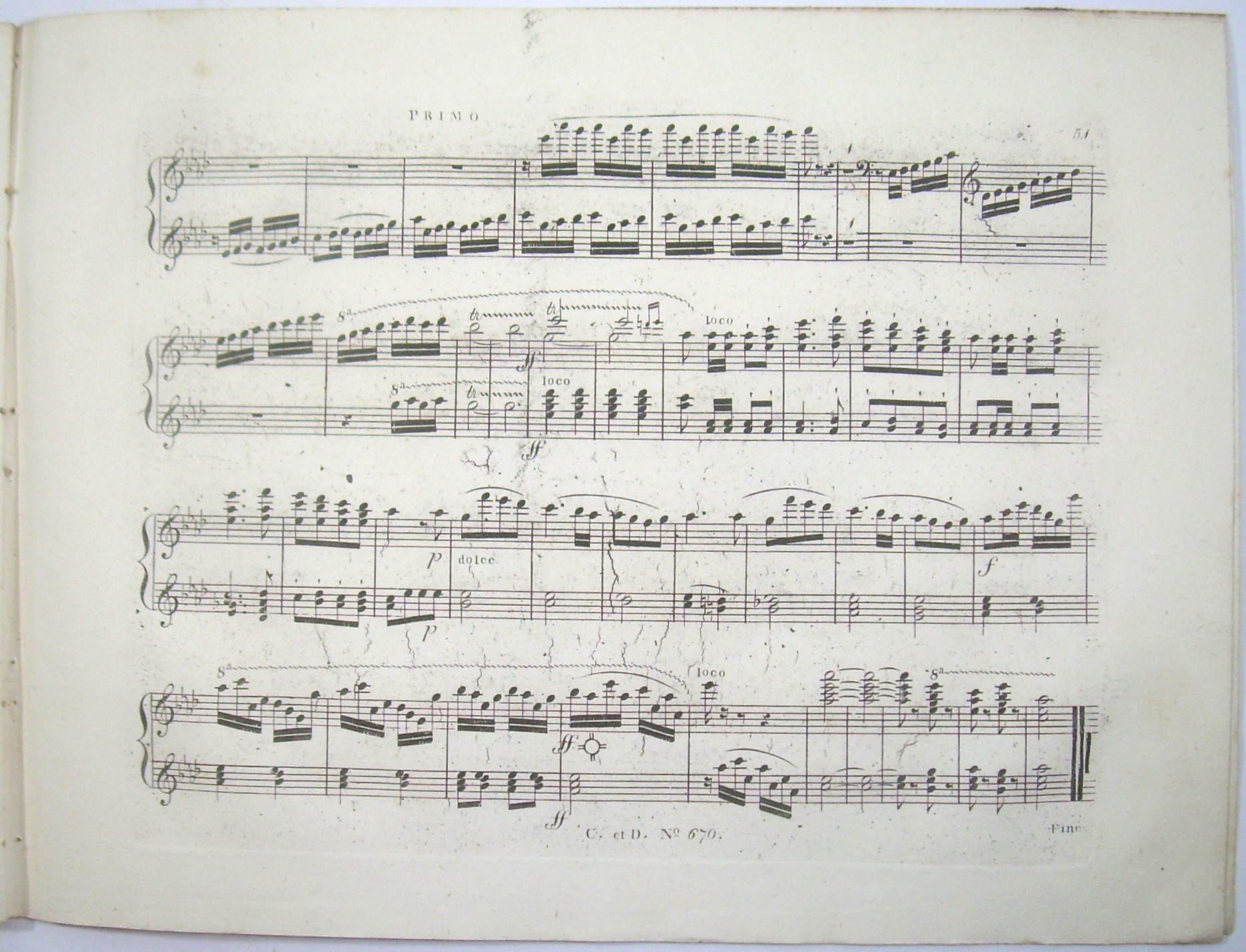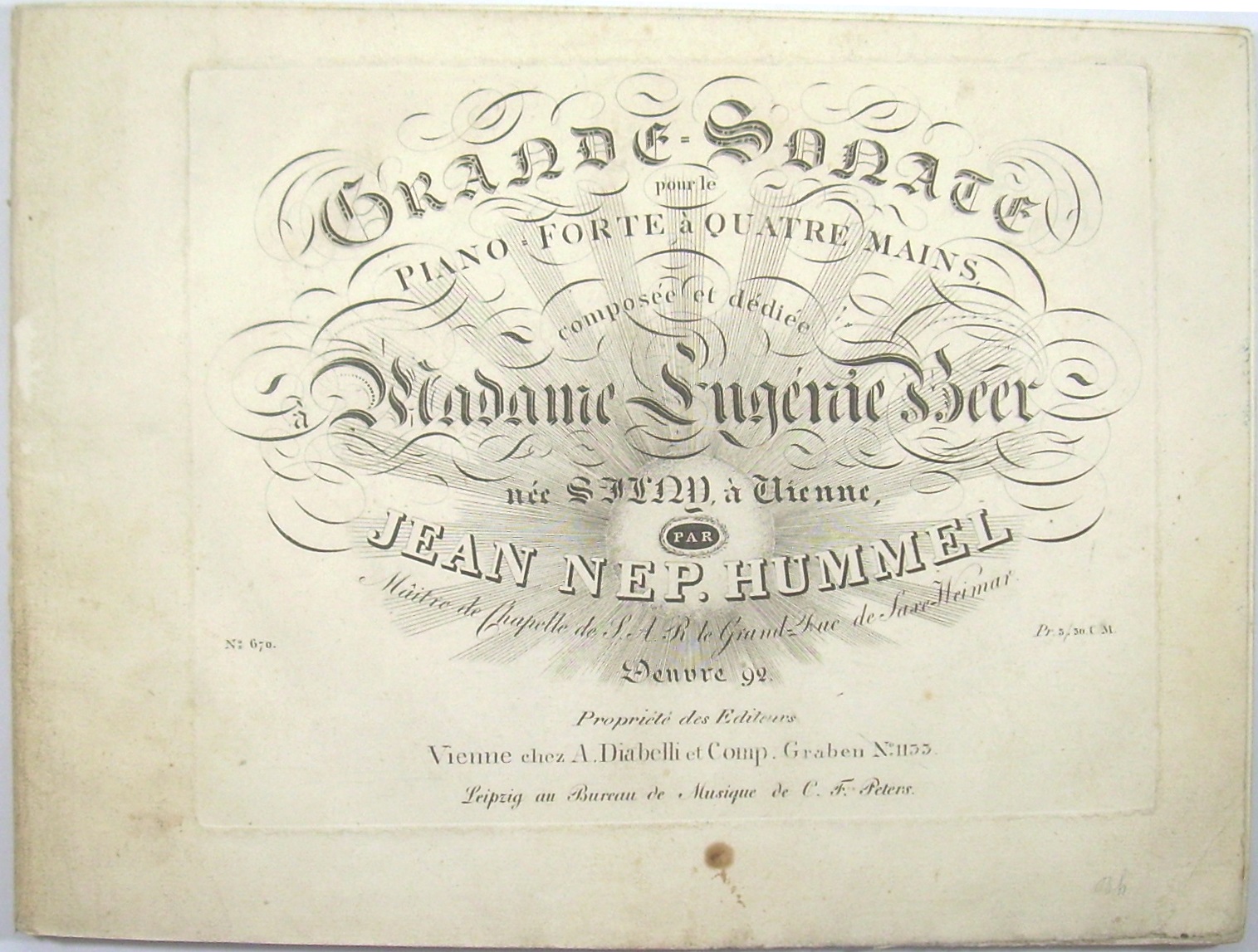 * Zimmerschied S. 137. - Titelauflage der Originalausgabe (Cappi et Diabelli, Wien 1820), mit neuem Verlagsimpressum und verändertem Preis. Notendruck von den Originalplatten der Erstausgabe mit starken Abnützungsspuren (Plattenrissen). 1835 lässt Diabelli dann eine zweite Auflage neu stechen. Der Wiener Widmungsträgerin Eugenie Beer, geborene Silny haben neben Hummel der ihr mehrere Werke widmete, auch Moscheles und Mayseder Kompositionen dediziert.