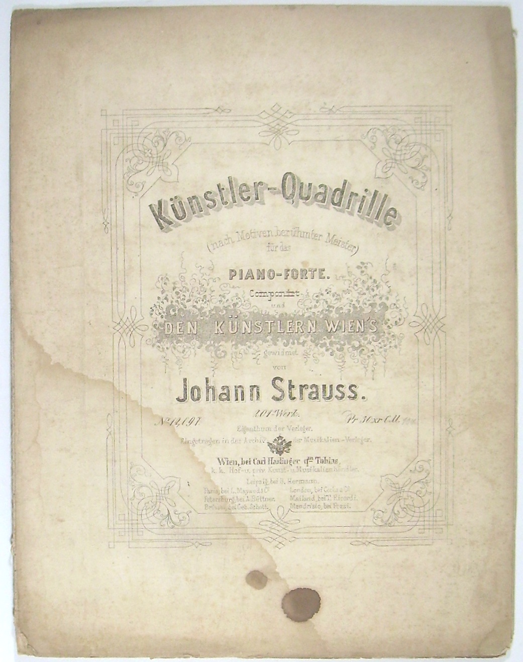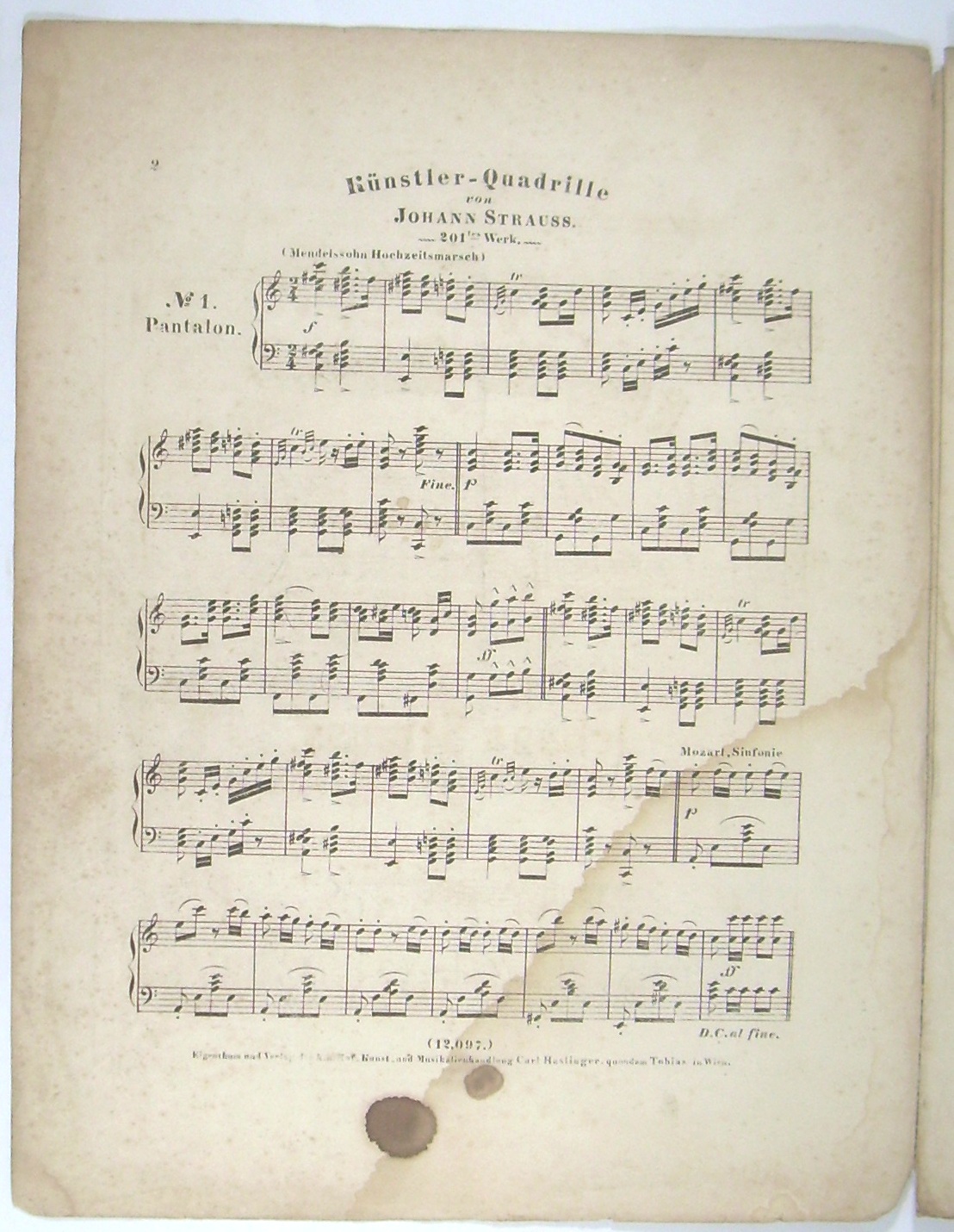 * Erstausgabe für Klavier (Weinmann S. 84). - Die Quadrille nach Motiven aus den "greatest Hits" der Klassik: Mendelssohn (Hochzeitsmarsch), Mozart (g-moll-Symphonie), Weber (Oberon), Chopin (Trauermarsch, Dur-Mittelteil), Paganini (Glöckchen-Rondo), Meyerbeer, Schubert, Mozart (Zauberflöte, Papageno), Beethoven, Türkischer Marsch...