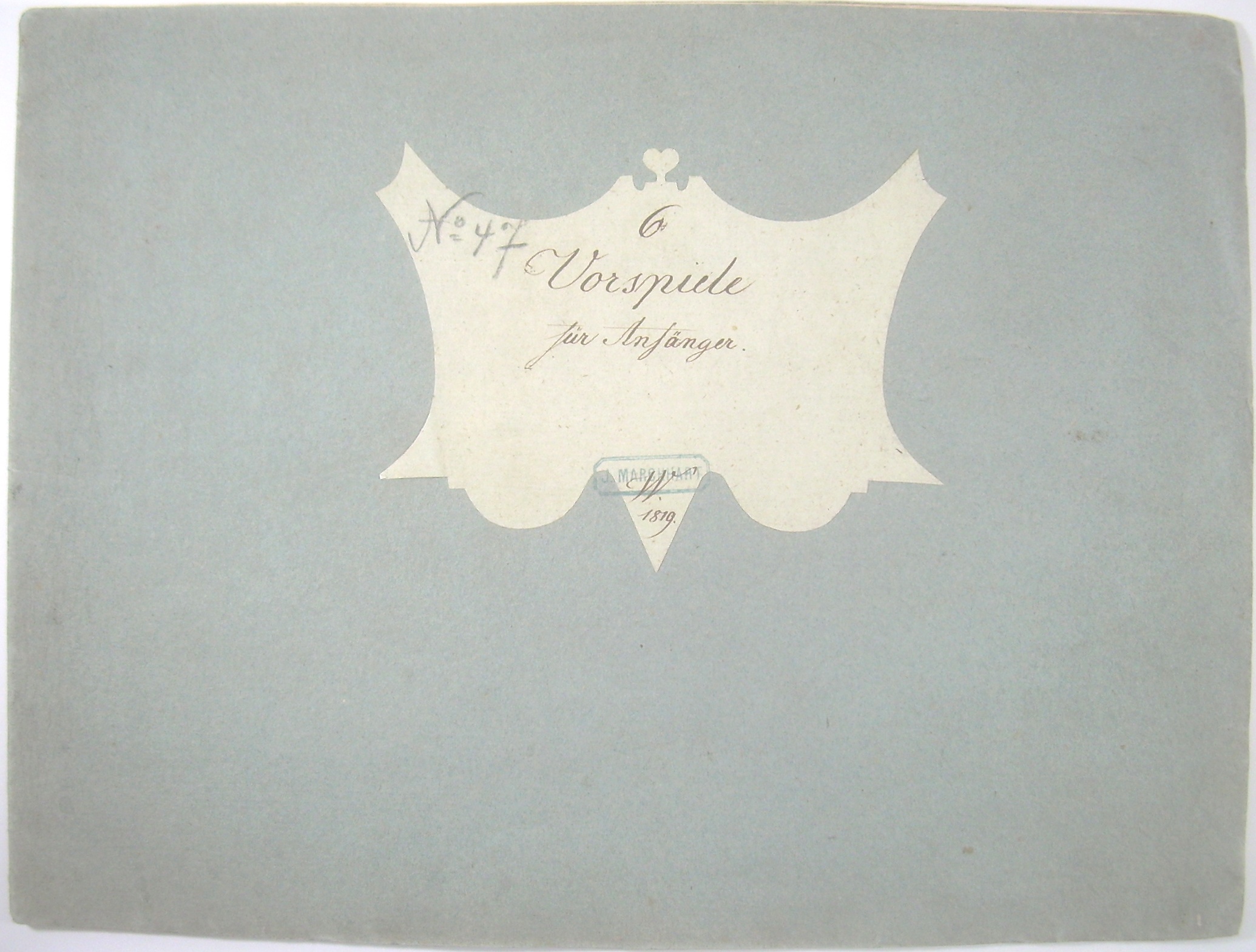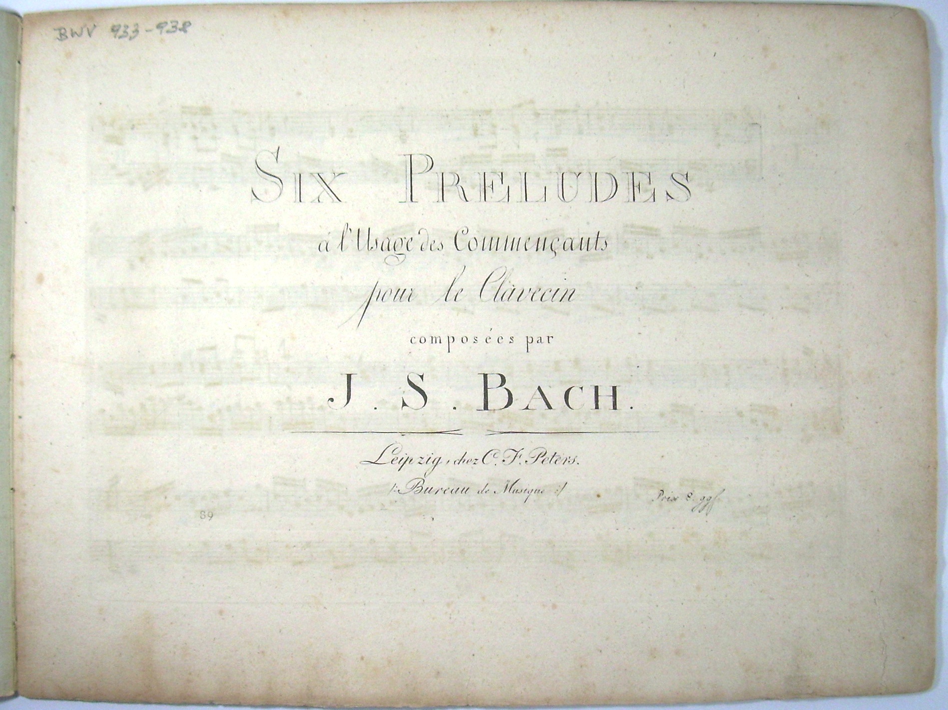 "Titelauflage mit neuem Verlagsnamen, Abzug von den Platten der Erstausgabe. - Die 6 Präludien waren wohl als Übungsstücke für die Kinder von Johann Sebastian Bach selbst gedacht und sind nur in Abschriften überliefert. Der Erstdruck erfolgte 1802 in Wien und Leipzig durch Hoffmeister und Kühnel in der Frühzeit des Verlages (PN 89) als Cahier IX der Oeuvres complettes."