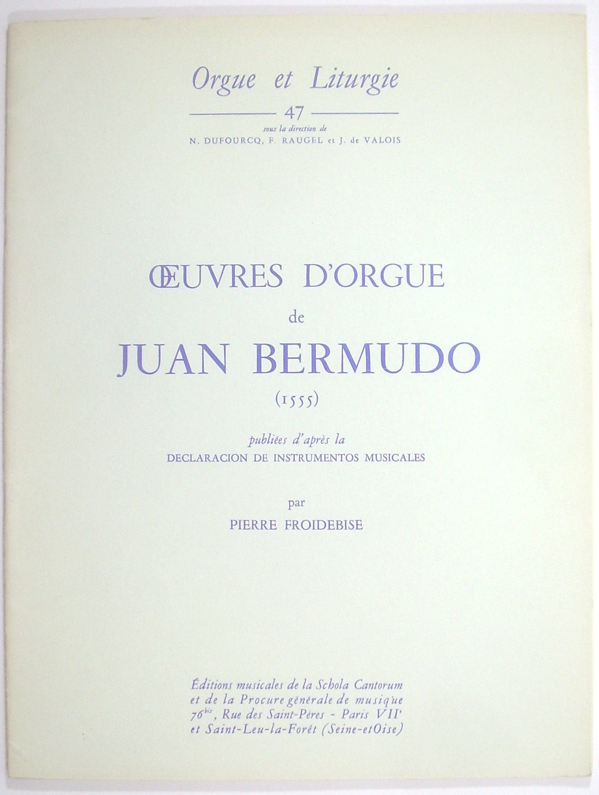 Oeuvres d'Orgue de Juan Bermudo (1555). Publiées d'après la declaracion de Instrumentos Musicales par Pierre Froidebise. Mit Registrierangaben