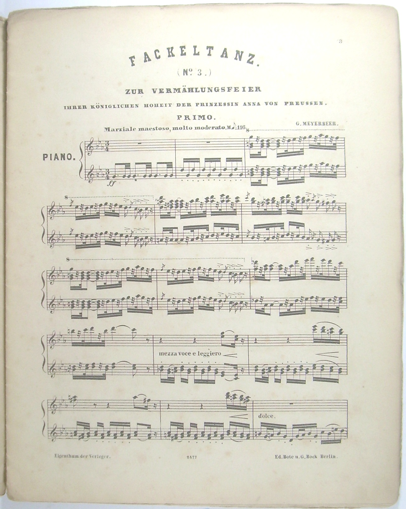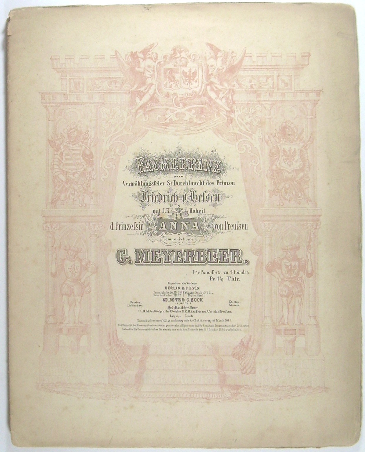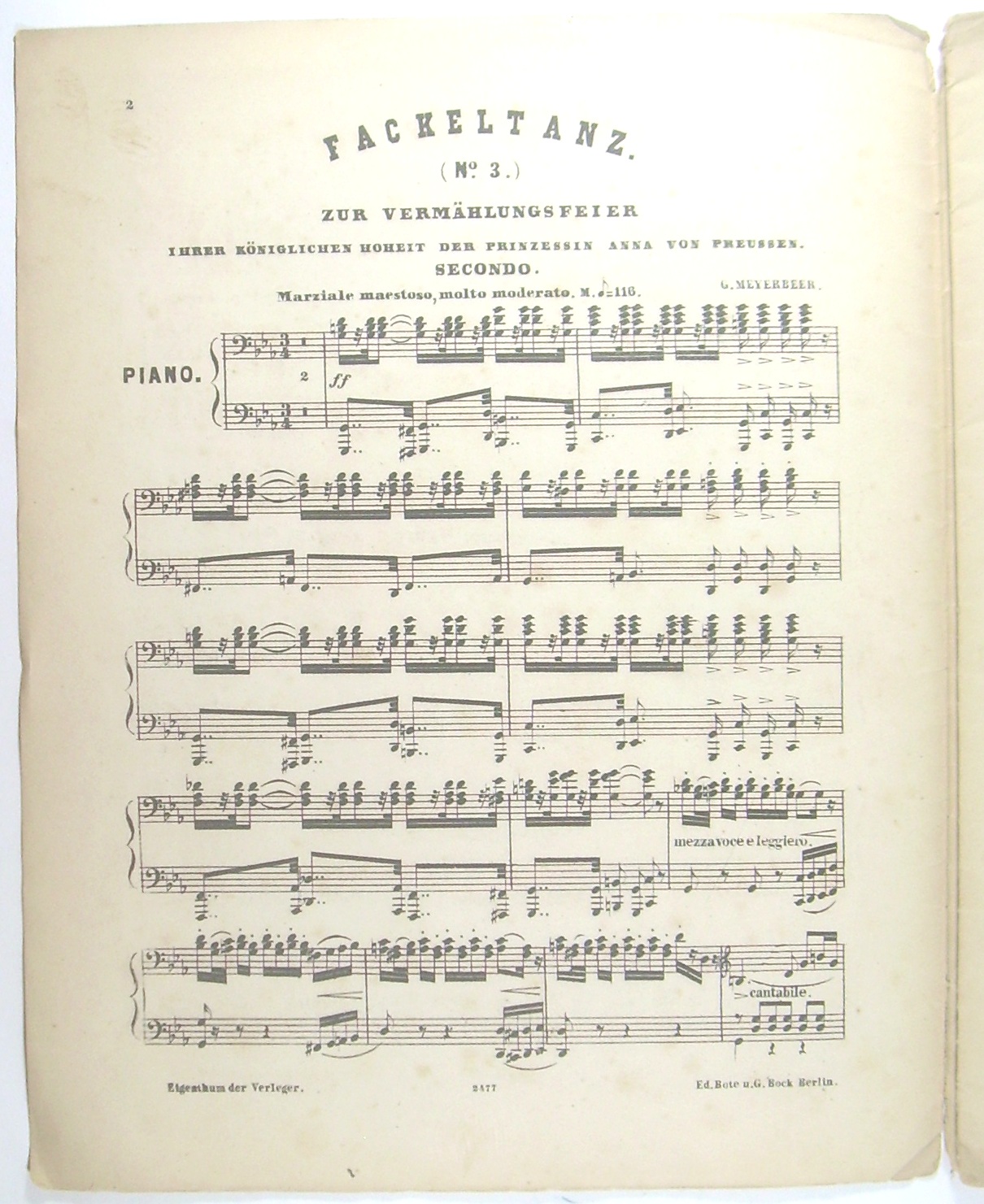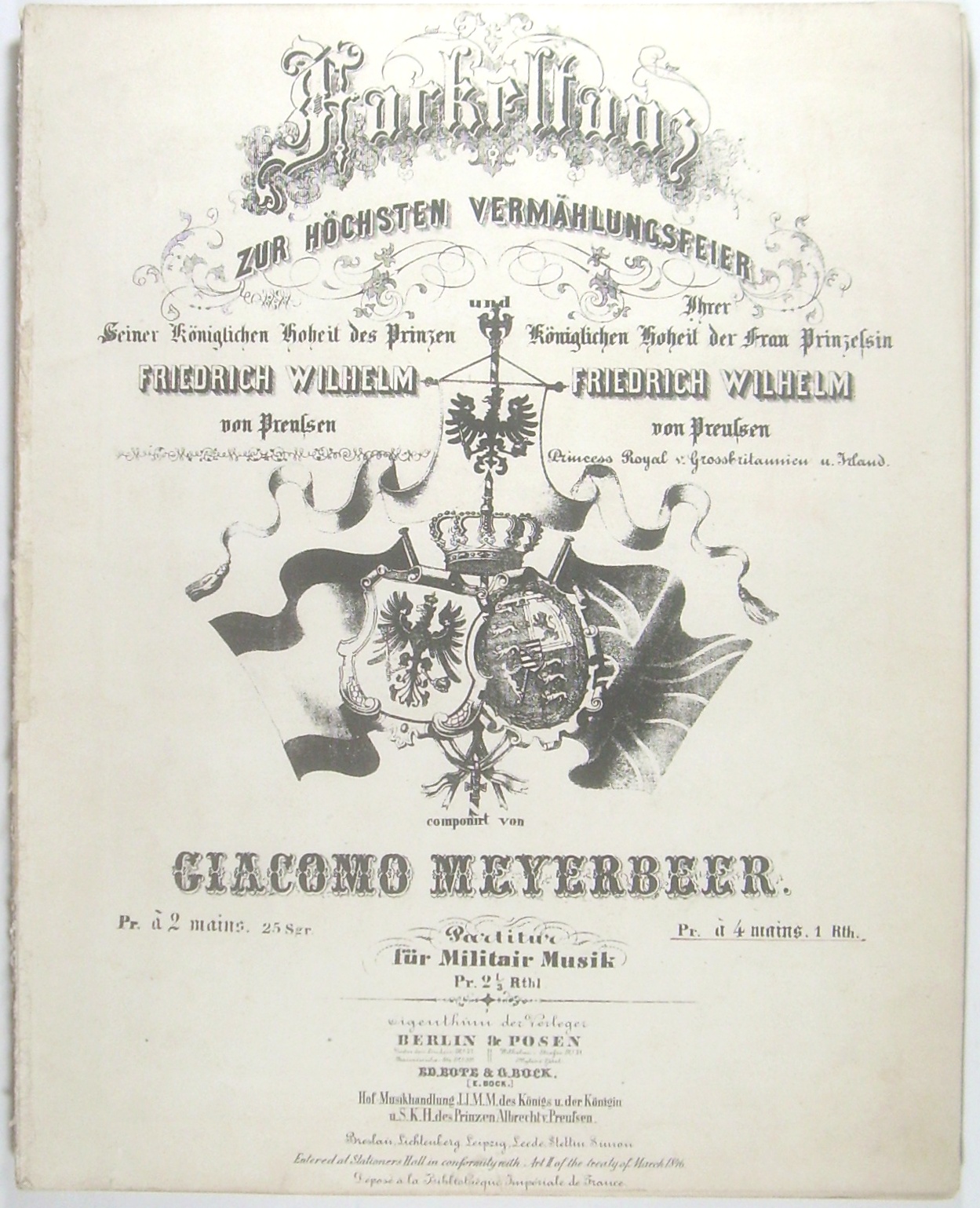 2 Königliche Hochzeits-Fackeltänze: 1. Fackeltanz [No. 3] zur Vermählungsfeier Sr. Durchlaucht des Prinzen Friedrich v. Hessen mit I. K. Hoheit d. Prinzessin Anna von Preussen. Für das Pianoforte zu 4 Händen. / 2. Fackeltanz zur höchsten Vermählungsfeier Seiner Königlichen Hoheit des Prinzen Friedrich Wilhelm von Preussen und Ihrer Königlichen Hoheit der Frau Prinzessin Friedrich Wilhelm von Preussen [sic!].