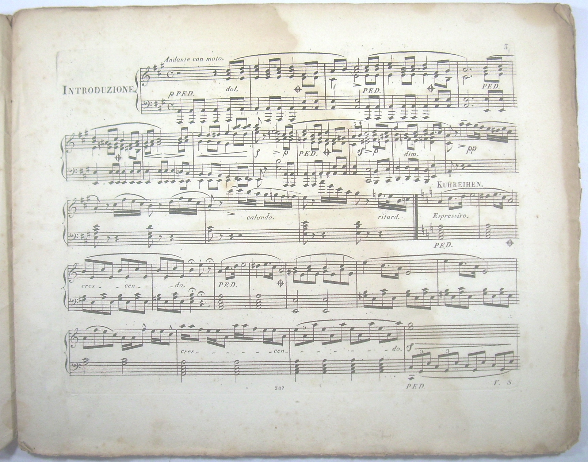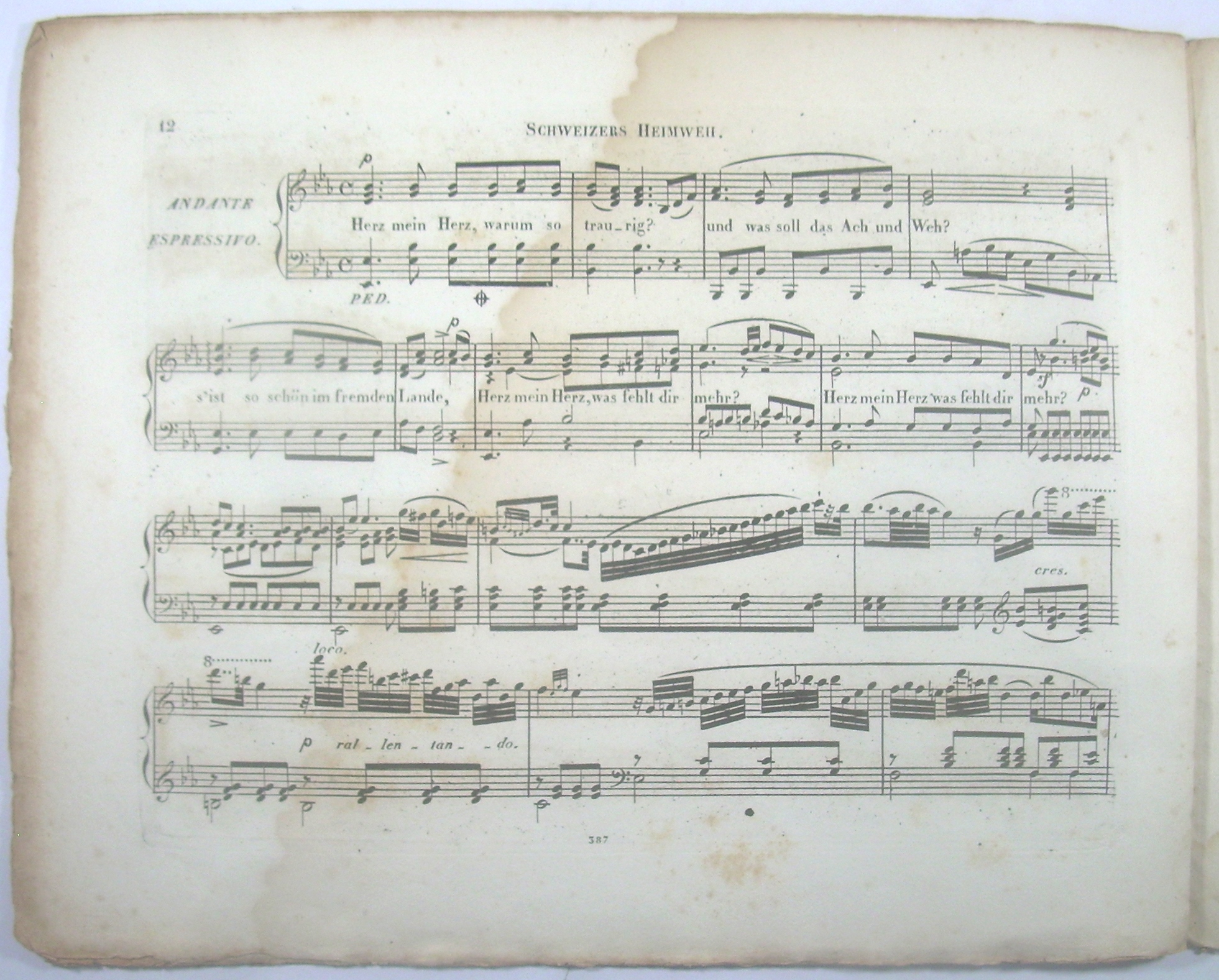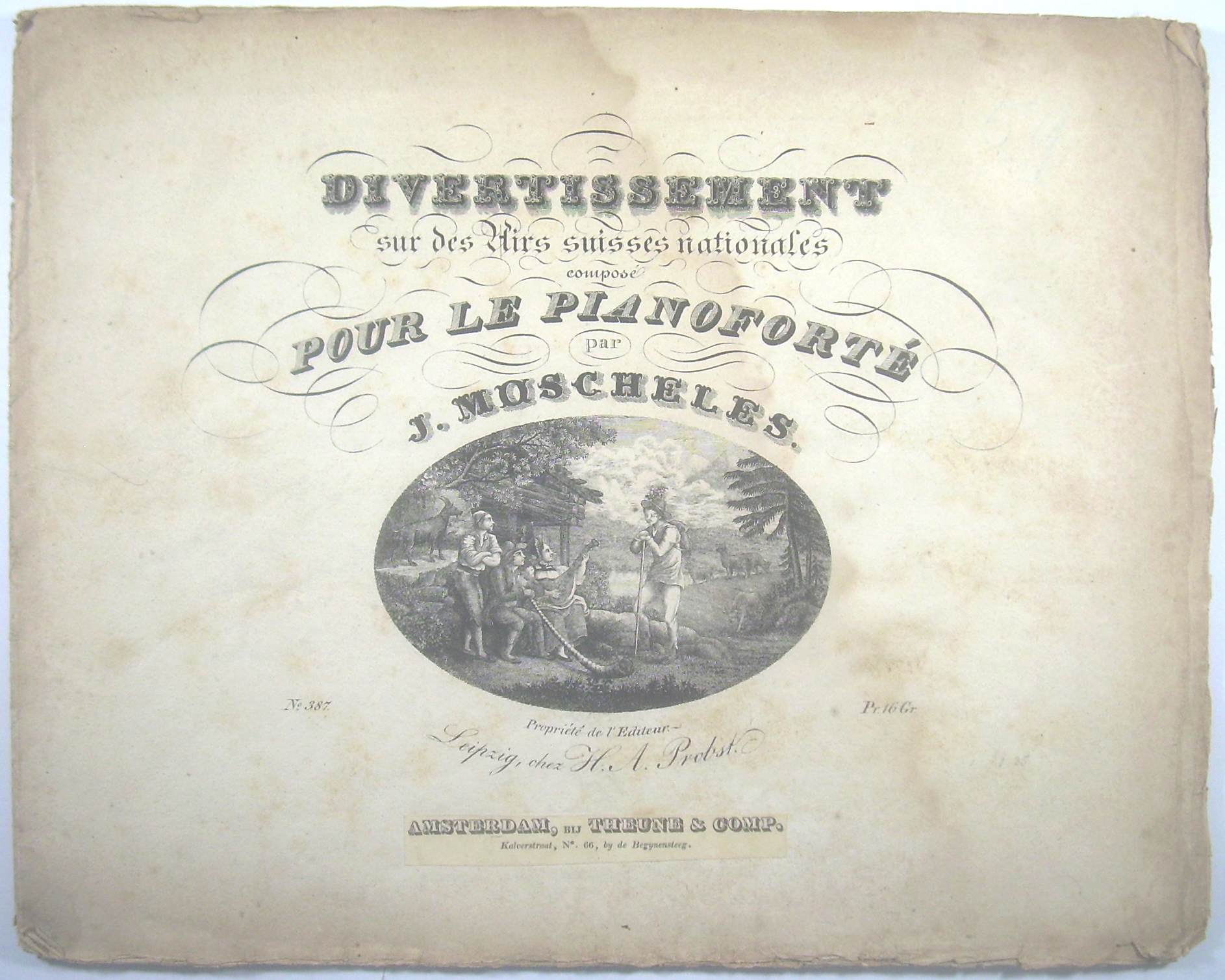 Querformat 27x34 cm, 17 Seiten gestochen, Titel mit idyllischer schweizer Almszene (Wanderer stehend vor sitzender Sennerin mit Laute und Senner mit Alphorn vor Unterstand, dahinter Ziegen und Kühe), original ungebunden, unbeschnitten, mit großem Feuchtigkeitsfleck.
