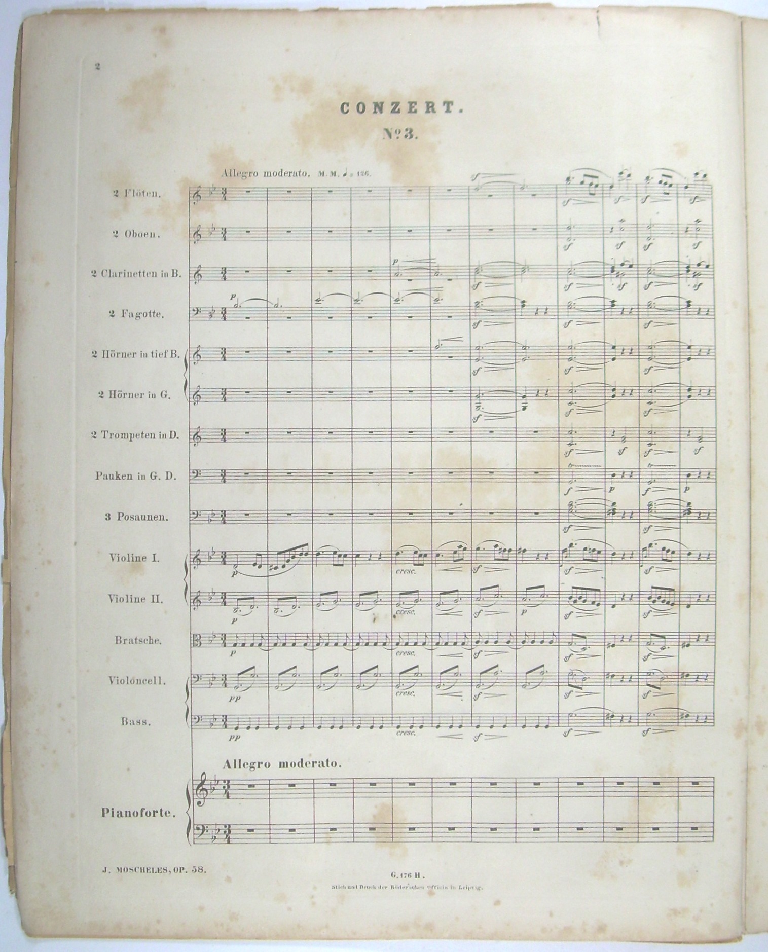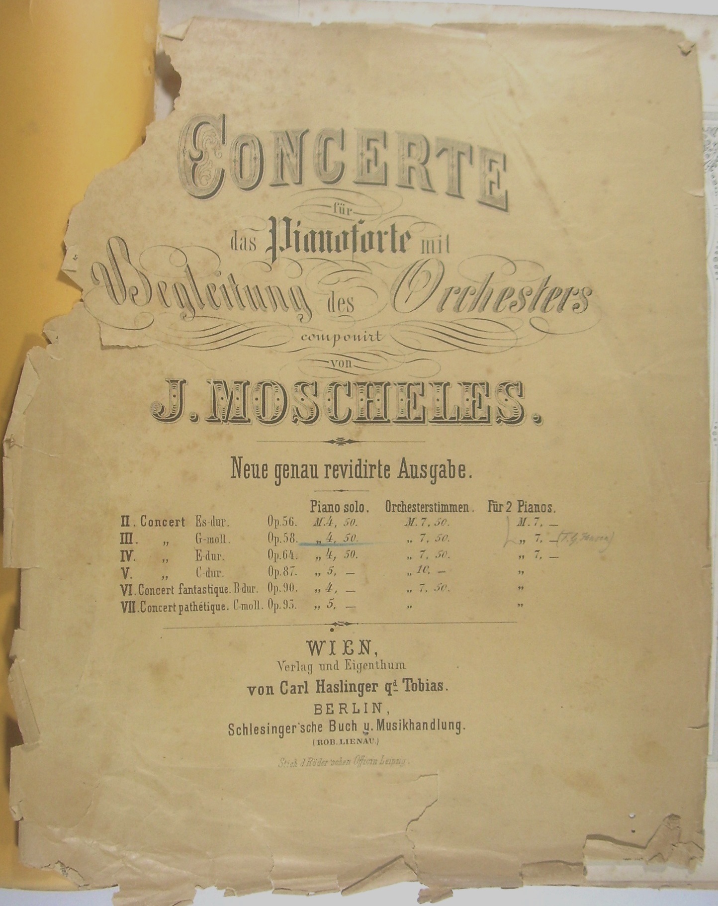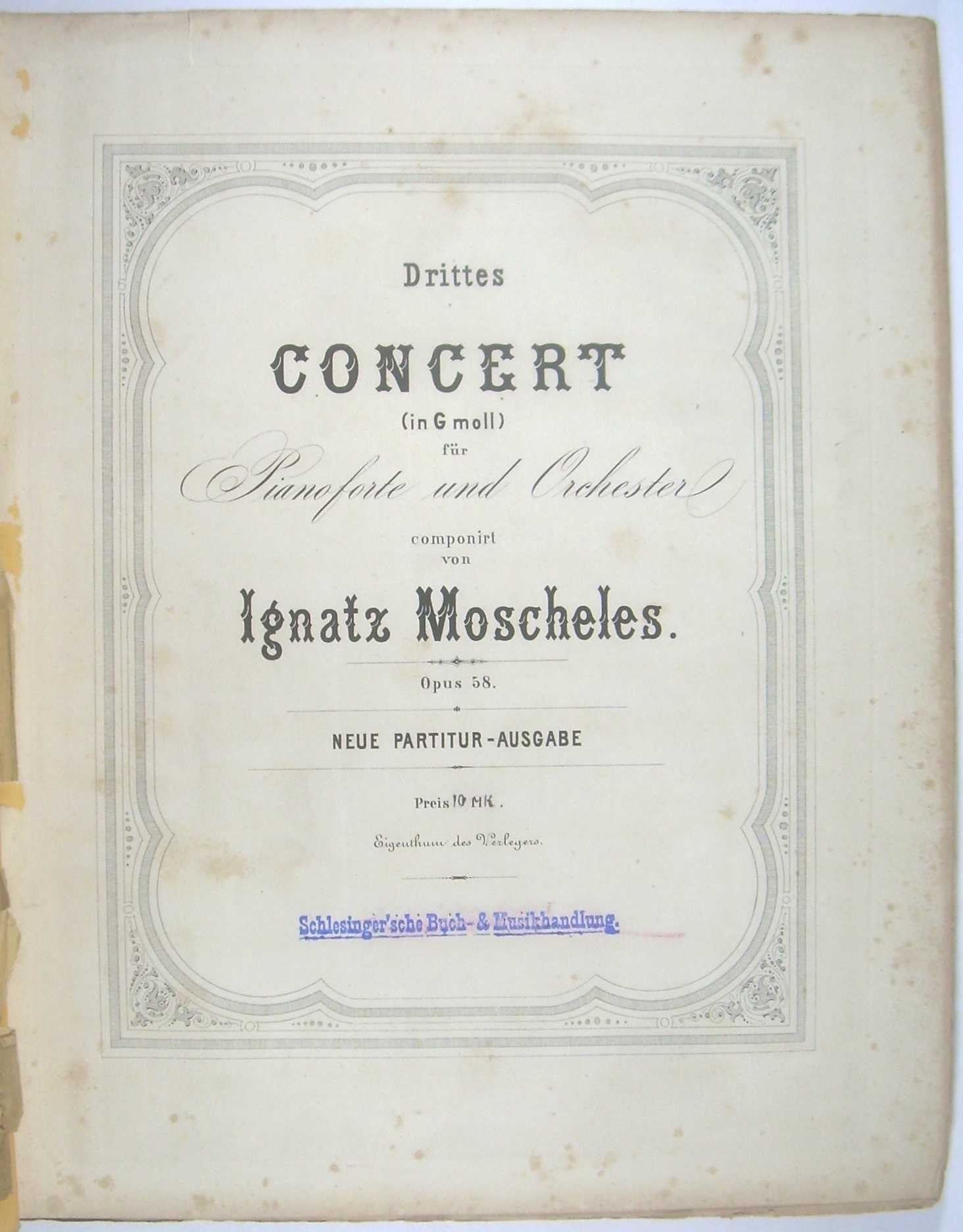 "* Aus dem Vorbesitz von Ernst Rudorff, der das Konzert Ende des 19. Jh. für 2 Klaviere bearbeitete (Steingräber 960 [1900]). - Datierung: Partitur nach PN, Klavierauszug Hofmeister XIX Dezember 1877. - Das Konzert in g-moll op. 58 von 1824 gehört zu den erfolgreichsten Kompositionen von Moscheles, wie die noch 2 Generationen später erfolgten Neuausgaben und Bearbeitung zeigen."