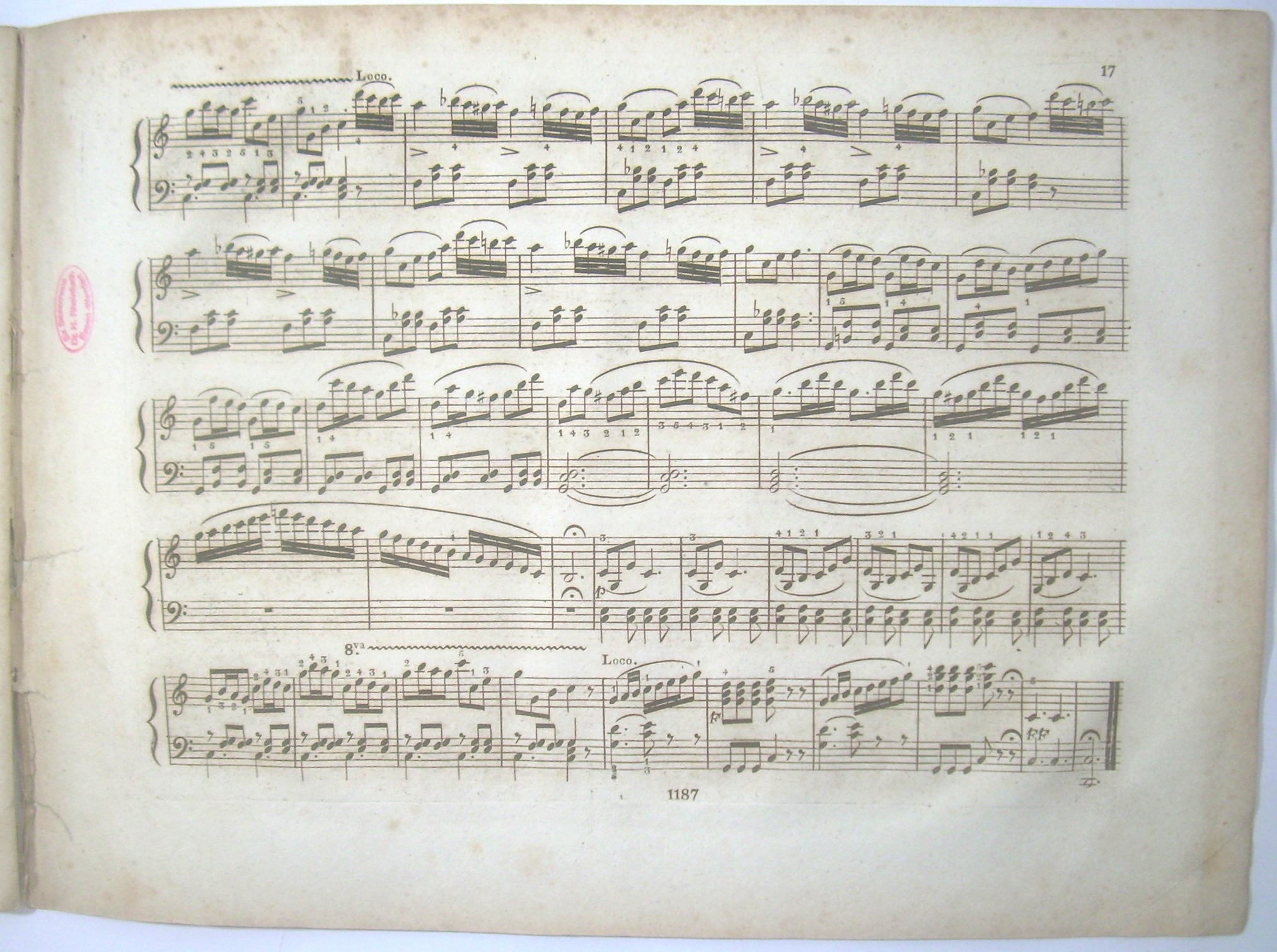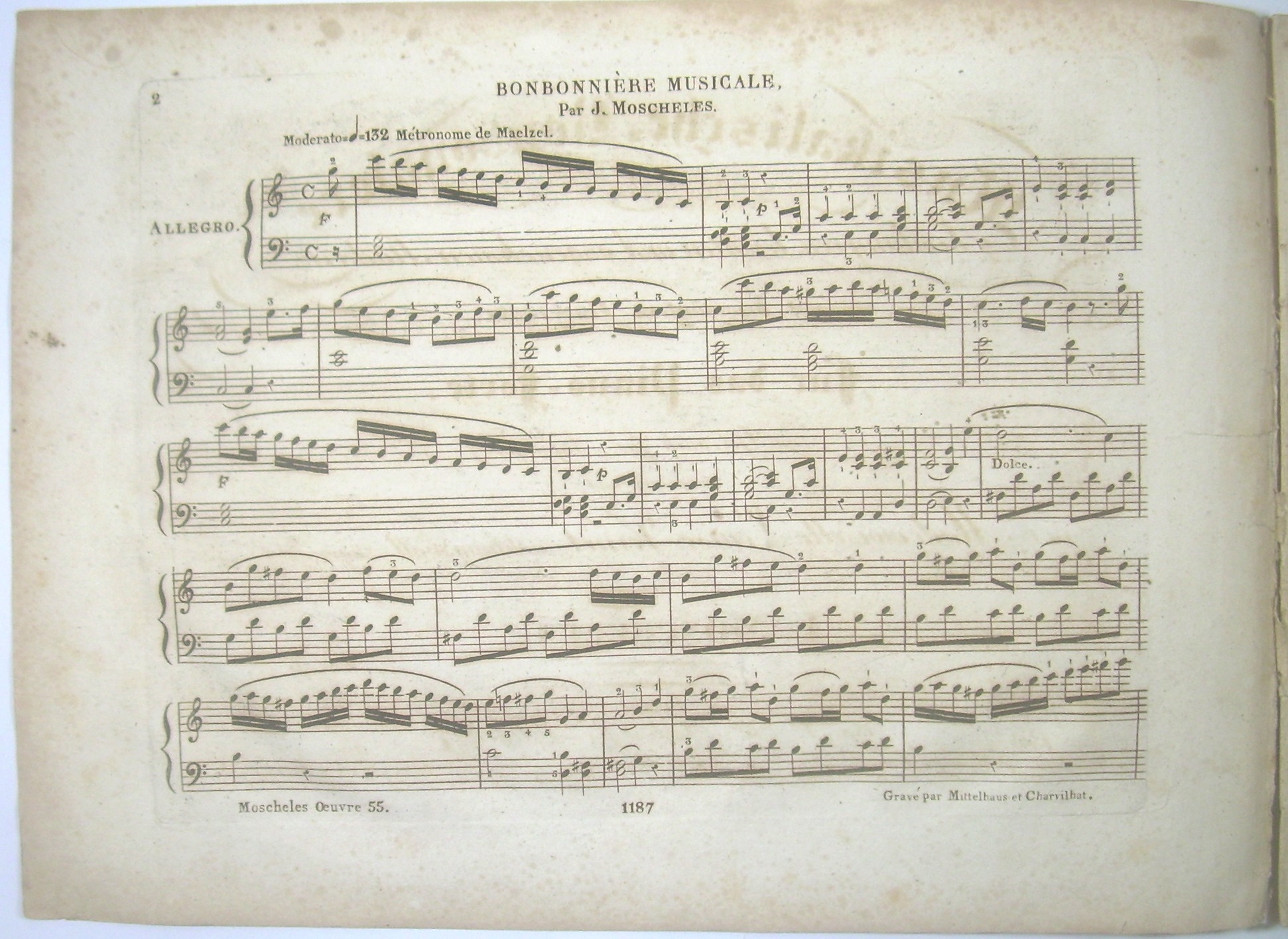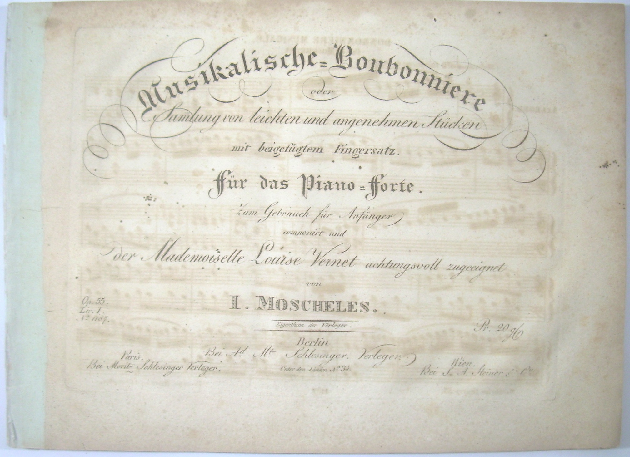 Sehr seltene Originalausgabe ("Eigenthum des Verlegers"), mit den zusätzlichen Händlerangaben Maurice Schlesinger, Paris und S. A. Steiner, Wien. Kein weiteres Exemplar der Schlesingerausgabe in den Internetkatalogen, KVK nur mit späteren Nachdrucken aus Mannheim, Wien (Diabelli) und Mainz (Schott). - Moscheles widmete seine "Bonbonnière musicale" (Kopftitel auf S. 2.) der kleinen Tochter des französischen Malers und Lithographen Horace Vernet (1789-1863), den er 1821 in Paris kennengelernt hatte. 1822 zurück in London wurde "endlich die Herausgabe der Bonbonniere musicale eingeleitet, deren 1. Heft Moscheles der kleinen Tochter von Horace Vernet widmet, während der Vater ein reizendes Titelkupfer dazu zeichnet." ("Aus Moscheles Leben, herausgegeben von seiner Frau", Leipzig 1872, S. 69). Die Vignette/Titelkupfer (Moscheles am Klavier stehend, Notenblätter an 5 kleine Mädchen verteilend) ist als Einzelblatt in der BnF vorhanden, aber kein Exemplar eines Notendruckes mit dieser Vignette über das Internet nachweisbar. - Louise Vernet, hier noch ein kleines Mädchen, bezauberte zehn Jahre später in Rom Felix Mendelssohn Bartholdy (Brief an den Vater 17.01.1831) und Berlioz, der ihr hier 1832 das Lied "La Captive" H.60 widmete.