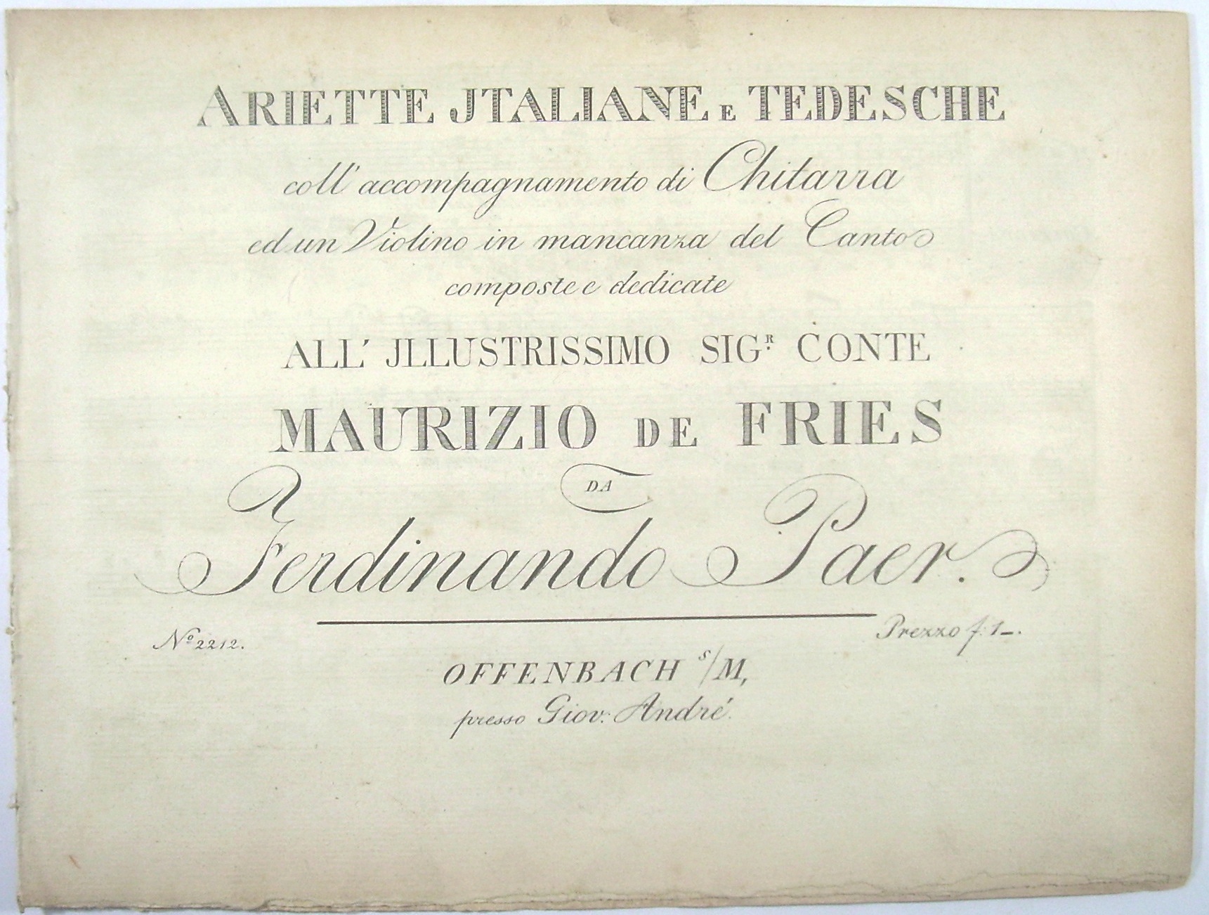 Ariette italiane e tedesche coll'accompagnamento di Chitarra ed un Violino in mancanza del canto e dedicate all'Illustrissimo Sgr. Conte Maurizio de Fries.
