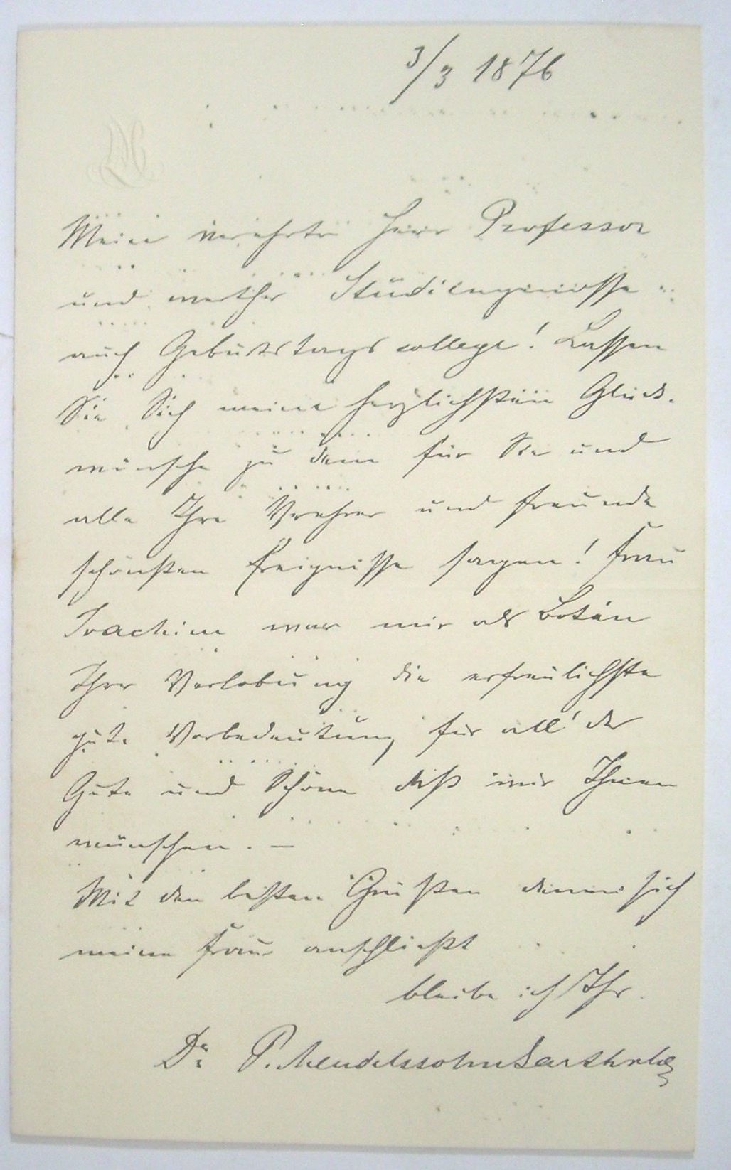 "Mein verehrter Herr Professor und werther Studiengenosse, auch Geburtstagscollege! Lassen Sie sich meine herzlichsten Glückwünsche zu dem für Sie und alle Ihre Verehrer und Freunde schönsten Ereignisse sagen! Frau Joachim war mir als Botin Ihrer Verlobung die erfreulichste gute Vorbedeutung für all‘ das Gute und Schöne daß wir Ihnen wünschen. Mit den besten Grüssen denen sich mein Frau anschließt bleibe ich Ihr Dr. P. Mendelssohn Bartholdy". - Der Sohn von Felix Mendelssohn Bartholdy, Paul Mendelssohn Bartholdy (1841-1880), Chemiker und Industrieller, gründete zusammen mit S. A. Martius die Firm Agfa (Aktiengesellschaft für Anilinfabrikation). Paul wuchs nach dem frühen Tod der Eltern im Haus seines Onkels, des Bruders von Felix Mendelssohn Bartholdy, auf. - Die Freundschaft der Familie Rudorff mit den Mendelssohns geht bereits auf die frühere Generation zurück. Der Adressat des Briefes, der spätere Komponist und Berliner Klavierprofessor Ernst Rudorff (1840-1916) hatte als Kind gemeinsam mit Paul Mendelssohn Bartholdy und dessen Cousin Ernst Lejeune Dirichlet (1840-1868, Sohn von Felix Mendelssohn Bartholdys Schwester Rebecka) Privatunterricht. Die im Brief angesprochene Frau Joachim ist Amalie Joachim (1839-1899), die Frau des Violinvirtuosen und Gründungsdirektors der Berliner Hochschule für Musik Joseph Joachim (1831-1907); beide standen mit Rudorff jahrzehntelang in freundschaftlich-vertruatem Verhältnis.
