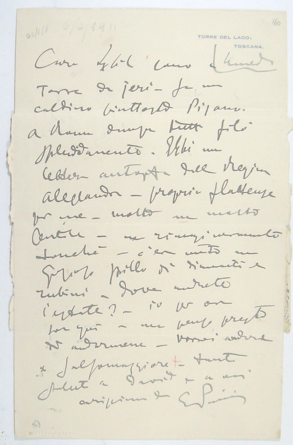 25x16 cm, 1 Seite, gefaltet, auf Briefpapier mit gedrucktem Briefkopf "Torre del Lago, Toscana", mit eigenhändiger Adresse verso, (2 Briefmarken, 3 Poststempel). Kleine Bleiftifteinträge am oberen Rand, eine kleine Markierung mit Rotstift im Text. Der Brief oben in Bleistift nummeriert "160".