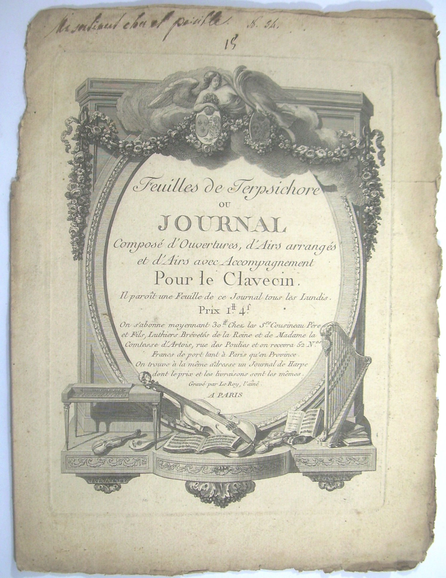 Louis-Charles Ragué (1744-1793), belgischer Komponist und Harfenist. Nach seinem Studium bei Sacchini in Rom tritt Ragué in die Dienste des Bischofs von Namur François-Marie de Lobkowitz, den er 1776-1777 an den Hof von Friedrich II von Preussen begleitet. 1783 erscheint in Brüssel sein Op. 1 "Trois sonates pour la harpe avec accompagnement de clavecin, ou de violon obligé dédiées à Madame le princesse de Ligne née princesse de Massalska", danach geht Ragué nach Paris. Seine Symphonien op. 10, Friedrich II. gewidmet, und 1787 von Boyer gedruckt, sind ein großer Erfolg bei den Concert spirituel, und zeigen den Einfluss der Mannheimer Schule. Nach dem Misserfolg seiner ersten Oper "Memnon" (1784) wird seine zweite Oper "L’amour filial" (1786) gut aufgenommen. - Für die in Paris unter Marie Antoinette so populäre Harfe schuf Ragué zahlreiche Kompositionen, arrangierte Werke von Pleyel und gab seine "Principes de harpe suivis de 18 airs d'une difficulté graduelle pour servir d'exemples" und "L'Art de pre´luder sur la harpe" heraus. - Das Musikperiodikum "Feuilles de Terpsichore, ou, Journal pour le clavecin composé d'ouvertures, d'airs arrangés et d'airs avec accompagnement. Il paroît une feuille de ce journal tous les lundis." erschien in Paris wöchentlich 1784-1799.