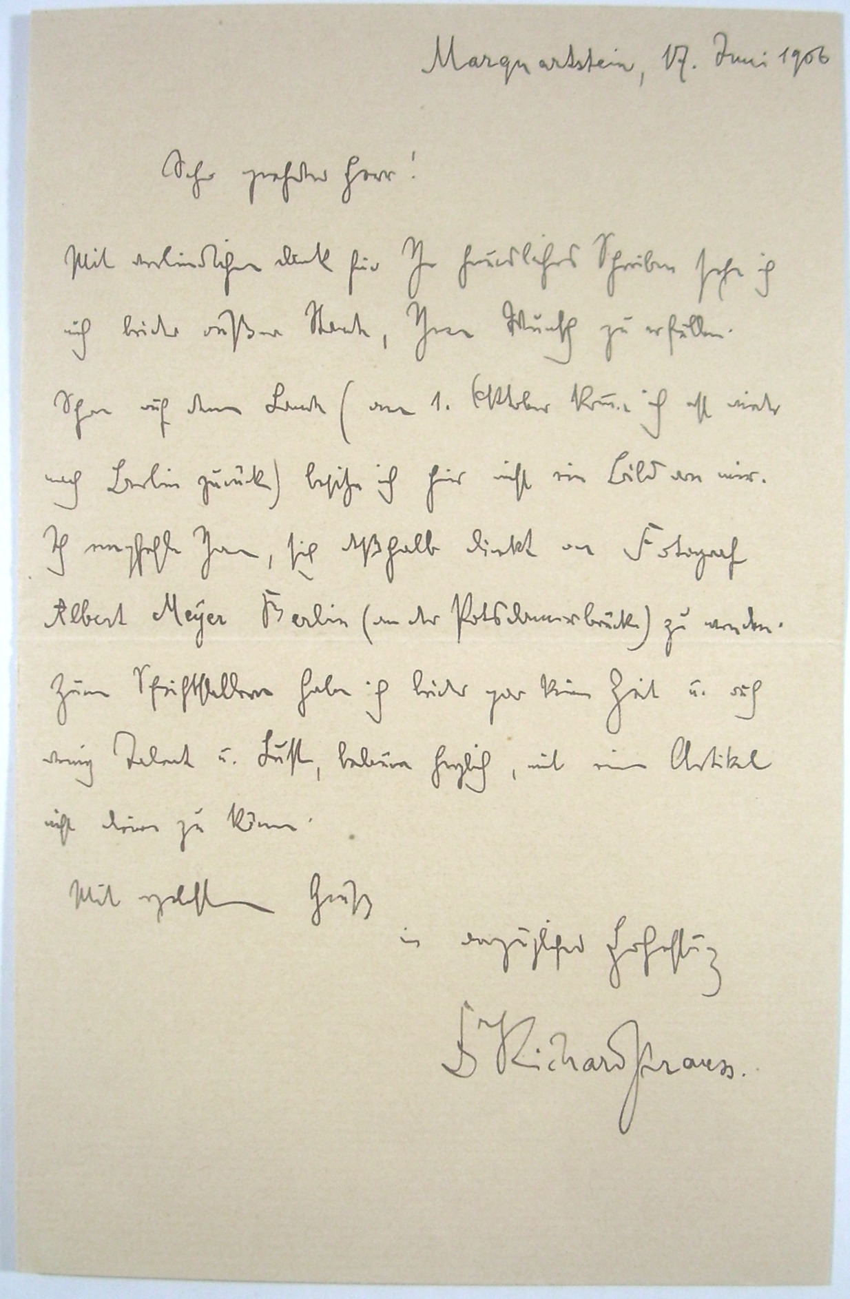 "Sehr geehrter Herr! Mit verbindlichem Dank für Ihr freundliches Schreiben sehe ich mich leider außer Stande, Ihren Wunsch zu erfüllen. Schon auf dem Lande (am 1. Oktober komme ich erst wieder nach Berlin zurück) beistze ich hier nicht ein Bild von mir. Ich empfehle Ihnen, sich deshalb direkt an Fotograf Albert Meyer Berlin (an der Potsdamerbrücke) zu wenden. Zum Schriftstellern habe ich leider gar keine Zeit u. auch wenig Talen u. Lust, bedaure zugleich, mit einem Artikel nicht dienen zu können. Mit ergebenstem Gruß In aufrechter Hochachtung Dr. Richard Strauss." - Ausführlich-höfliches Absage-Schreiben an den Theaterkritiker und Redakteur der "Bunten Blätter" in Berlin Dr. Rudolf Presber (1868-1935), der auch als Dramatiker und Drehbuchautor reüssierte.