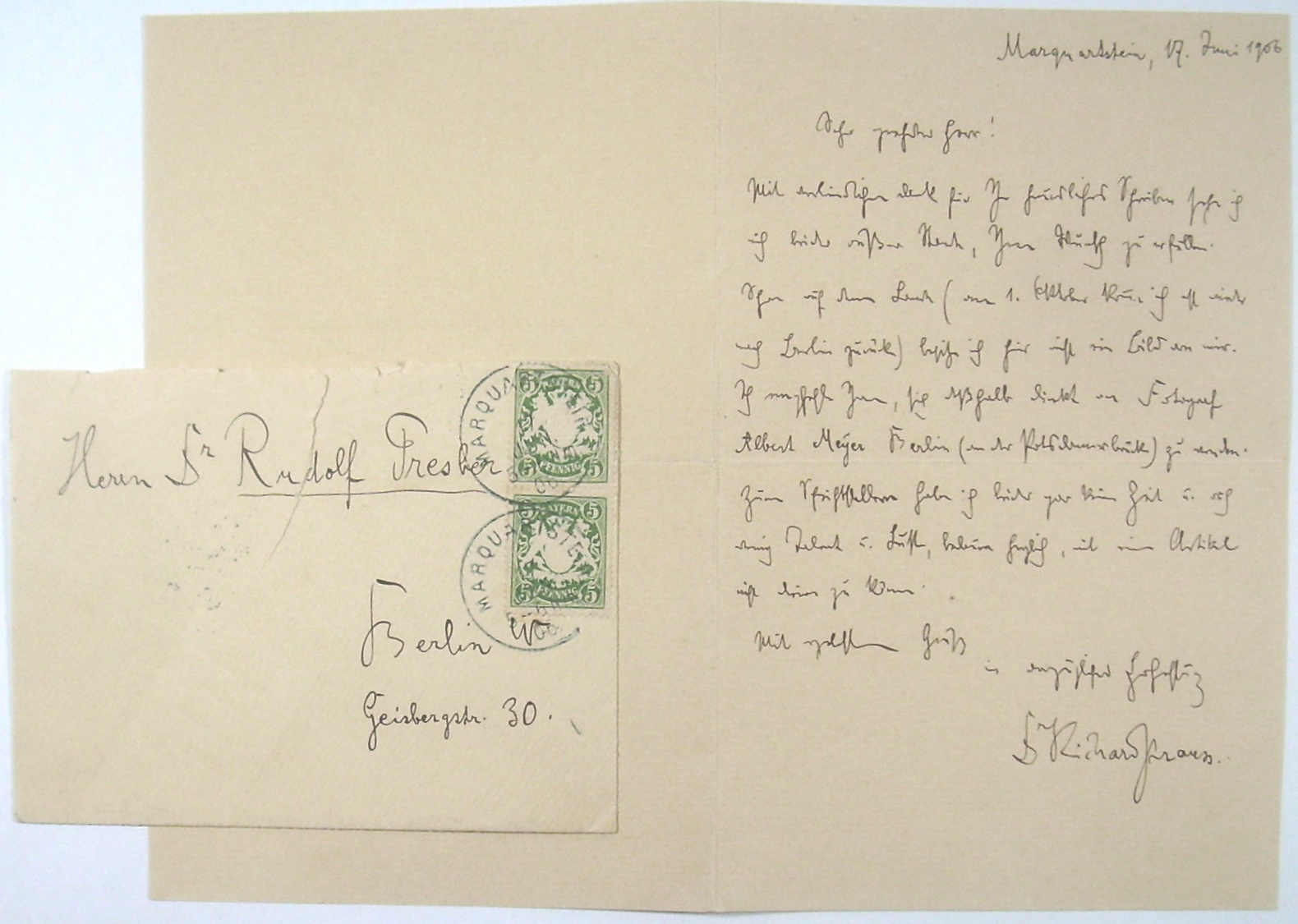 Eigenhändiger Brief, signiert, mit eh. Kuvert an Dr. R. Presber 17.06.1908 wegen Foto und Artikel.