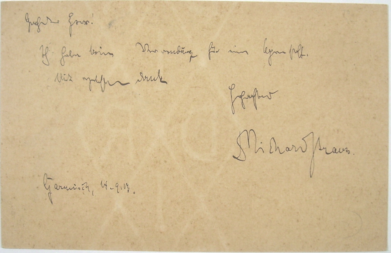 "Geehrter Herr! Ich habe keine Verwendung für einen Opernstoff. Mit ergebenstem Dank Hochachtend Dr. Richard Strauss. Garmisch, 14.9.13".