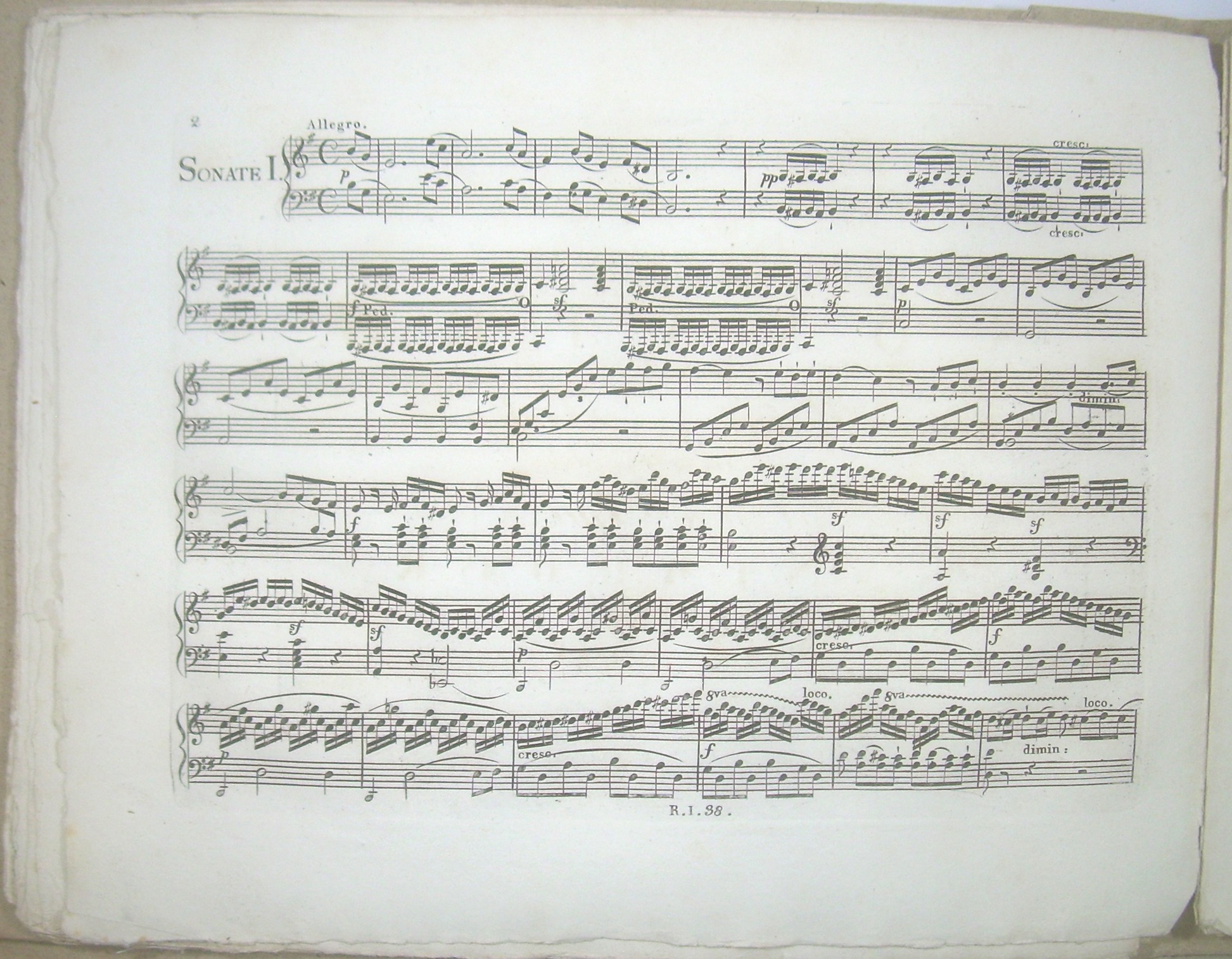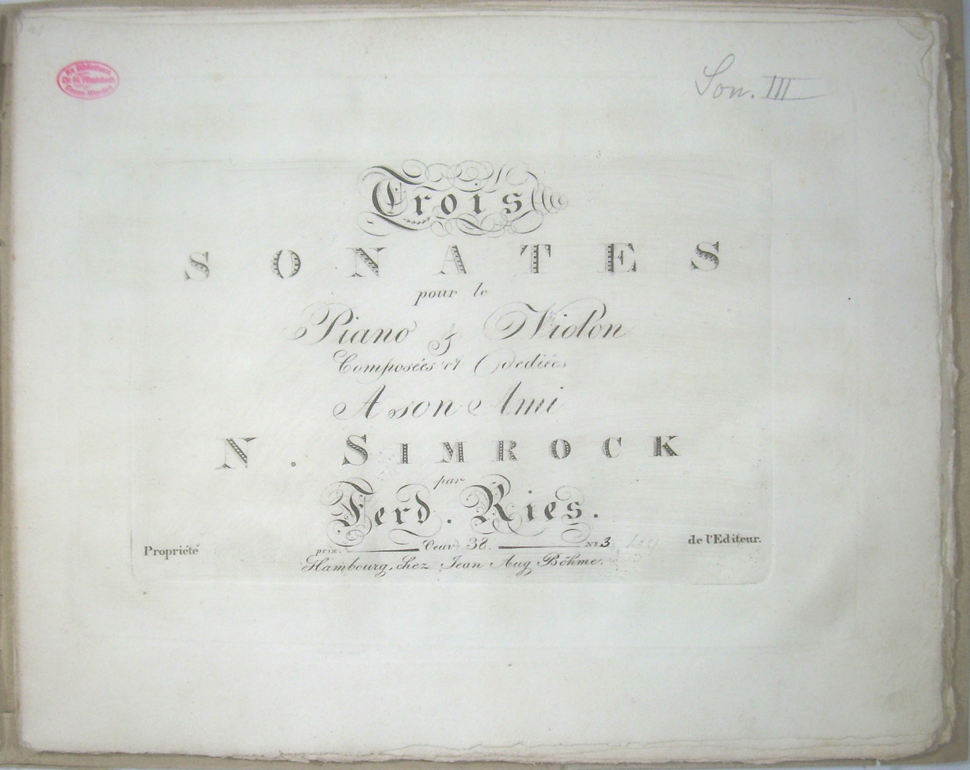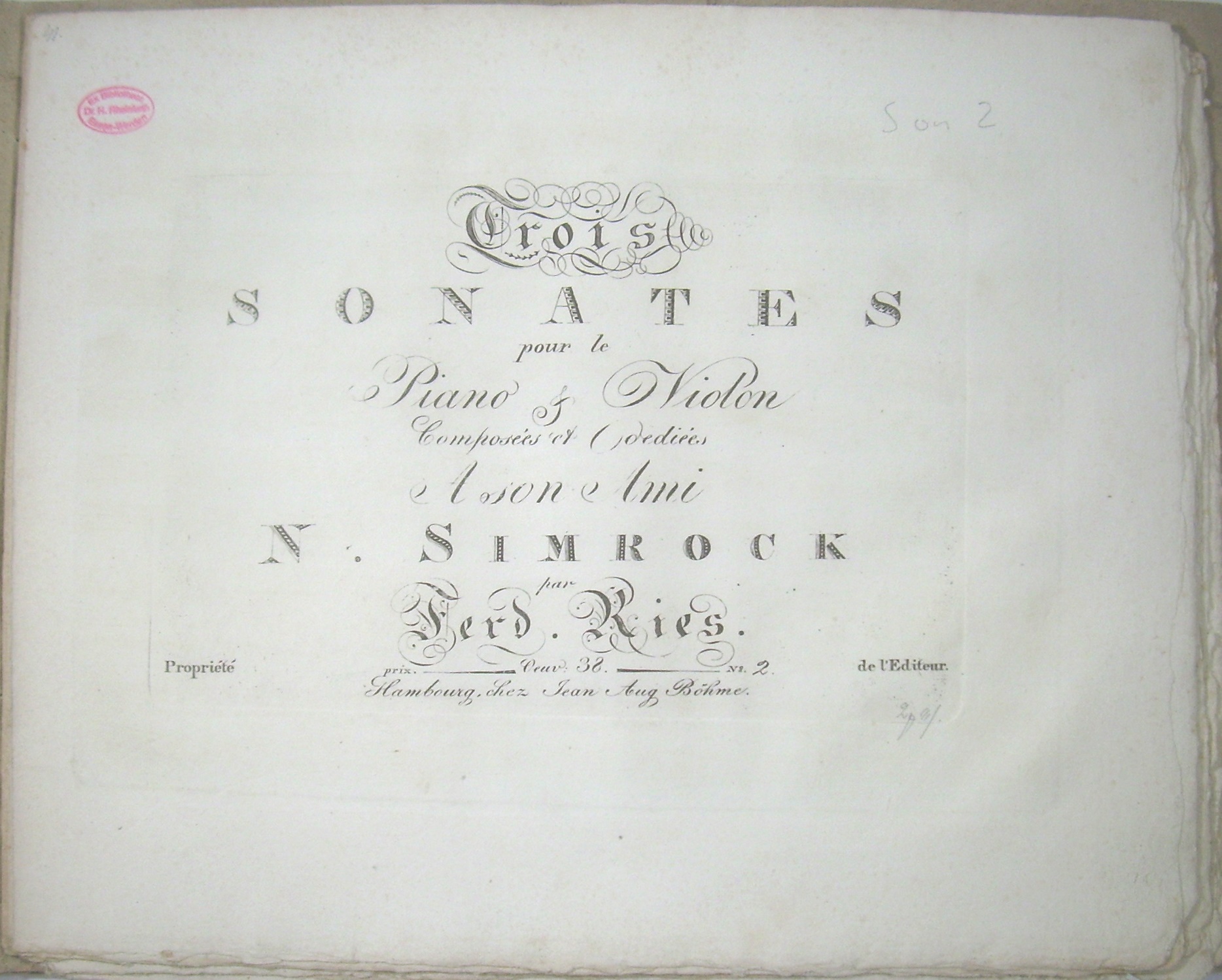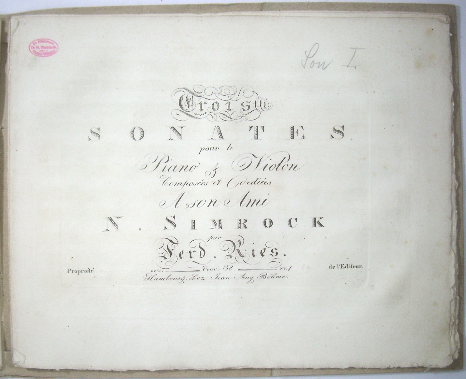 * Hill, S. 33, Beethoven-Haus Bonn C RIES / 38, dort nur Sonate 1. - Vermutlich vom Verlag selbst in grauen Interimsumschlägen geheftet, und aussen handschriftlich bezeichnet: Klavierumschlag "Ries 3 sonante Piano ouvre 38", Violinumschlag "Oeuvres 38", ein Irrtum, denn es handelt sich bei der Violinstimme die 3 Sonaten op. 16. - Der verlagsfrische, ungebrauchte Zustand erklärt, warum der Irrum bis dato nicht aufgefallen ist, auch nicht dem Vorbesitzer und Sammler Hans Rheinfurth.