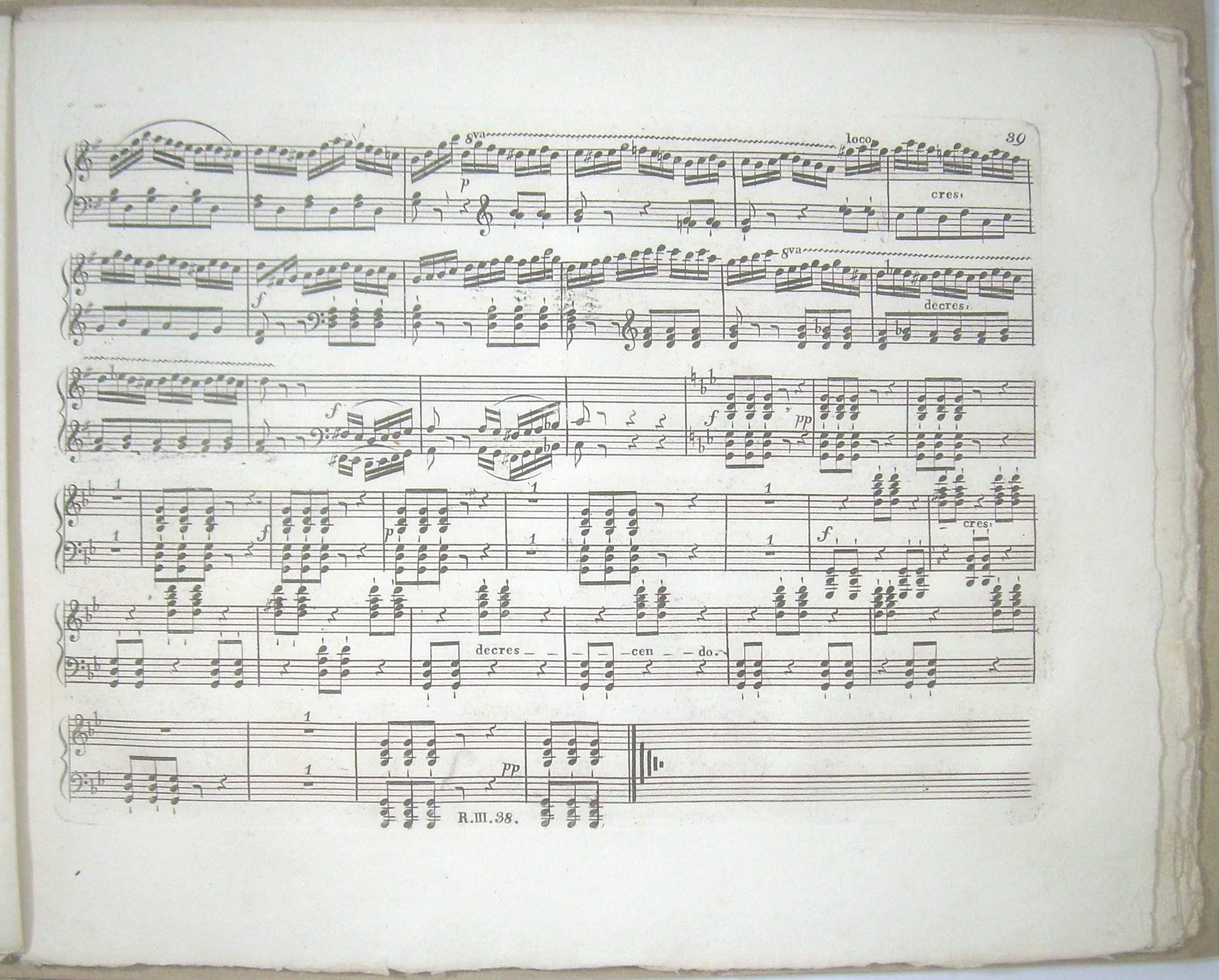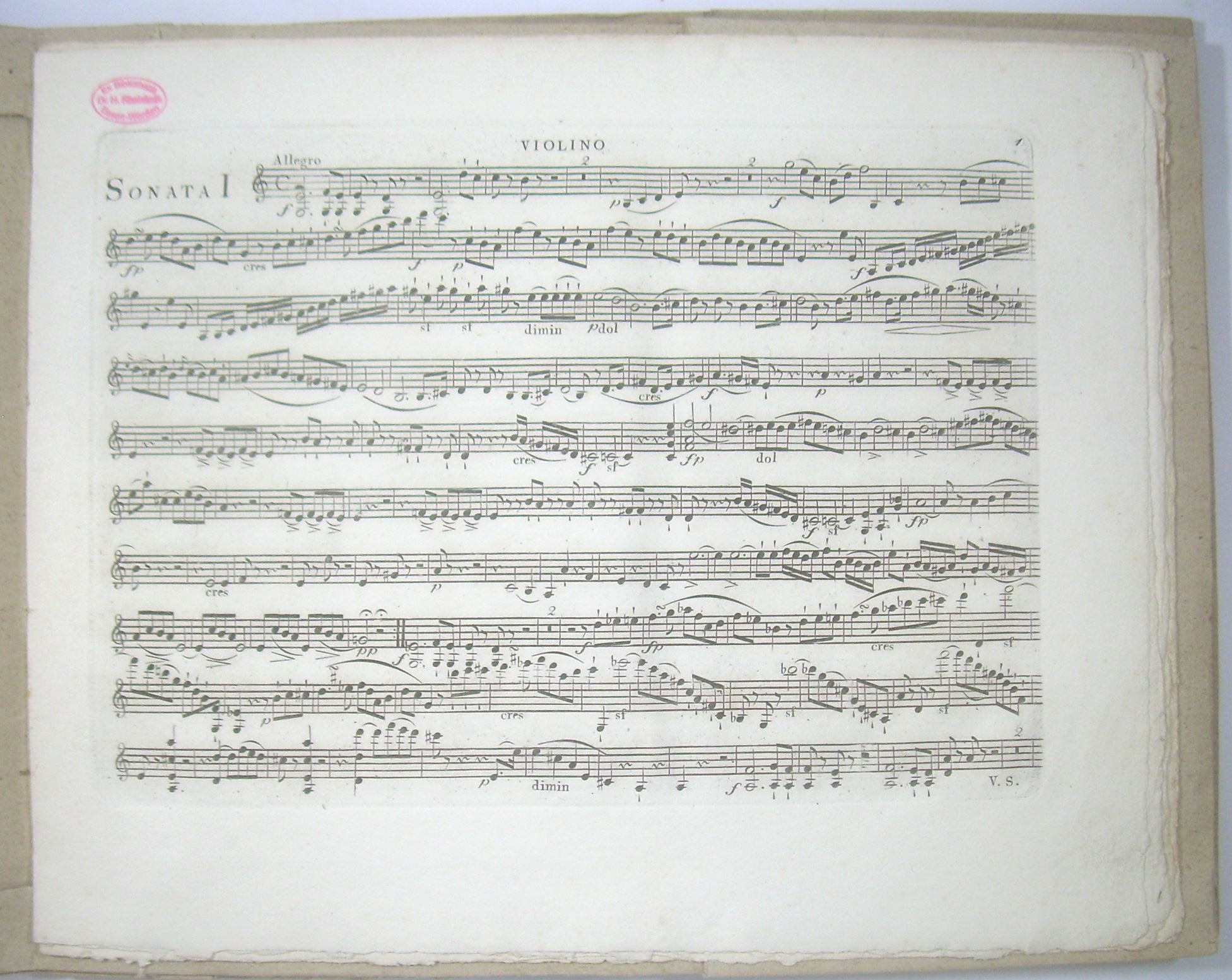 Querformat 29x36 cm, 2 Stimmmen: 39, 14 Seiten gestochen, Klavierstimme mit 3 Titelblättern, Violinstimme ohne Titel und PN. Verlagsfrischer Originalzustand, unbeschnitten, in grauen Karton geheftet, unbenutzte saubere Exemplare in Bestzustand. Beide Stimmen mit dem Sammlerstempel "Rheinfurth" auf dem Titelblatt bzw der ersten Seite.