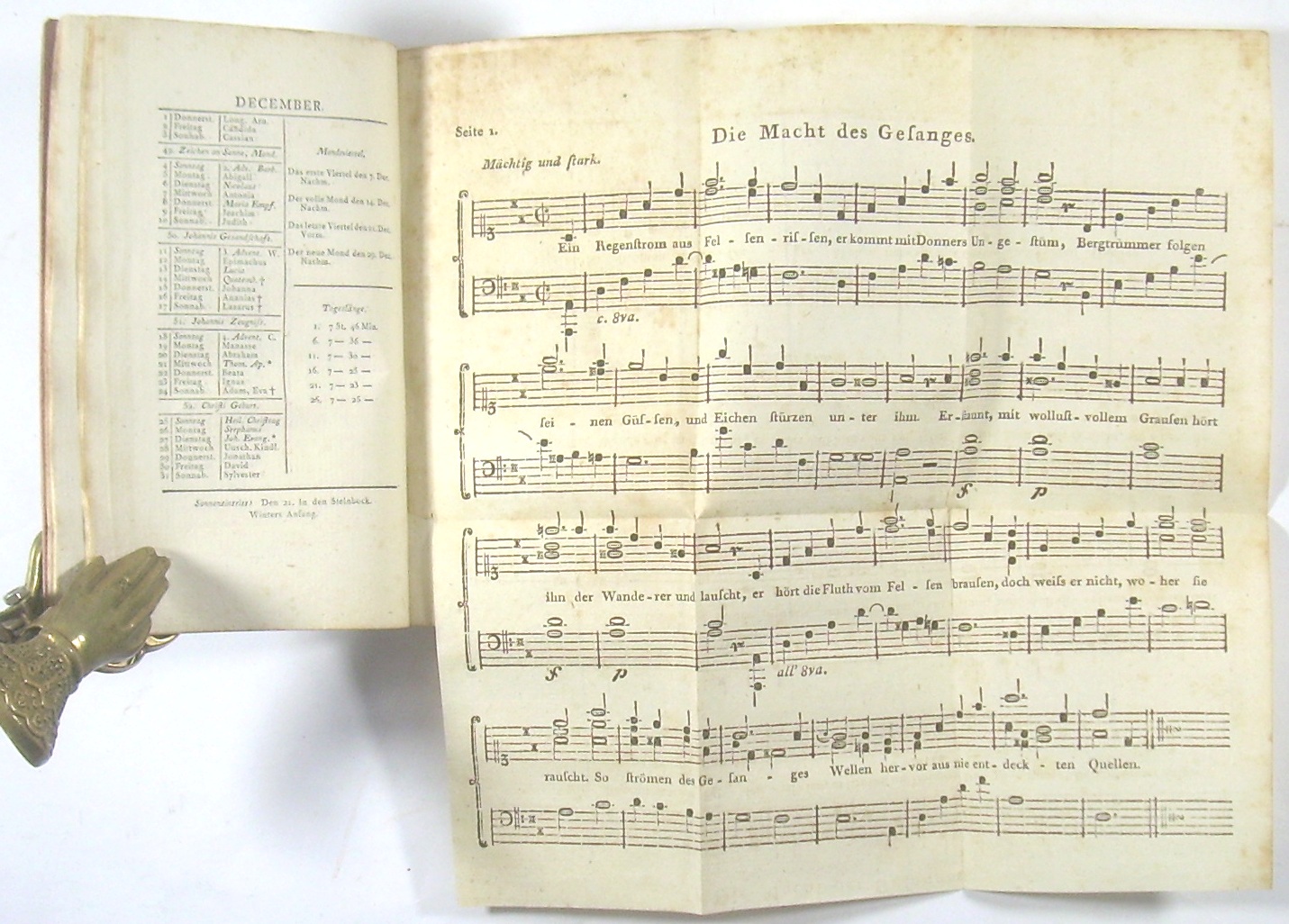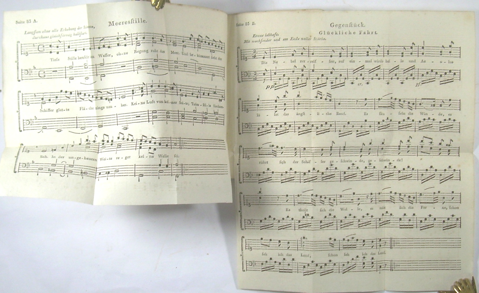 14,5x9 cm. 13 Bl., 260, (4) Seiten, ohne Frontispiz, mit Kalendarium und allen 8 Musikbeilagen, darunter die Vertonung des Doppelgedichts Meeres Stille und Glückliche Fahrt. Illustrierter Originalkarton, sehr gut erhal.ten