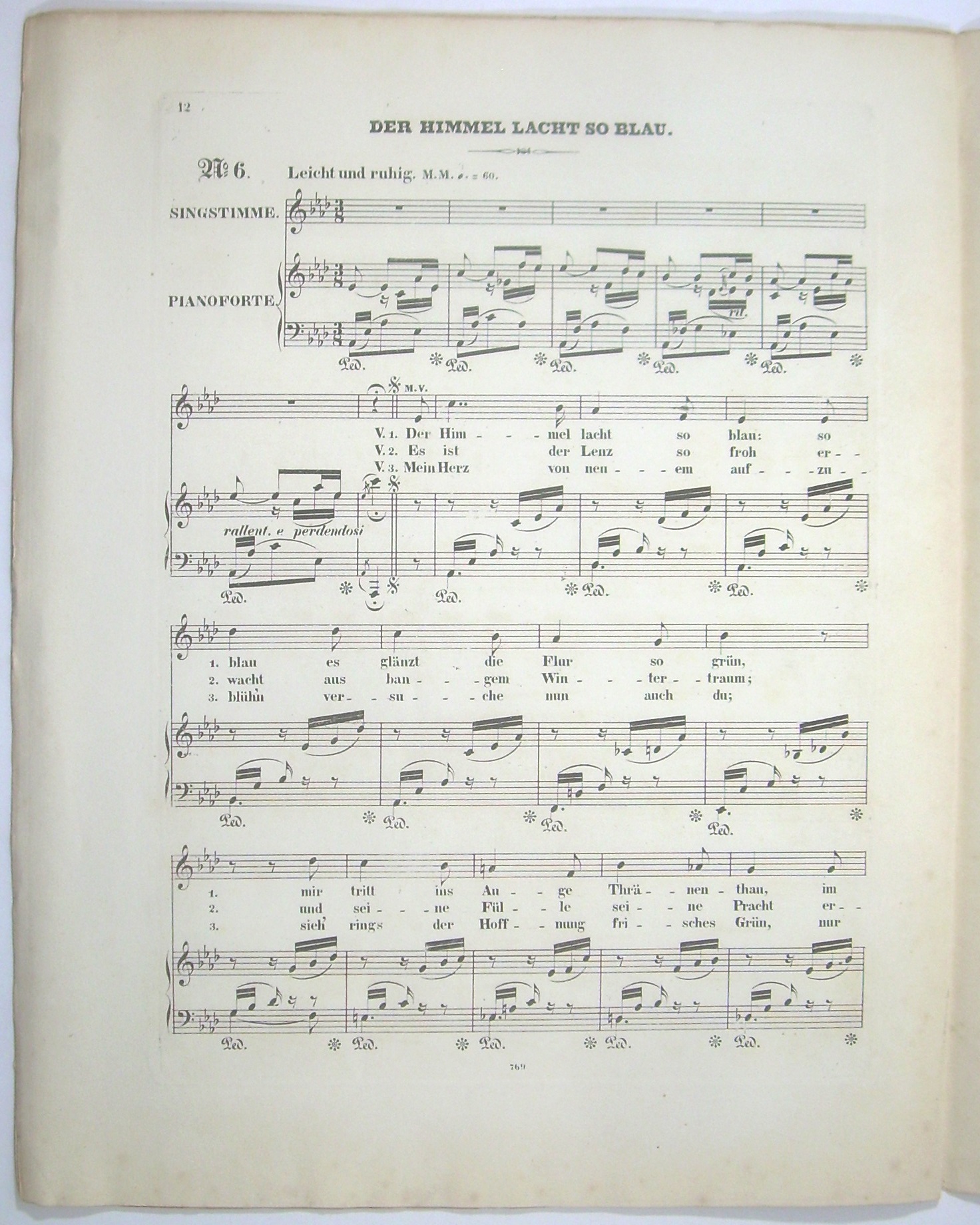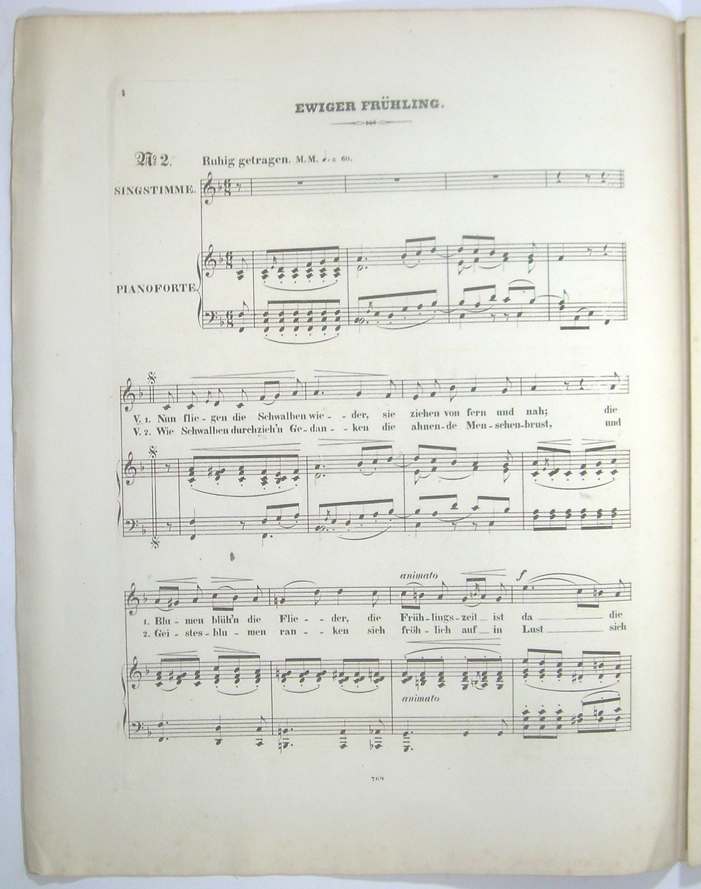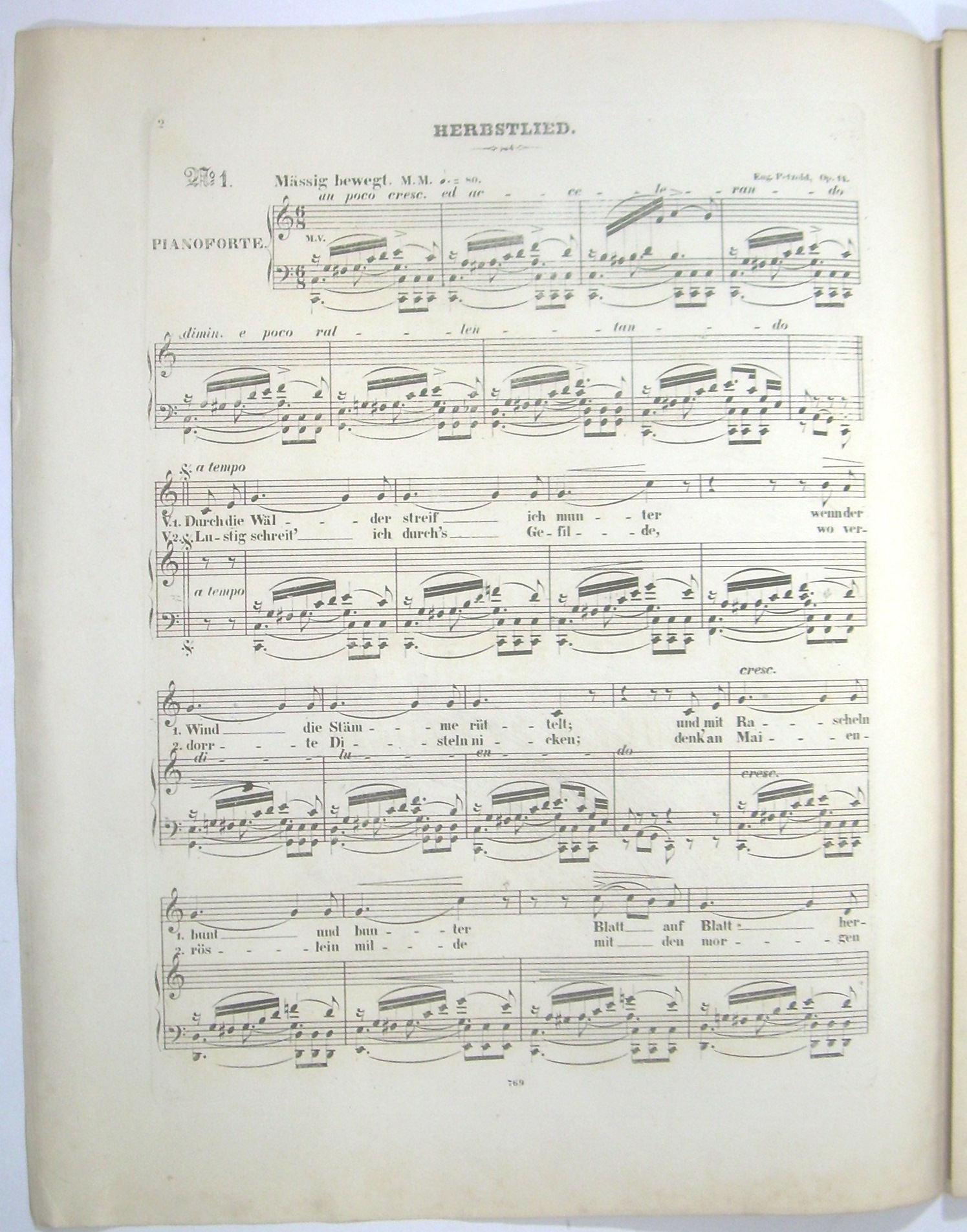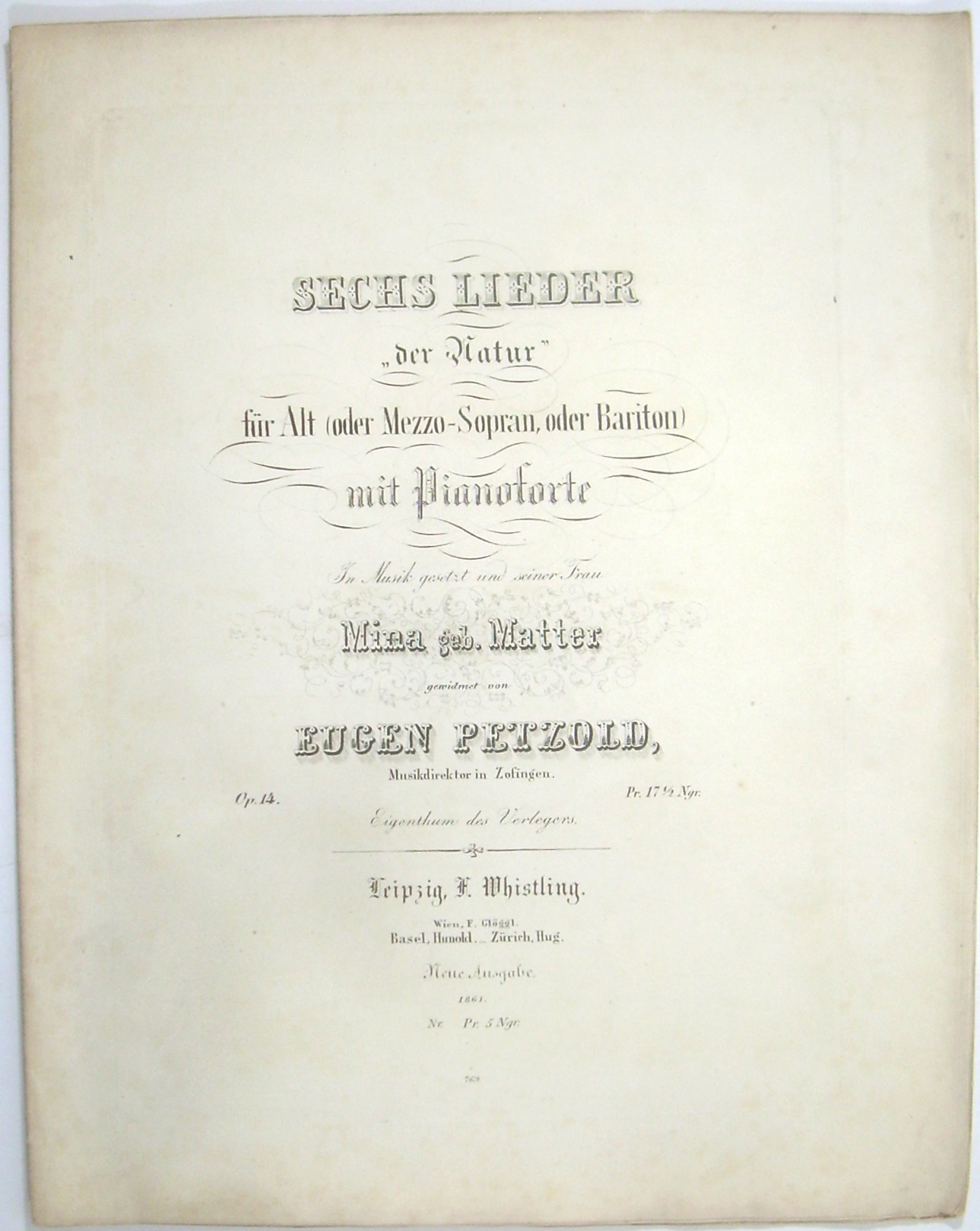 Eugen Petzold (1813-1889), Komponist, Dirigent, Organist und Gesangslehrer. Nach seinem Studium in Leipzig wechselte Petzold auf Empfehlung von Robert Schumann in die Schweiz und wurde 1844 Musikdirektor in Zofingen. - Seine "Sechs Lieder" op. 14, seiner Frau Mina gewidmet, hier bereits in 2. Auflage: 1. Herbstlied (Sallet), Ewiger Frühling (Schultes), Sehnsucht nach den Bergen (Schultes), Morgenwanderung (Geibel), Der gefangene Sänger (Schenkendorf), Der Himmel lacht so blau (Ruperti).