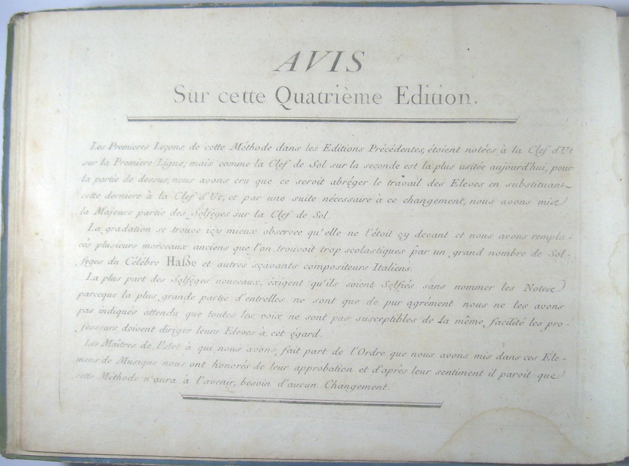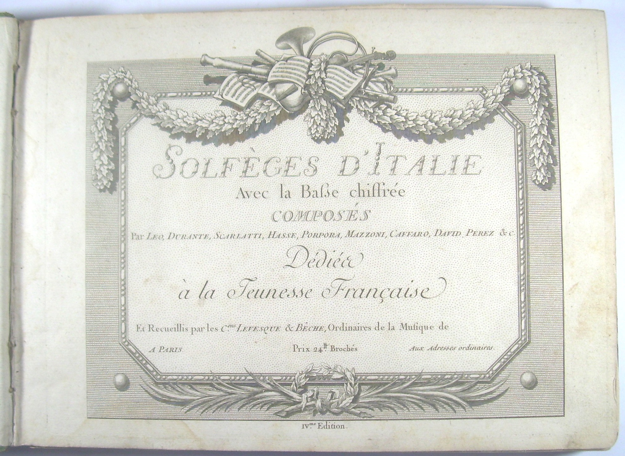Solfèges d'Italie. Avec la Basse chiffrée. Composés Par Leo, Durante, Scarlatti, Hasse, Porpora, Mazzoni, Caffaro, David Perez & c. Dédiè à la Jeunesse Francaise Et Recueillis par les C[itoy]ens Levesque & Bêche. IVme Édition.