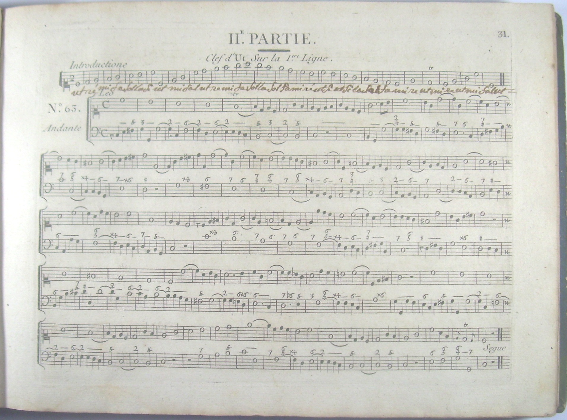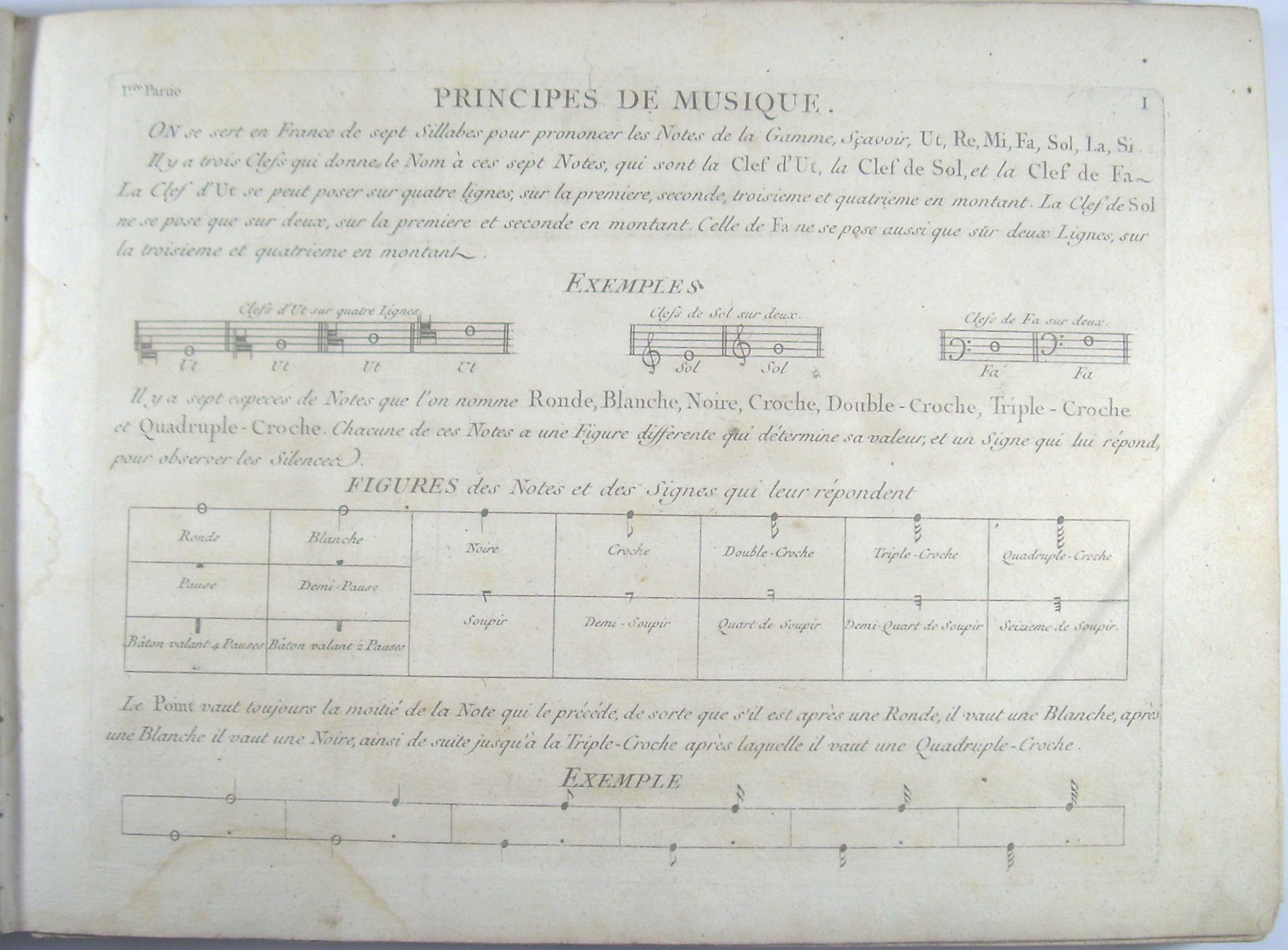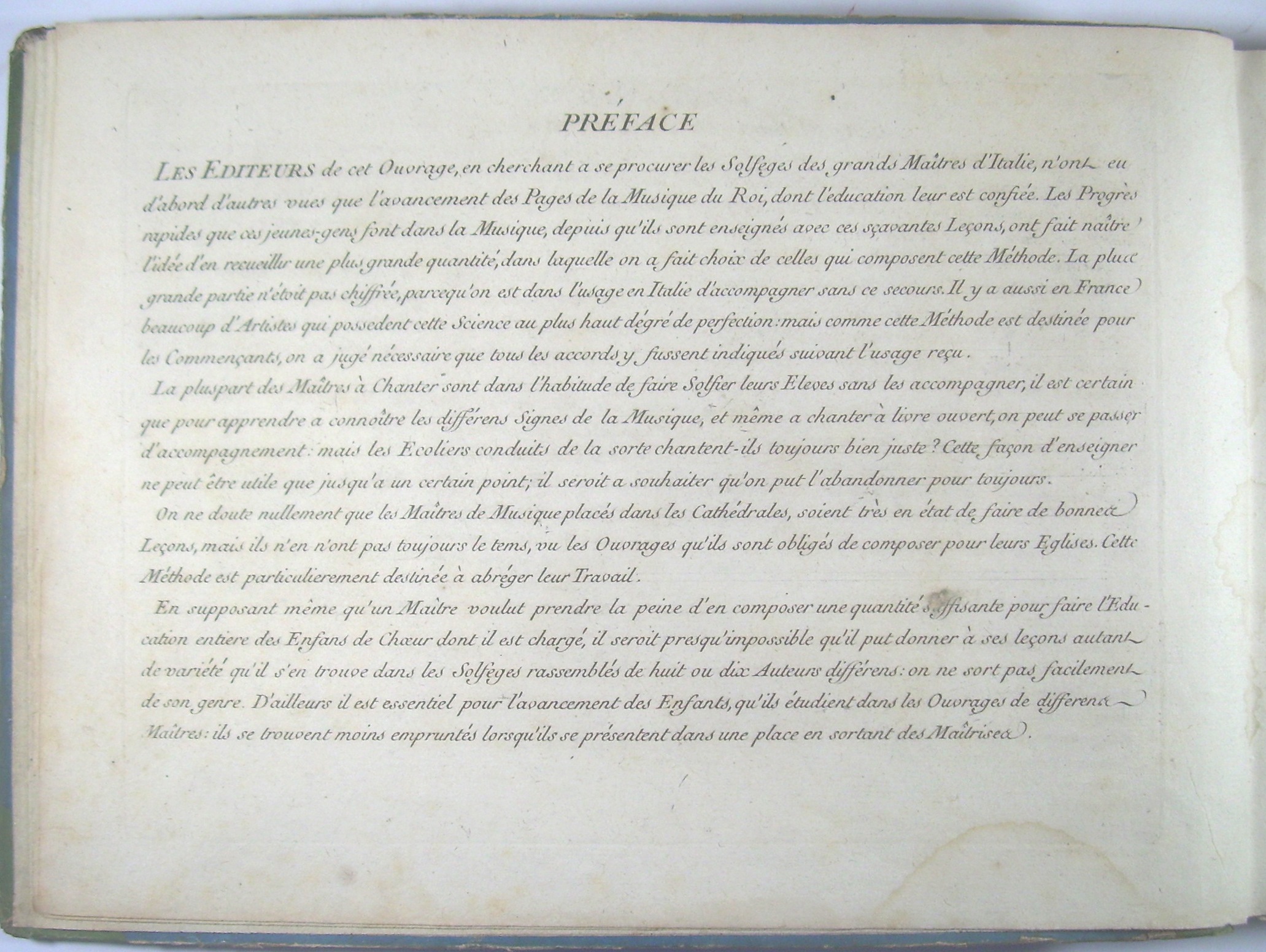 Wichtige, häufig aufgelegte Solfèg-Gesangsschule, hier in der 4. Auflage, in der zahlreiche Stücke nun im moderneren Violinschlüssel stehen, und alte "scholastisch"-langweilige Stücke durch Kompositionen des "célèbre Hasse" ersetzt wurden. Diese 4. Auflage hier in einem etwas späteren Druck aus der Revolutionszeit: ein erster Druck der 4. Auflage war bei Cousineau noch vor der Revolution erschienen, mit königlichem Privileg und den adeligen Titeln. Hier die "revolutionäre" Ausgabe mit entsprechender Anpassung des Titelblattes: statt der "Sieurs" die Abkürzung für "Citoyens" und ohne Hinweis auf die Chambre du Roi.. Bei aller revolutionärer Camouflage ist den Zensoren aber der Hinweis im Preface entgangen, der das Werk besonders für das "avancement des Pages de la Musique du Roi" empfiehlt. - Vollständig mit allen 4 Teilen, Teil 1-3 mit 241 Gesangsstücken für 1 Stimme und Generalbass, Teil 4 mit 12 3-sätzigen Duos von Perez.