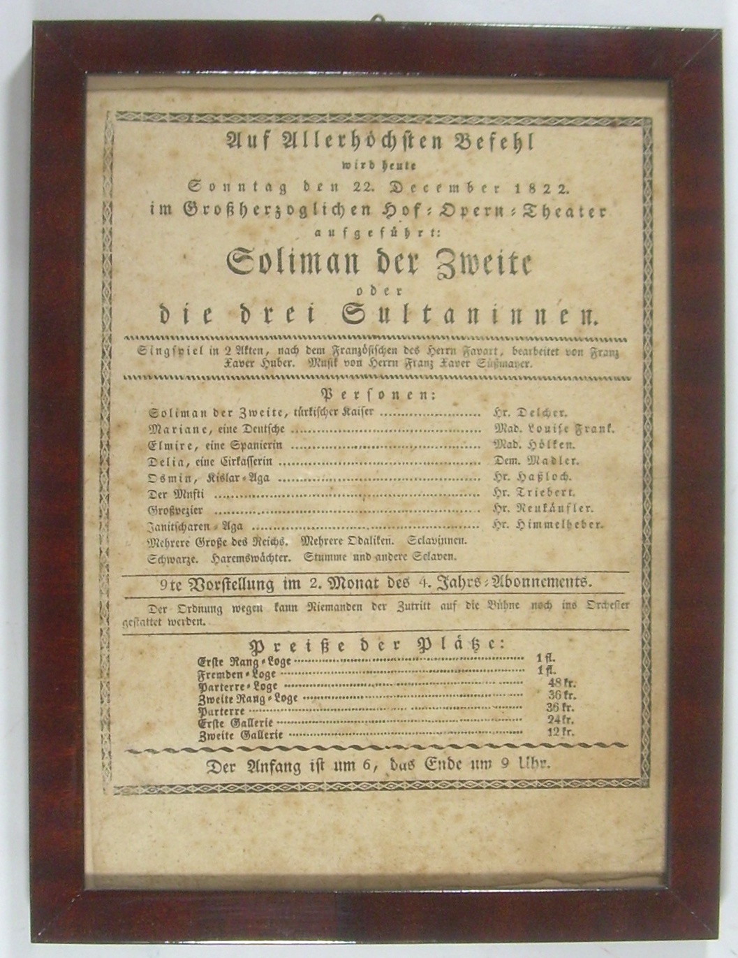 "Singspiel in 2 Akten, nach dem Französischen des Herrn Favart, bearbeitet von Franz Xaver Huber. Musik von Herrn Franz Xaver Süßmayer [sic.]". - Louise Franck (1780-1851), die die "Mariane" sang, war bis 1830 Ensemblemitglied des Hoftheaters Darmsdtadt. - Franz Xaver Süßmayr (1766-1803), Schüler von Antonio Salieri und Mozart, dessen Requiem er im Auftrag von der Witwe Constanze Mozart fertigstellte. Ab 1792 Dirigent am Nationaltheater und ab 1794 Kapellmeisteradjunkt von Joseph Weigl am Kärntnertortheater. Sein "Soliman der Zweite" wurde 1799 uraufgeführt und hielt sich - wie der Theaterzettel aus Darmstadt zeigt - lange auf dem Spielplan der deutschen Bühnen.